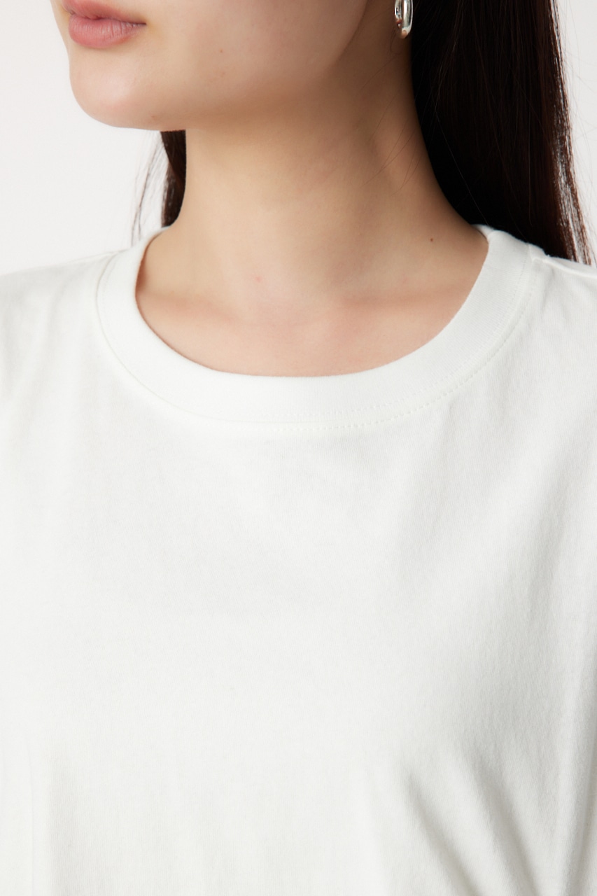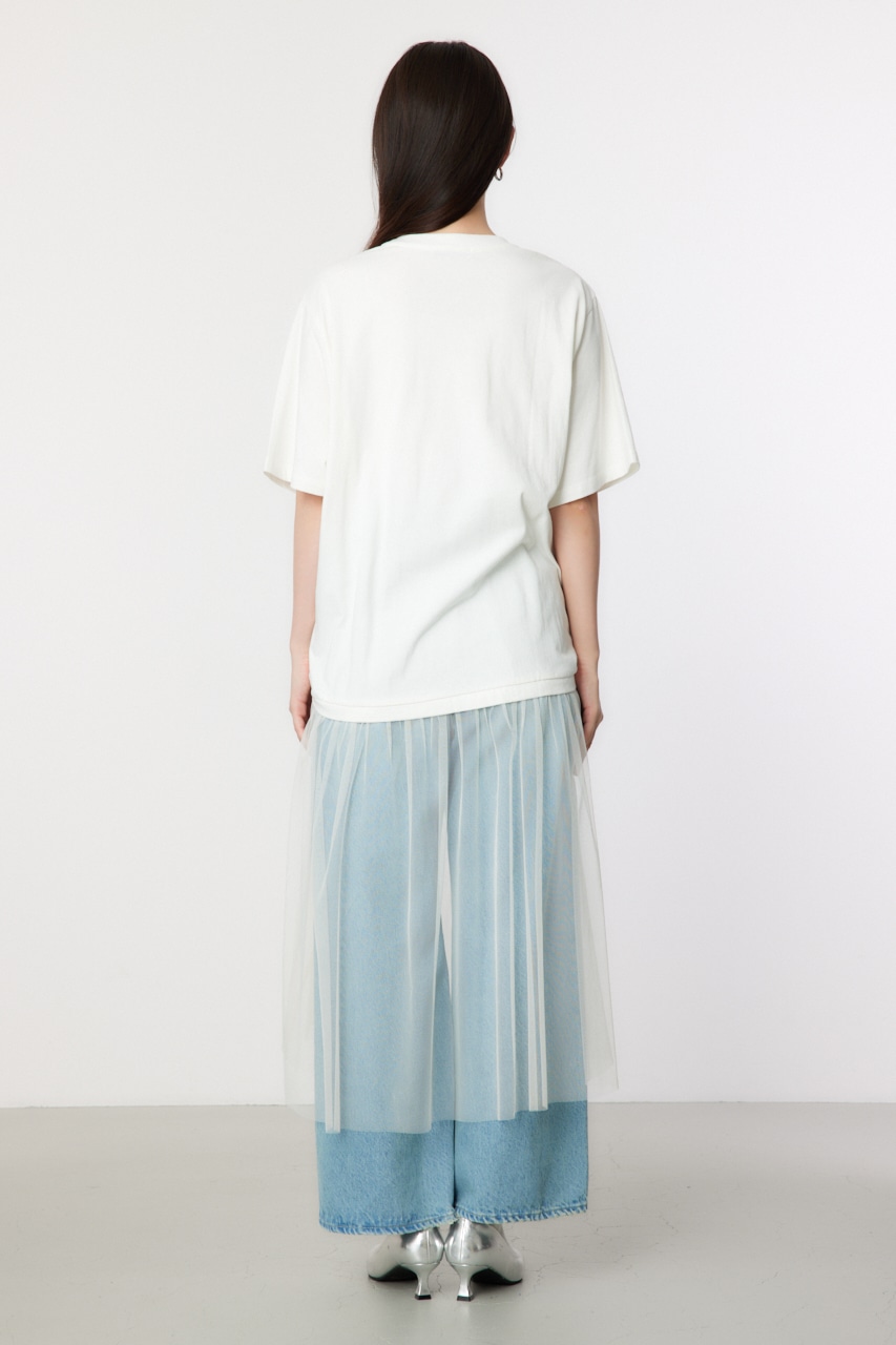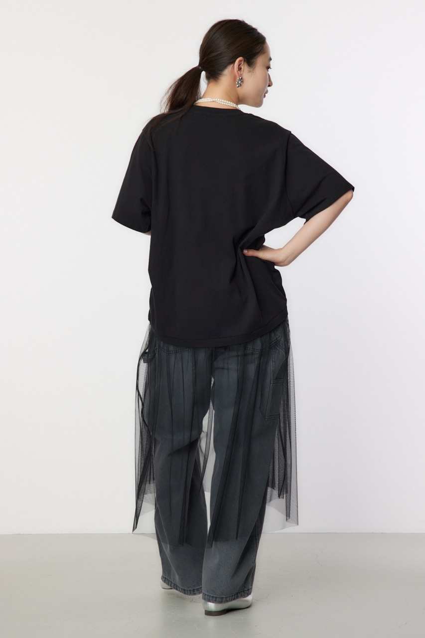 ギャザー仕様のビッグTシャツにチュールをドッキングしたデザインワンピース。Tシャツのギャザーを絞ると、前が上がり前後差があるようなサイズ感に。ボトムにはデニムを合わせるのがおすすめ。