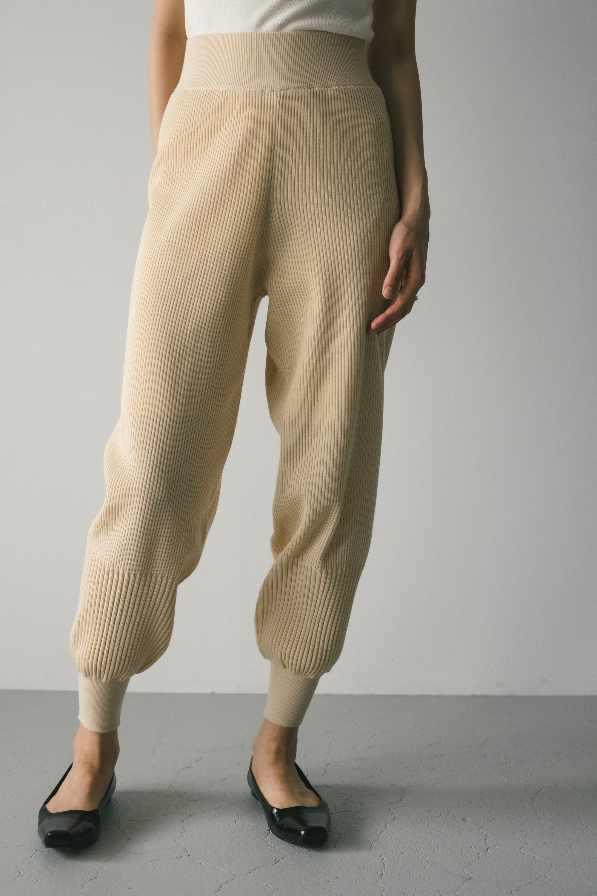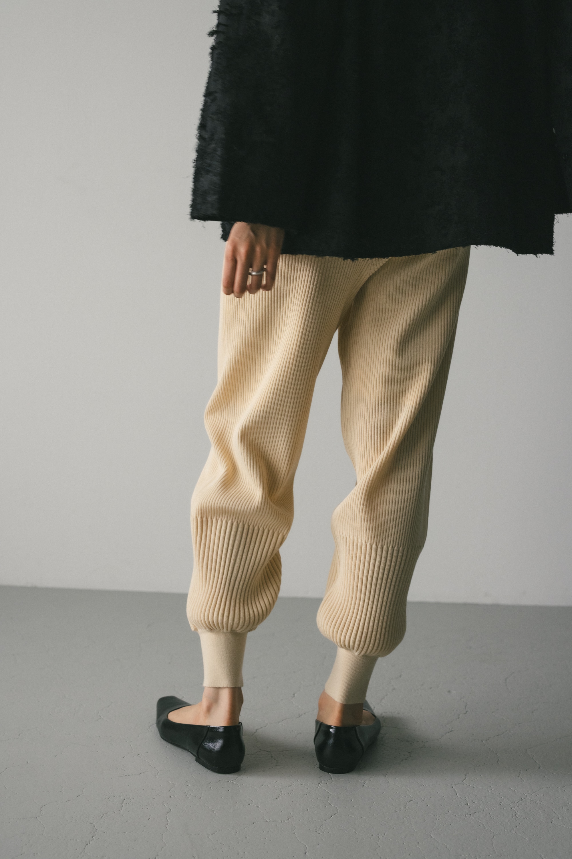 ドライな質感でモードな印象もありつつも、やや光沢感のある上品な糸を使用したニットジョガーパンツ。