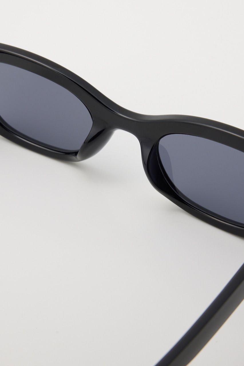 横に細長いトレンディなアイウェアは一気にクールに仕上げてくれるお助けアイテム。
