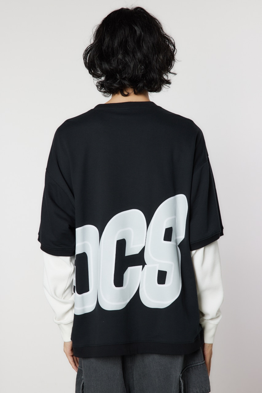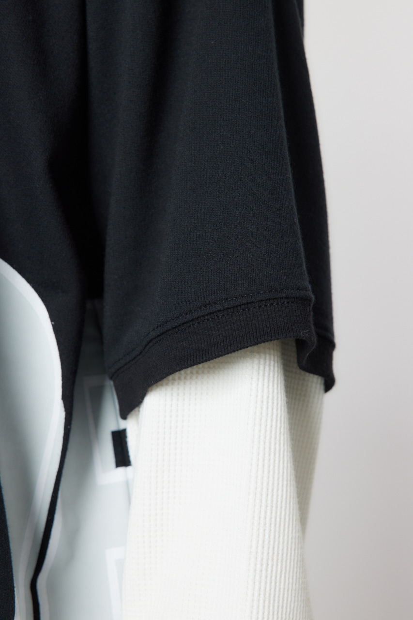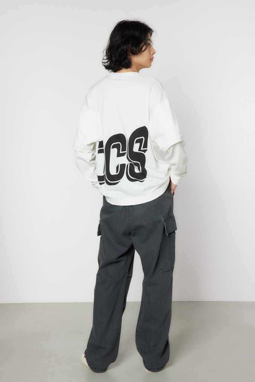 ミニ裏毛の半袖Tシャツとワッフル素材のロンTを重ね着したかのようなフェイクレイヤード仕様のトップス。大胆な配置のビッグロゴプリントが目を惹き、着用するだけでこなれたコーディネートが完成します。
