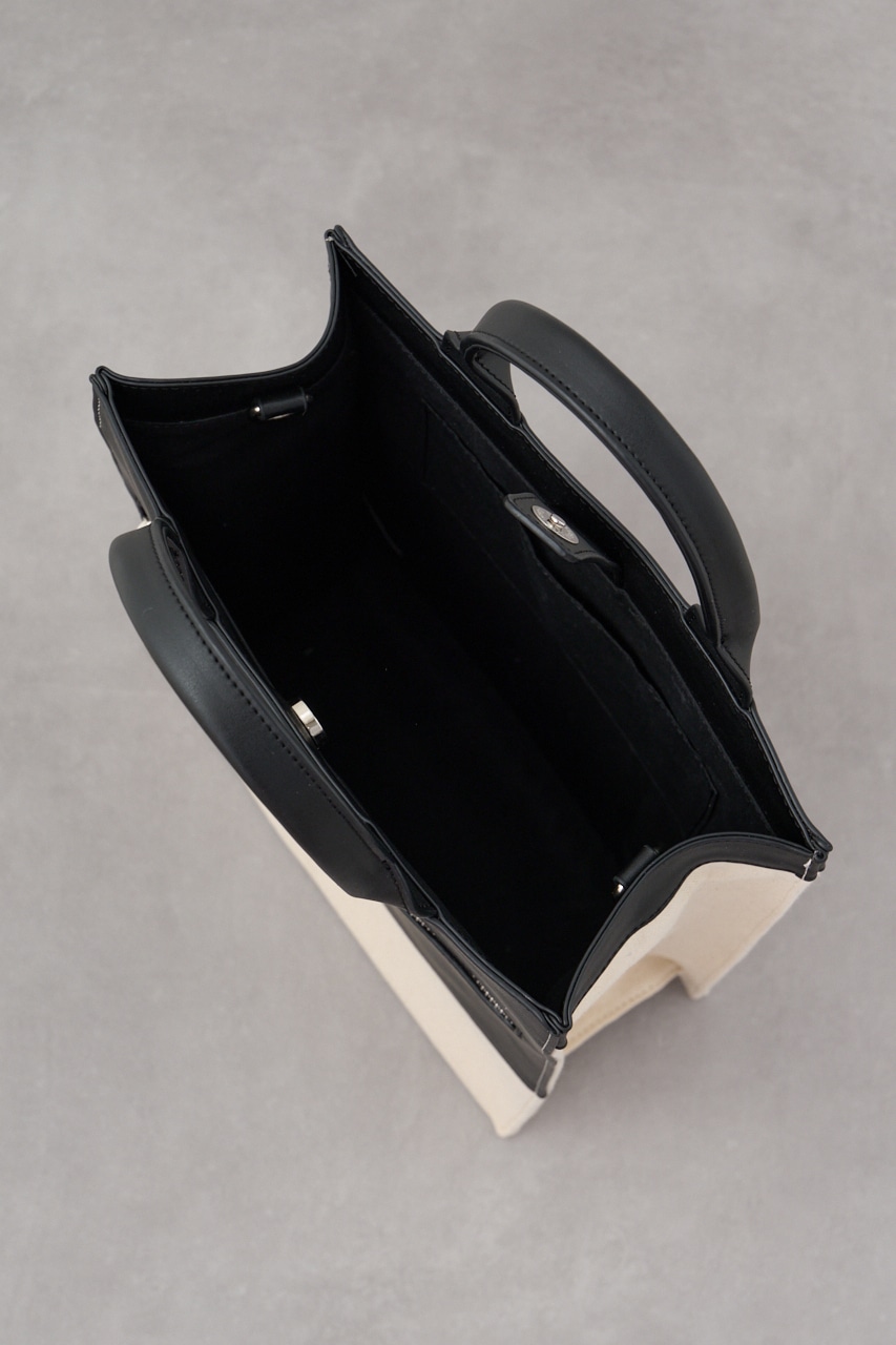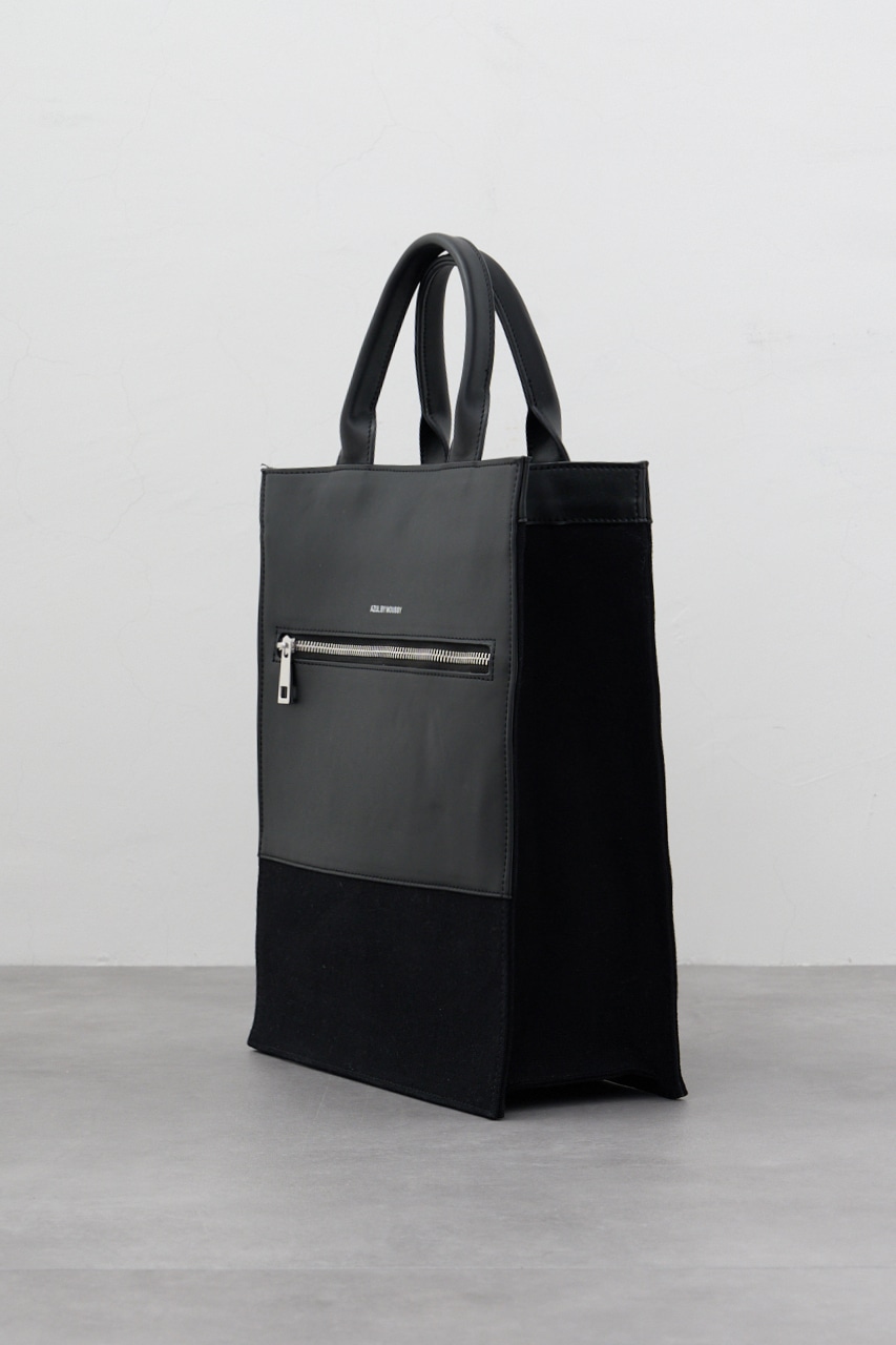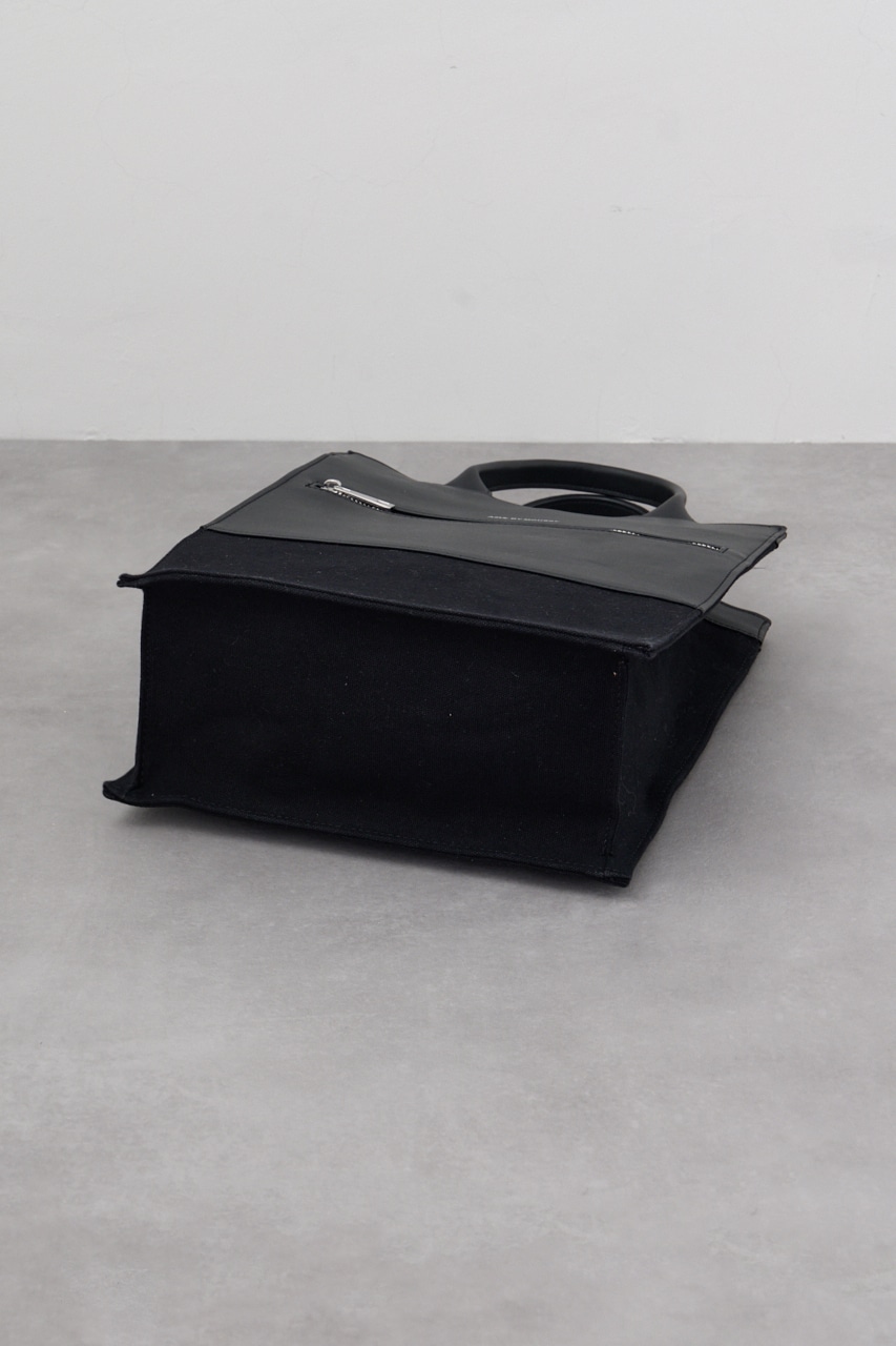 フェイクレザーとコットンの切替デザインになっているトートバッグです。