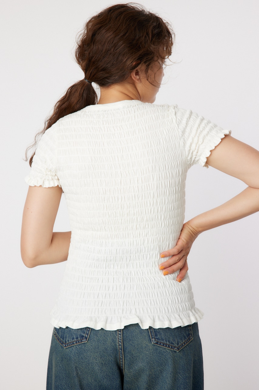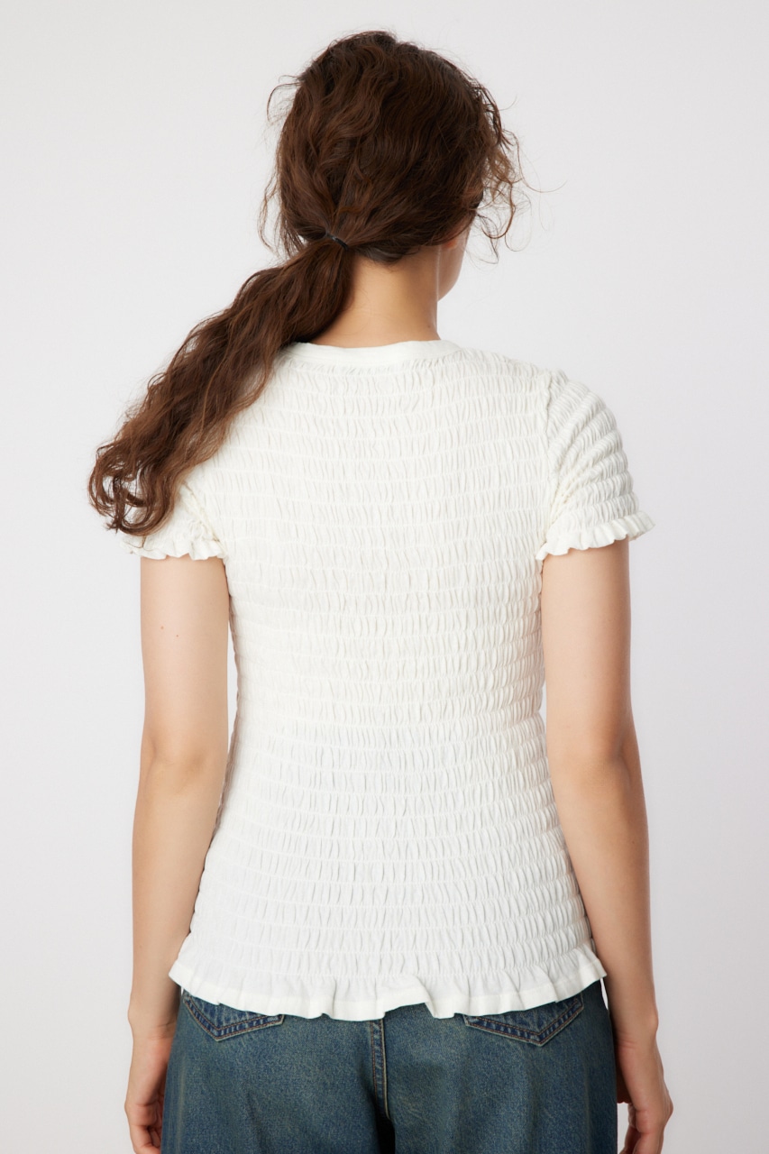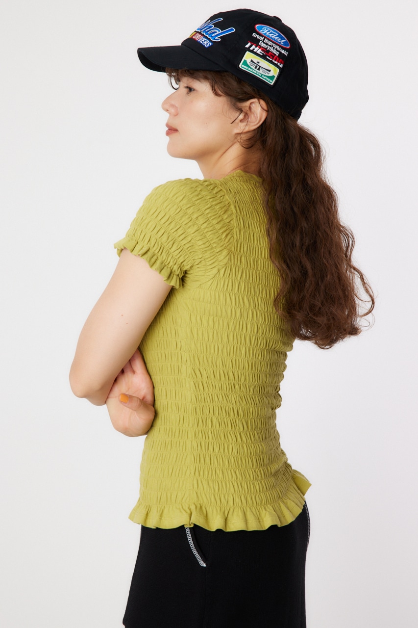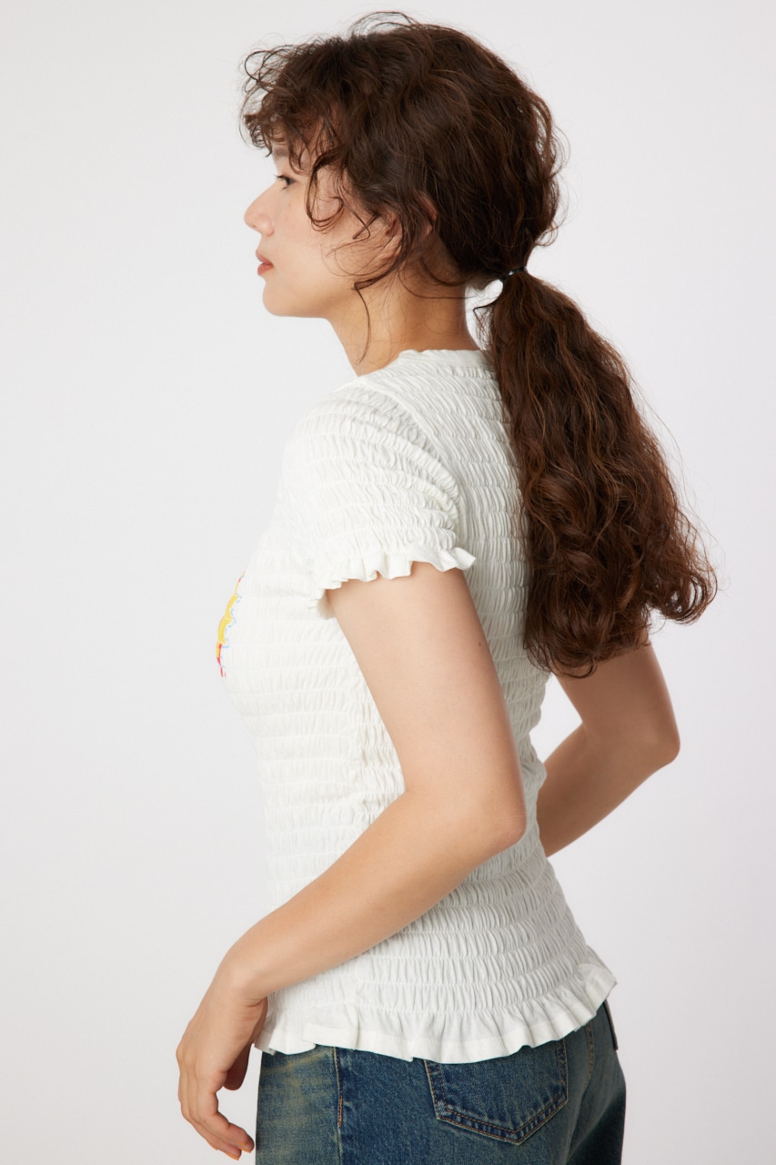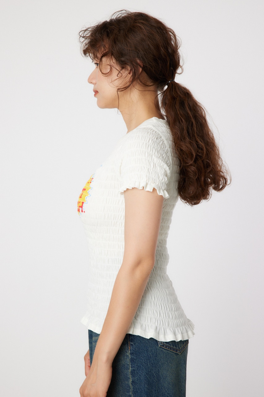 生地にシャーリング加工を施したことで、伸縮性と表面感のあるTシャツ。 柔らかな生地を使用しているので、滑らかな肌触りとストレッチ性を兼ね備えたアイテムに。カラーによって違うそれぞれ違うプリントなのもポイント。シンプルになりがちなTシャツスタイルや気分を変えたい時におすすめ。程よく体に沿うデザインなので、ワイドシルエットのパンツと相性抜群です。