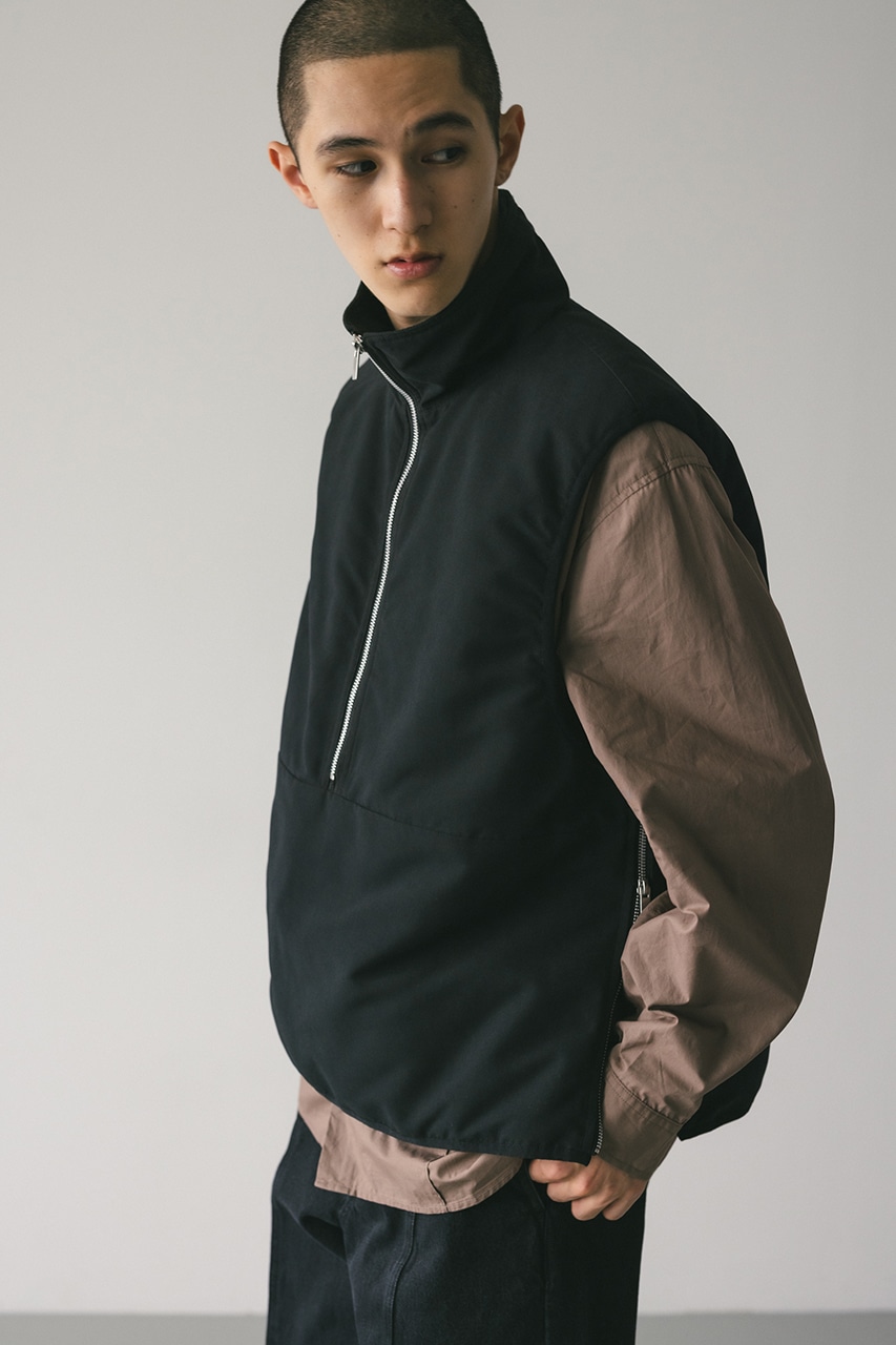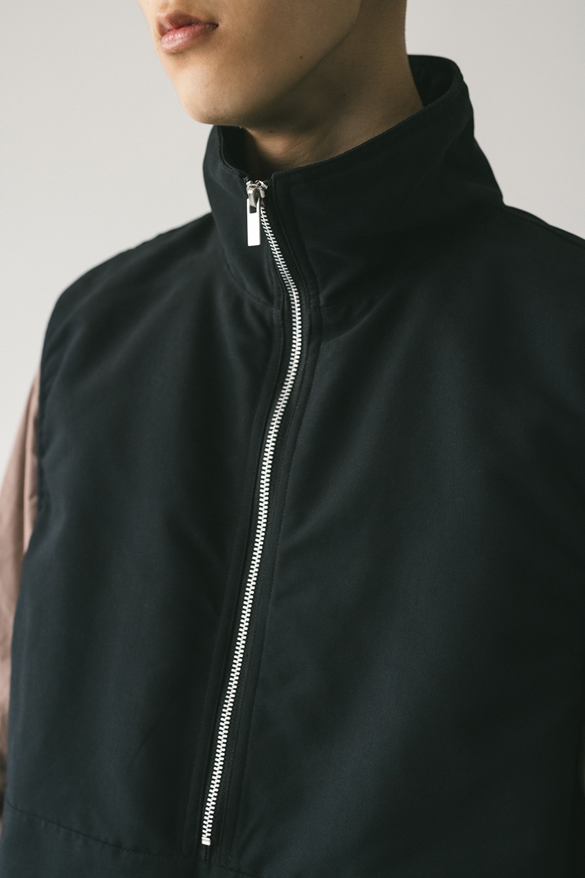 微起毛加工を施したポリエステルツイルを使用したマットジップベスト。