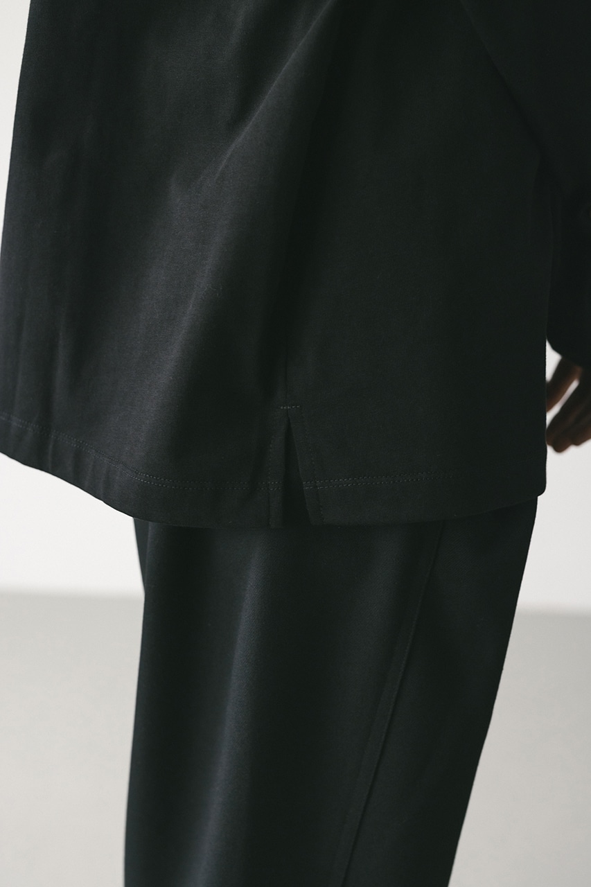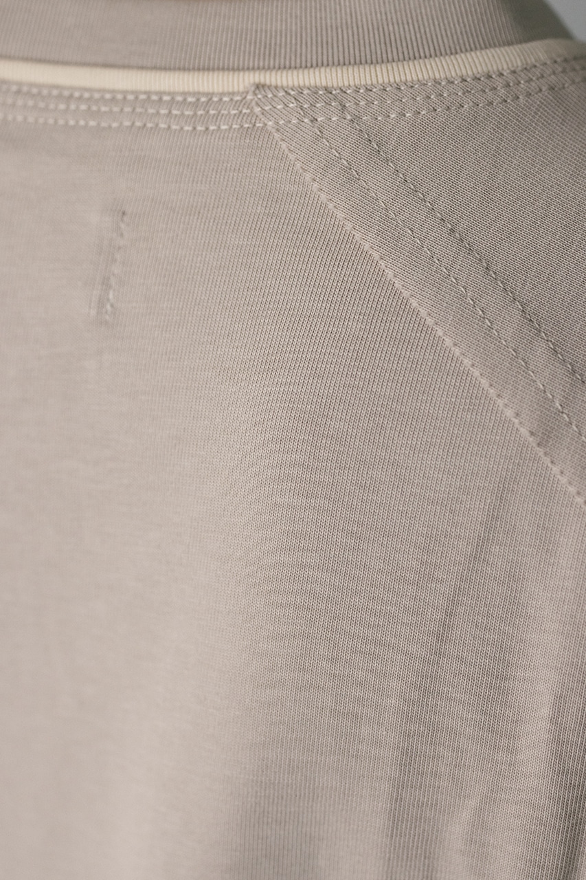 ラグランスリーブの断ち切りやネックのダブルリブがデザインポイント。