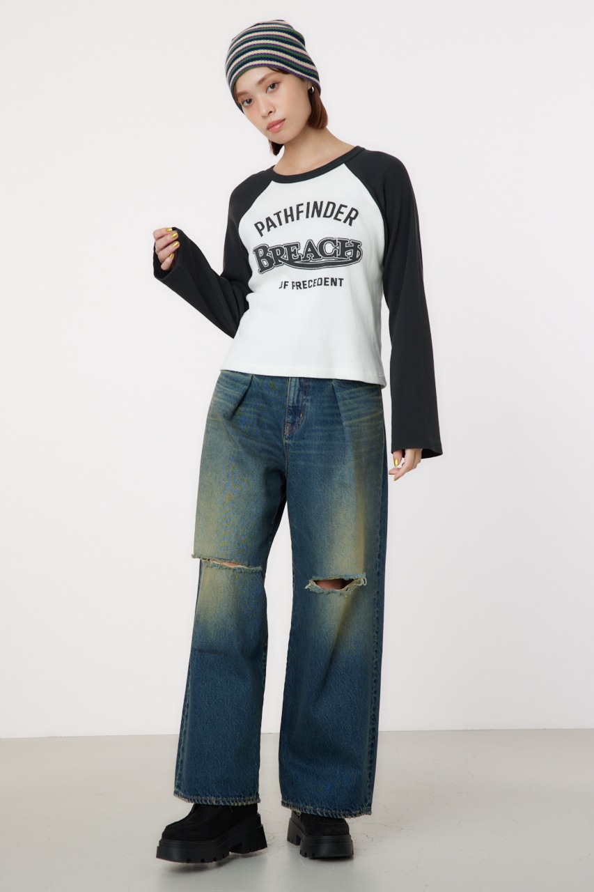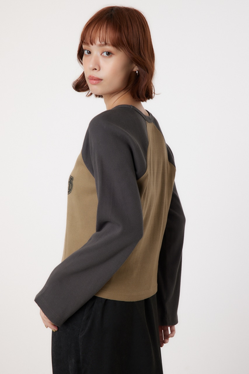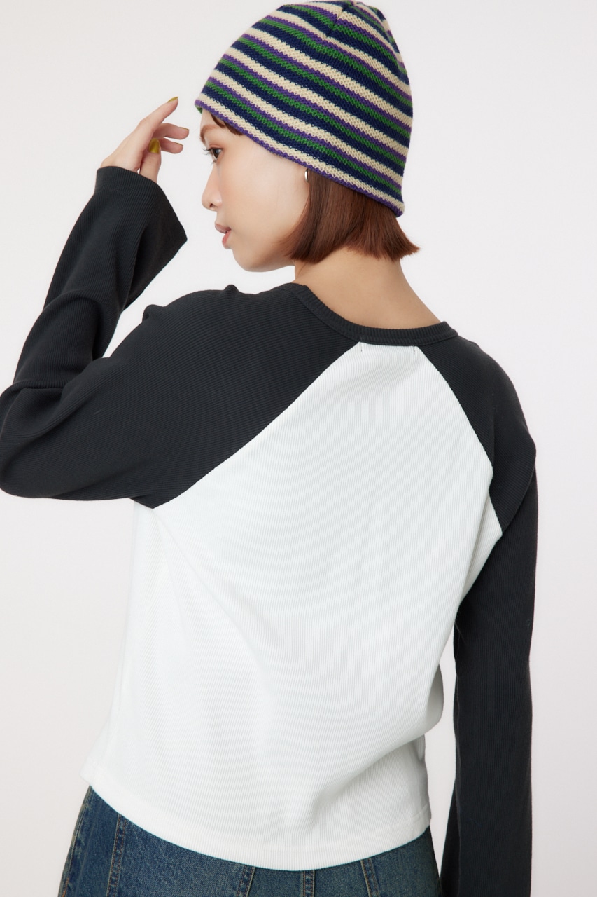 すっきりとジャストサイズで着用できるラグランロンT。伸縮性のあるカットリブ素材を使用。ヴィンテージのモーターサイクルロゴからインスパイアされたグラフィックが、90'sスタイルにぴったり。配色になっているので、コーディネートのアクセントにもなるアイテム。ヴィンテージ加工の入ったデニムやカーゴパンツなど、ボリュームのあるボトムスに合わせるのがおすすめ。