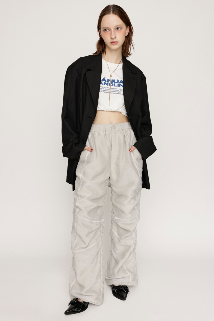 ■POINT:テープデザインを縦横に配置したシアーレイヤードパンツ。