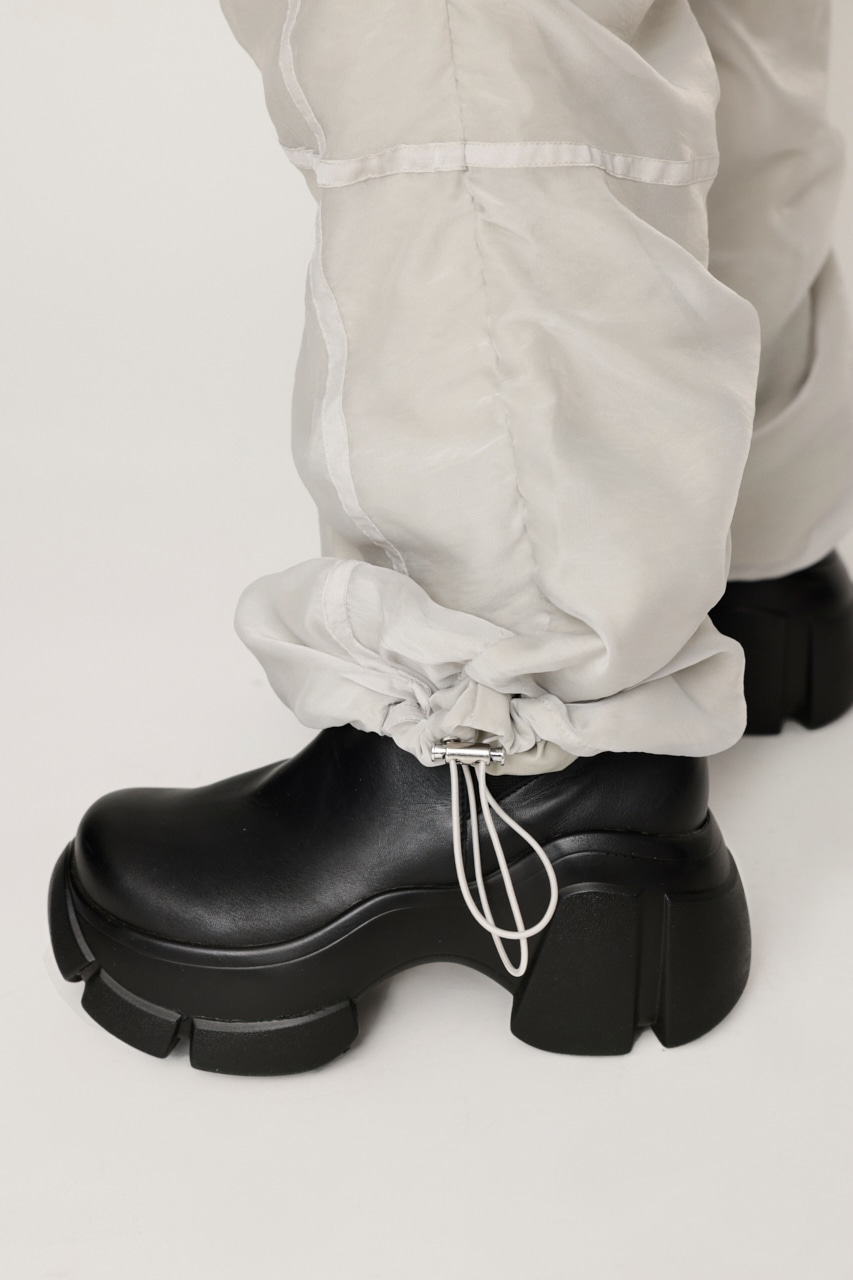 ■DETAIL:カラーの違うシアー素材をレイヤードし、程よい光沢感が上品な印象に。ウエスト部分はゴム仕様なので、長時間履いても疲れず、リラックスして着用できます。裾もゴムスピンドルで絞れるので、シルエットも変えられます。