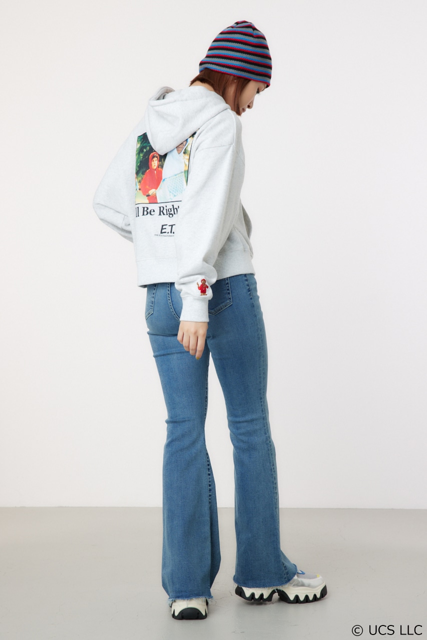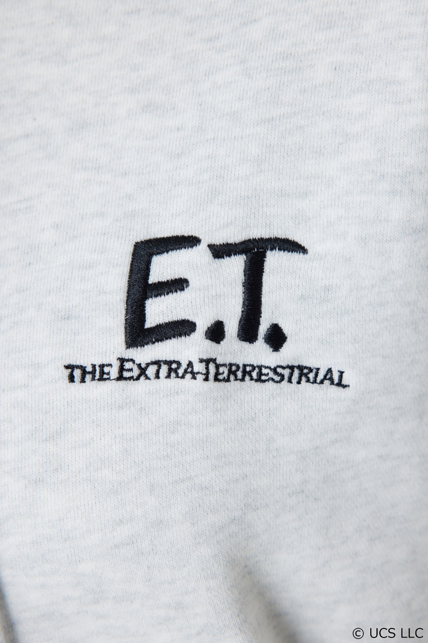 フロントにはキャッチーなE.T.ロゴの刺繍、バックには映画の名シーンのフォトプリント&E.T.のセリフ付きで、映画好きにはたまらないフードパーカー。袖にはフードパーカーを着たE.T.の刺繍を施し、遊び心のあるアイテムに。Mは短めの丈でトレンド感があり、Lはオーバーサイズでストリートなスタイリングにピッタリです。