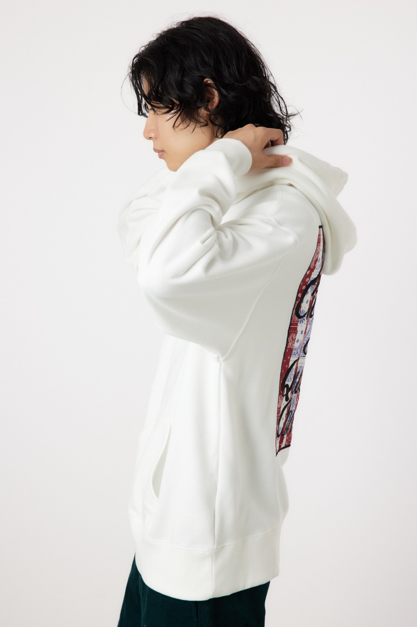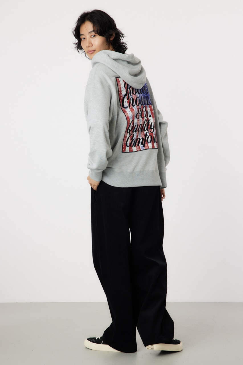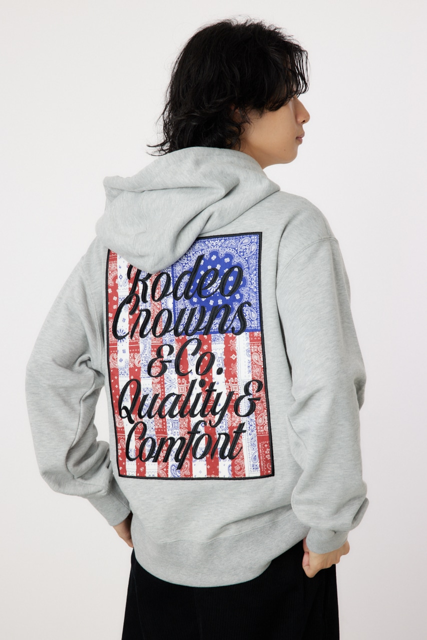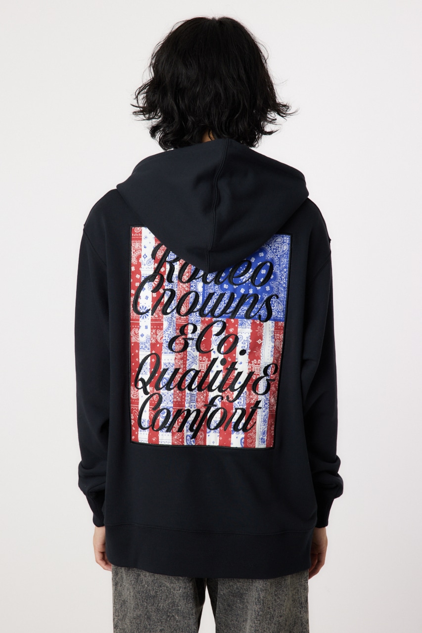 アメリカンフラッグが印象的な裏毛素材のパーカー。バンダナをミックスさせた星条旗プリントパッチにロゴ刺繍を叩き込み、手の込んだデザインに。インパクトもあり主役級のアイテムになっています。