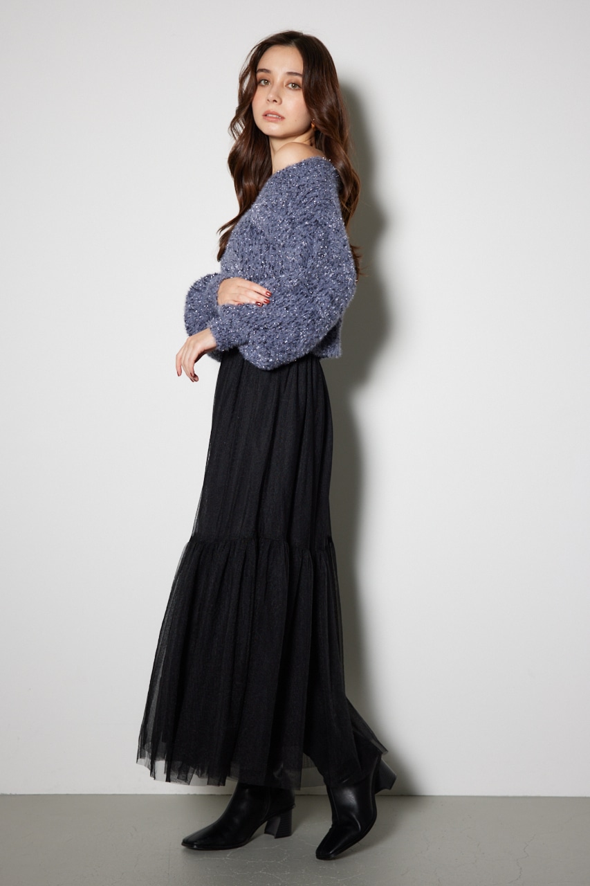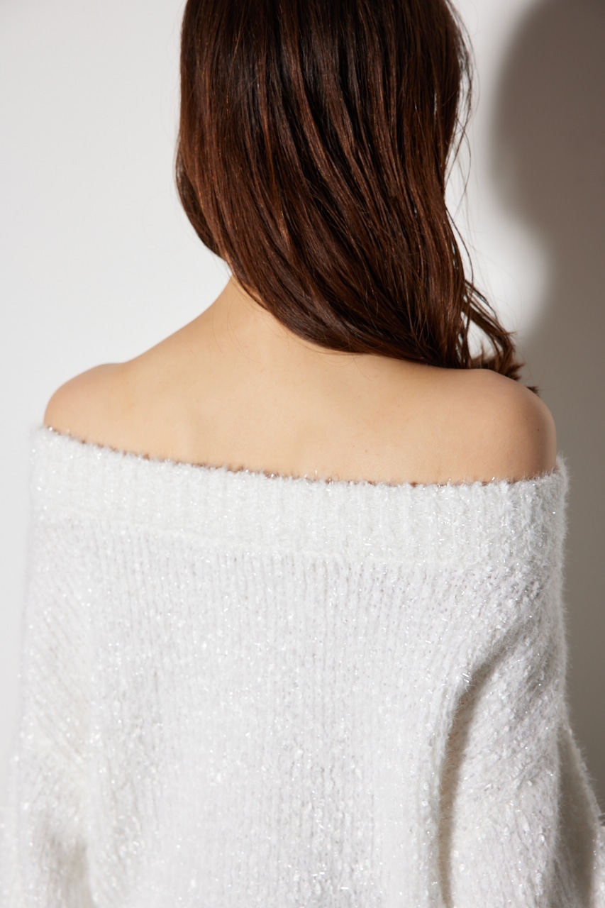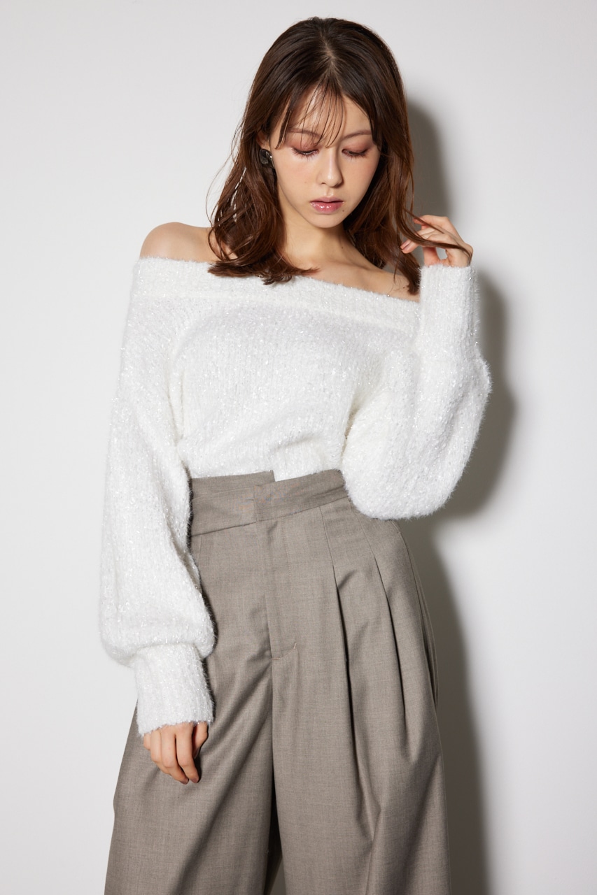 リボンヤーン、ラメ糸、ストレート糸、、様々な糸を組み合わせて繊細な輝きのニットトップスが完成しました。オフショルもセットインでも着用可能なサイズ感にしておりマルチにご利用いただけます。ぽふっとしたお袖はサイズ感も注意