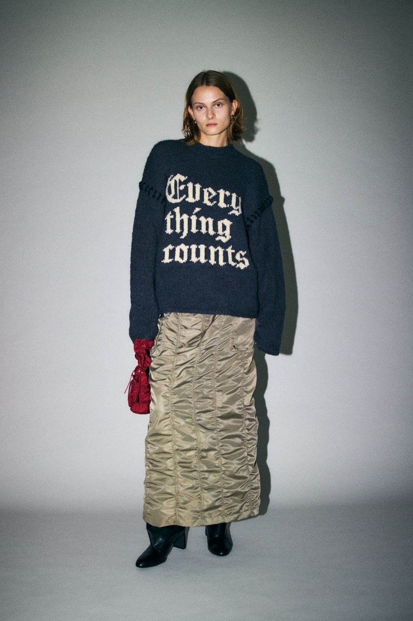 温もりのあるニットやスウェットとの組み合わせでの異素材のマッチを楽しめます。