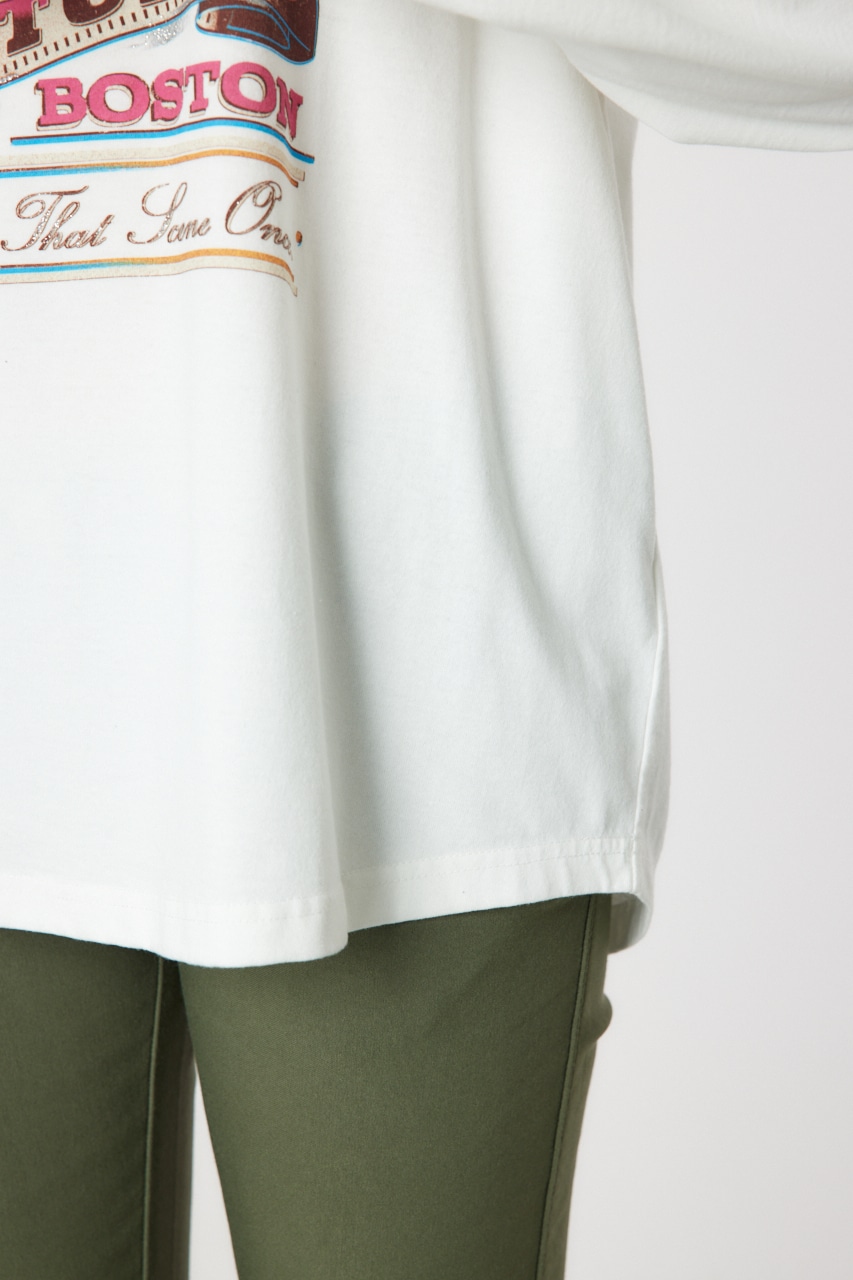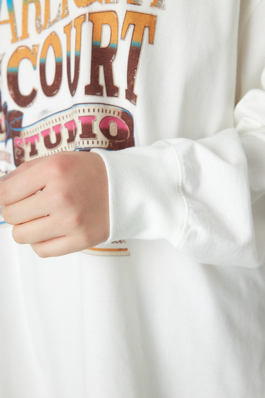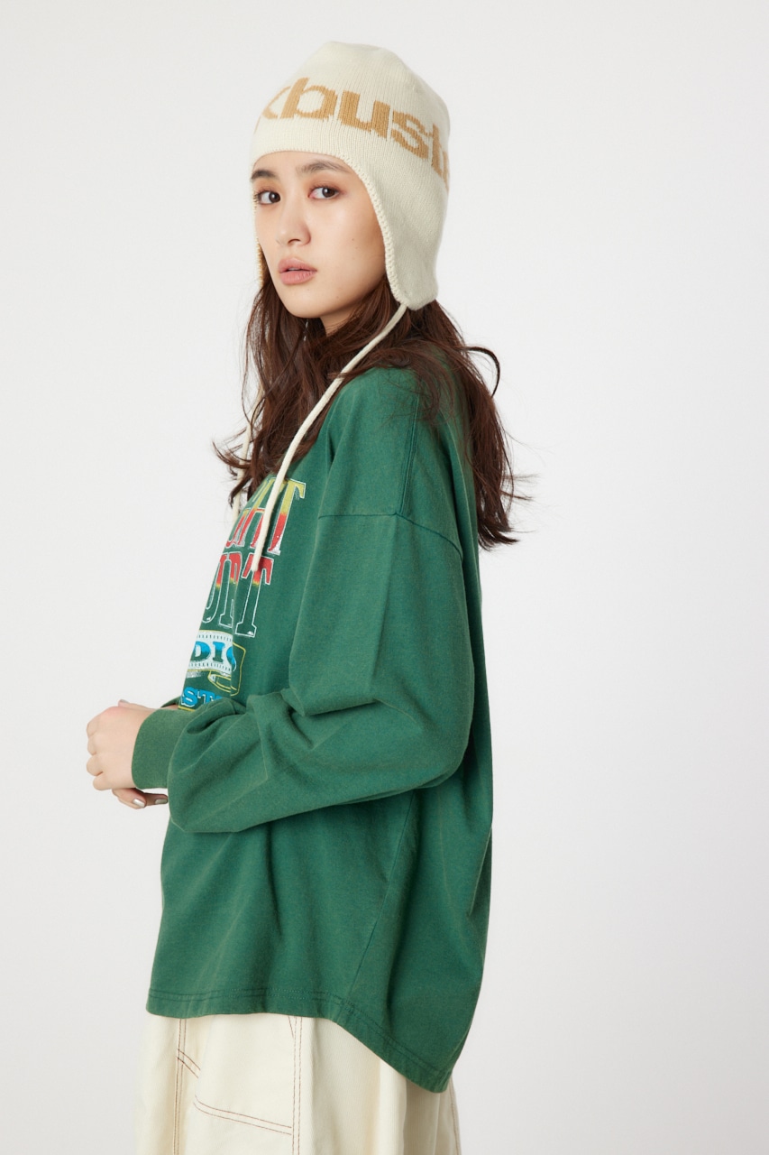 メンズライクなビッグボディーのロンT。今季のテーマをイメージした架空のフィルム制作会社をバンドT風の多色プリントで表現。今感をプラスした加工感に、ラメプリントを施したブランドらしいアイテムです。