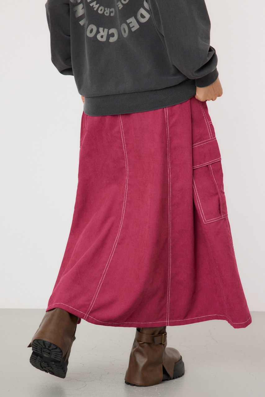 使いやすいフレアシルエットのマキシスカート。カーゴポケットと配色ステッチがポイント。コーデュロイ生地を使用しているので、取り入れるだけで季節感あるコーディネートが楽しめます。