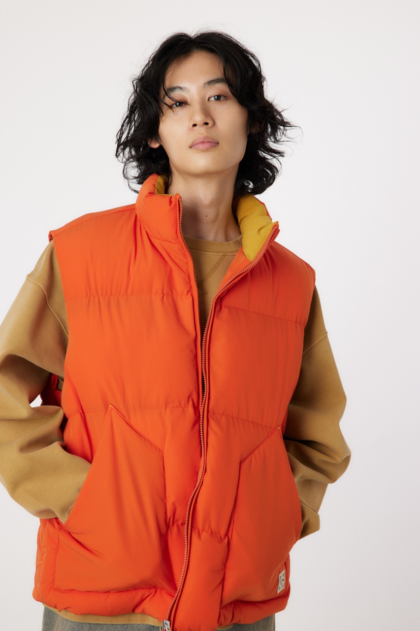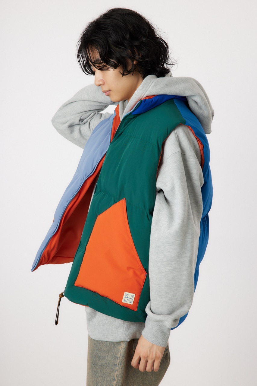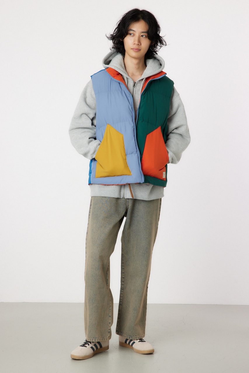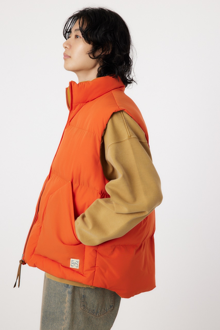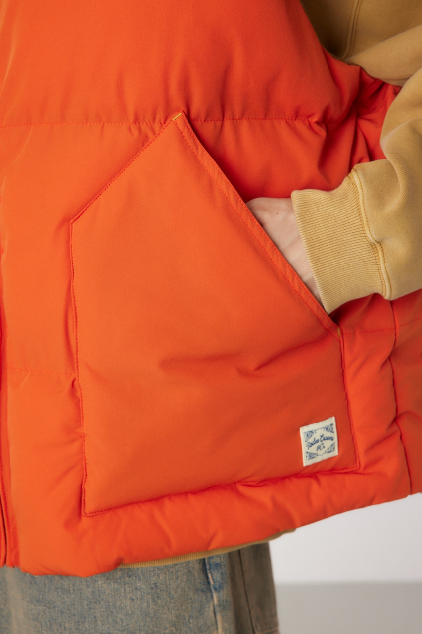 80?90年代の古着をモチーフにしたスタンドネックの中綿ベスト。どこか懐かしいカラーリングがポイントです。スタンドカラーで首元まで暖かいのが嬉しいアイテム。裾部分にゴムを施すことで、防風対策&保温効果の両方を叶えました。