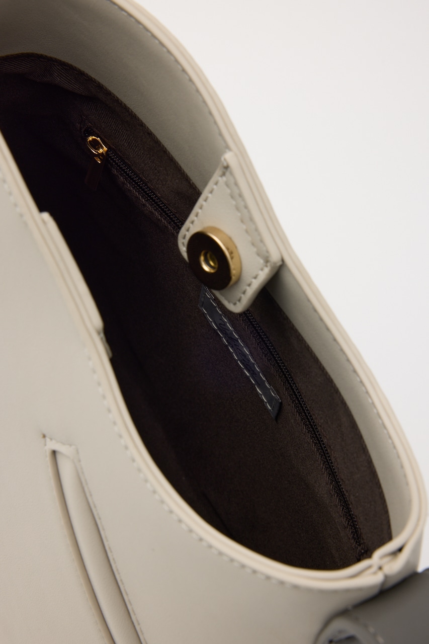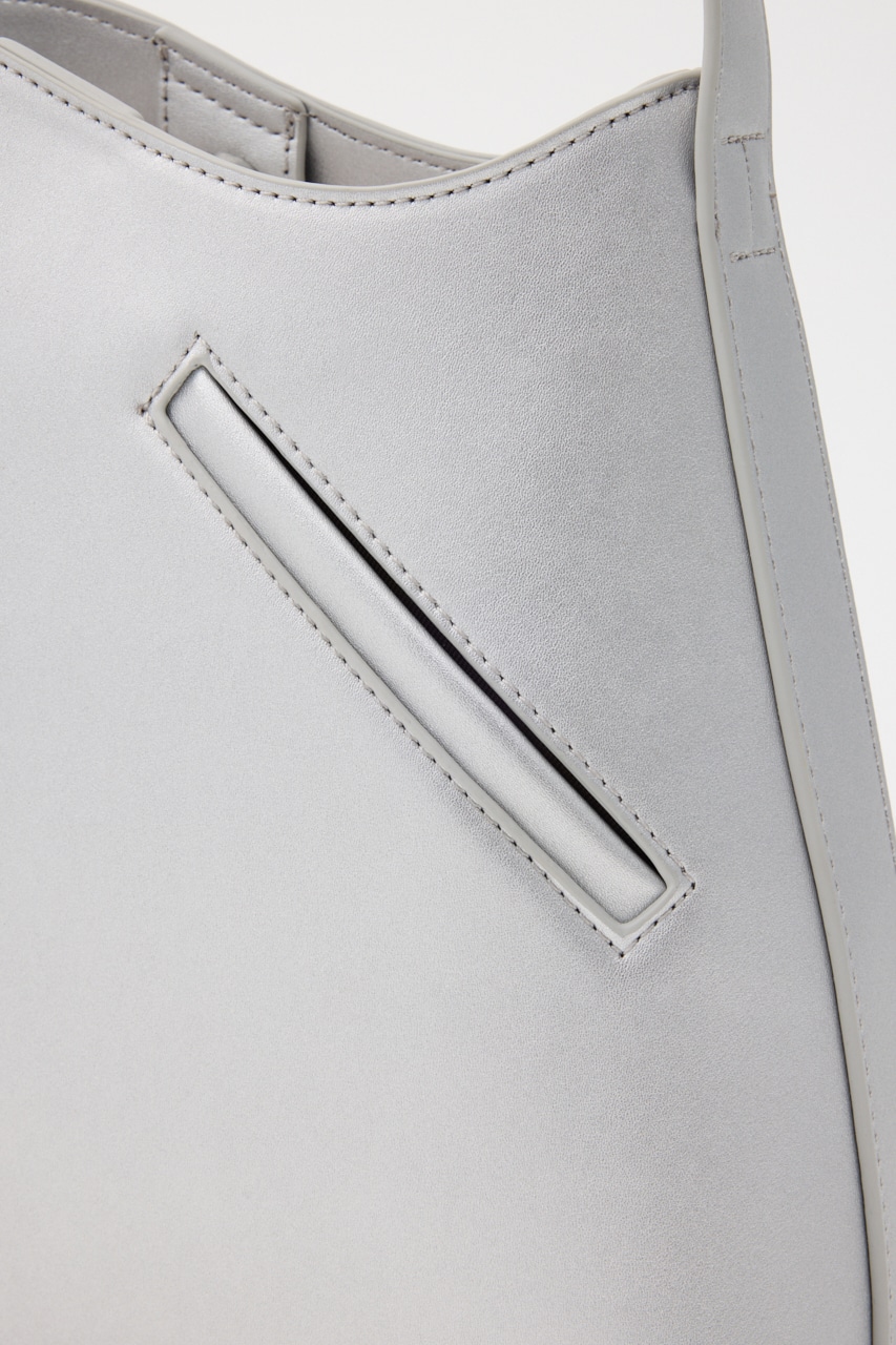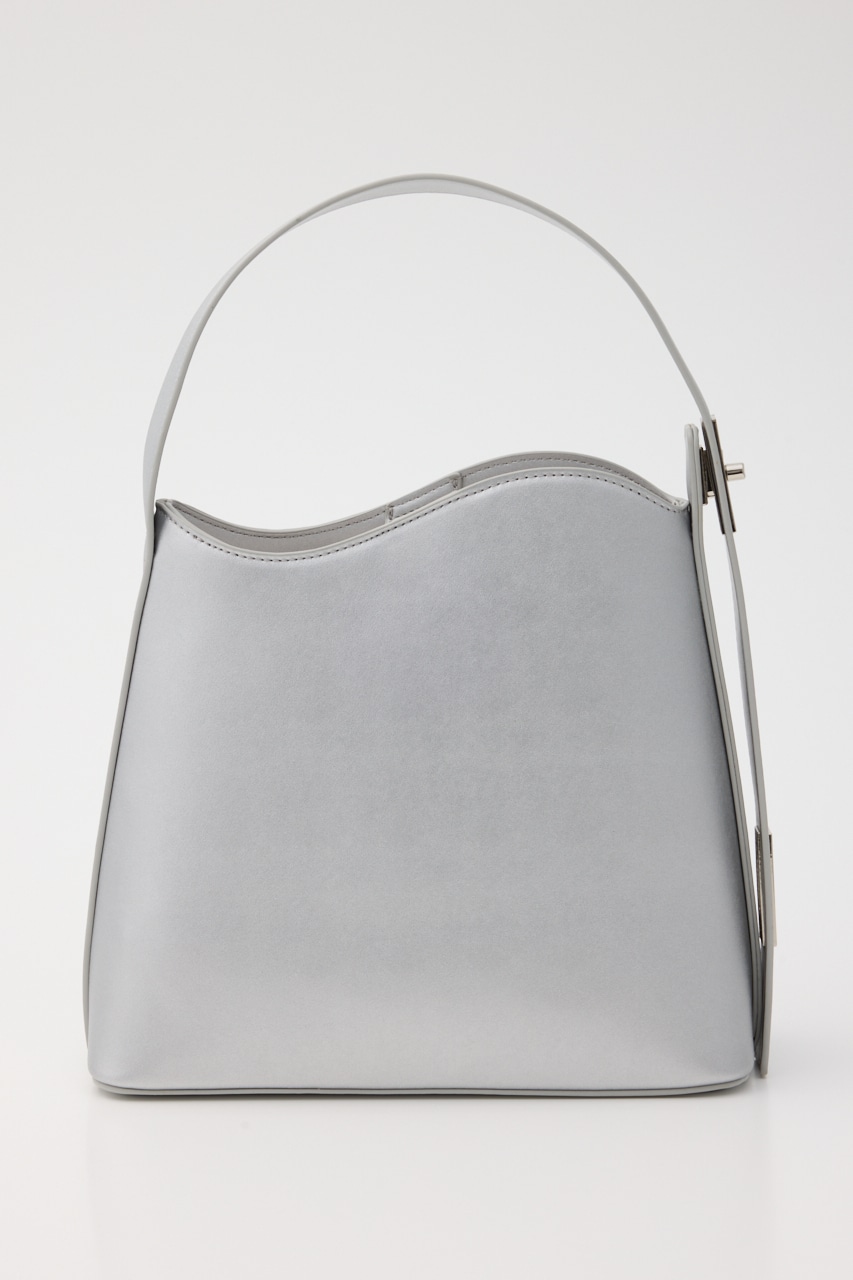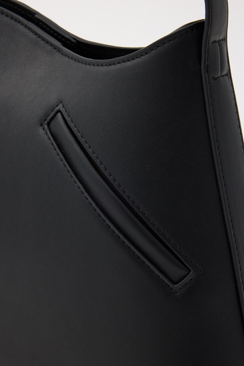 波打った口元や斜めのポケット、肩掛けショルダーのサイド金具などシンプルに見えてポイントがいっぱいのトートバッグ。