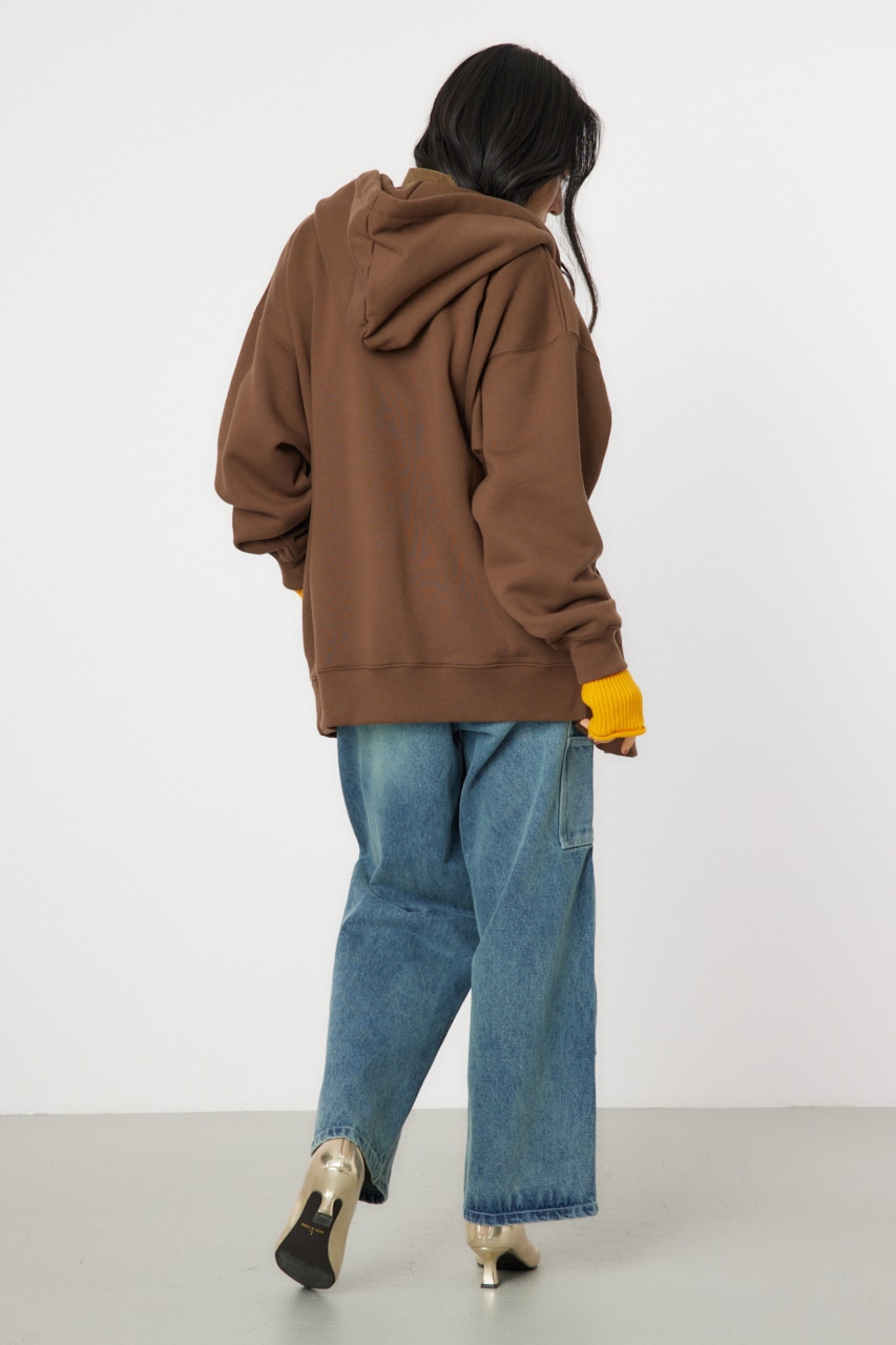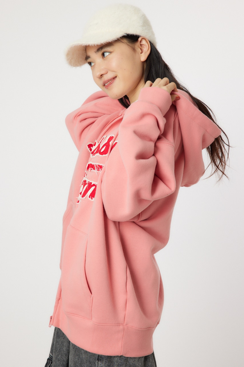フロントまたぎのデザインが可愛いジップパーカー。加工でポソポソになったロゴがポイント。裏起毛で暖かく、アウター代わりにデイリー使いできるアイテムです。