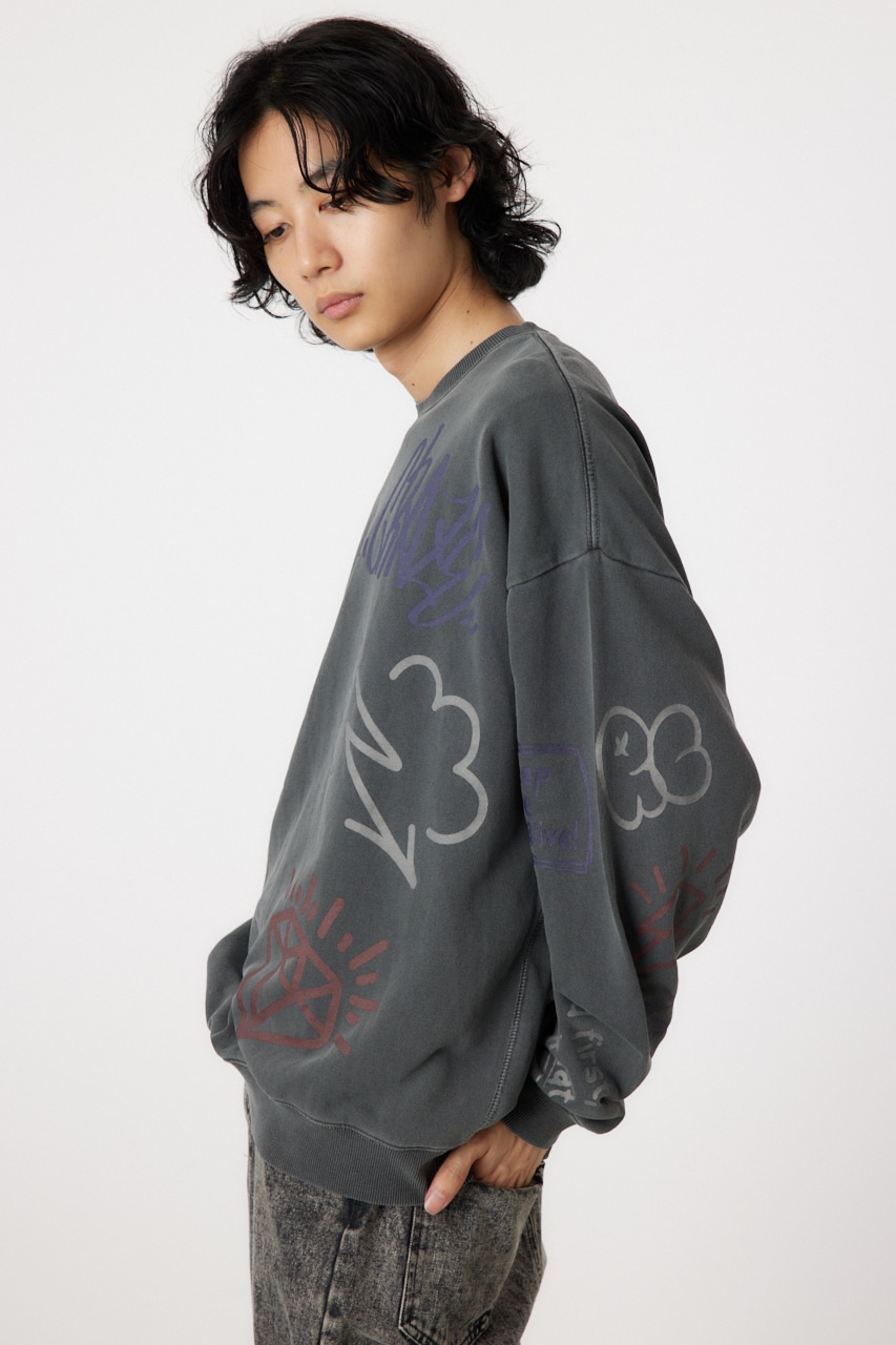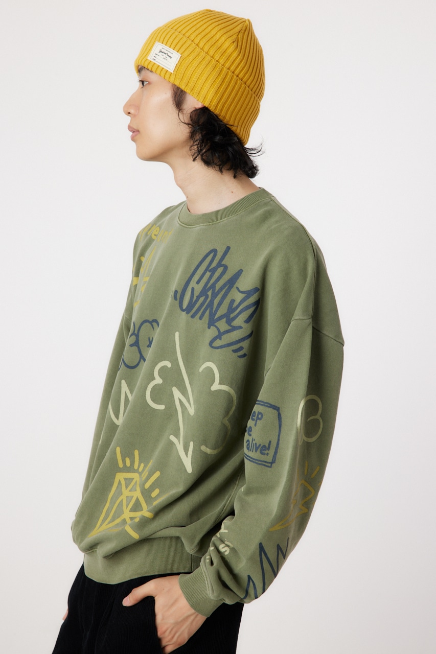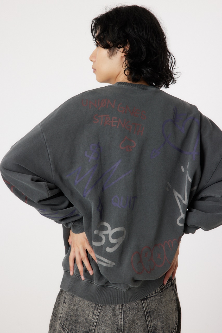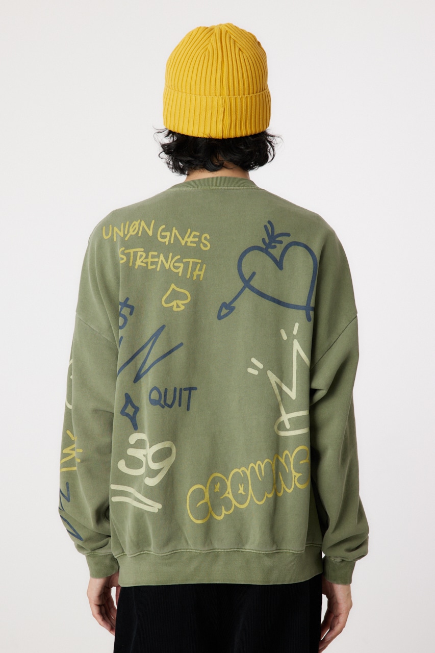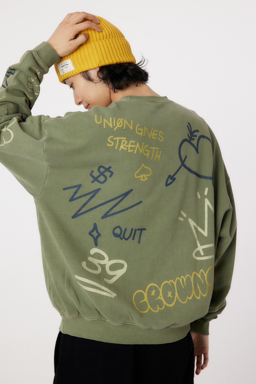 ピグメント加工で古着っぽさを表現したプルオーバースウェット。全面に入った落書き調のグラフィックがポイントで、存在感のあるアイテムです。