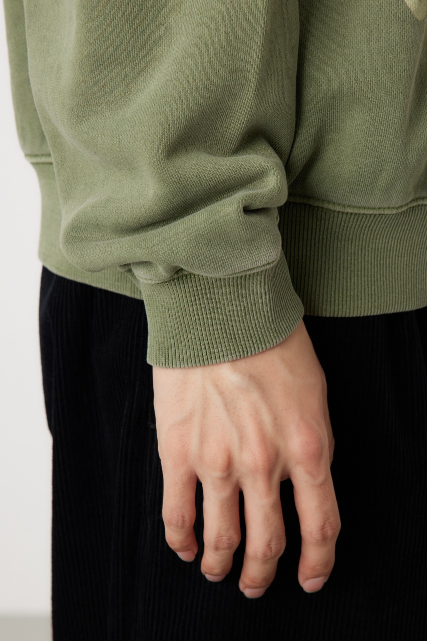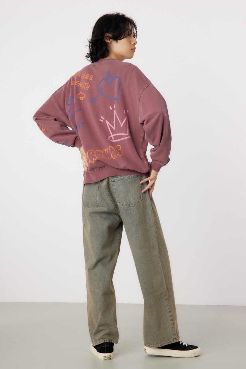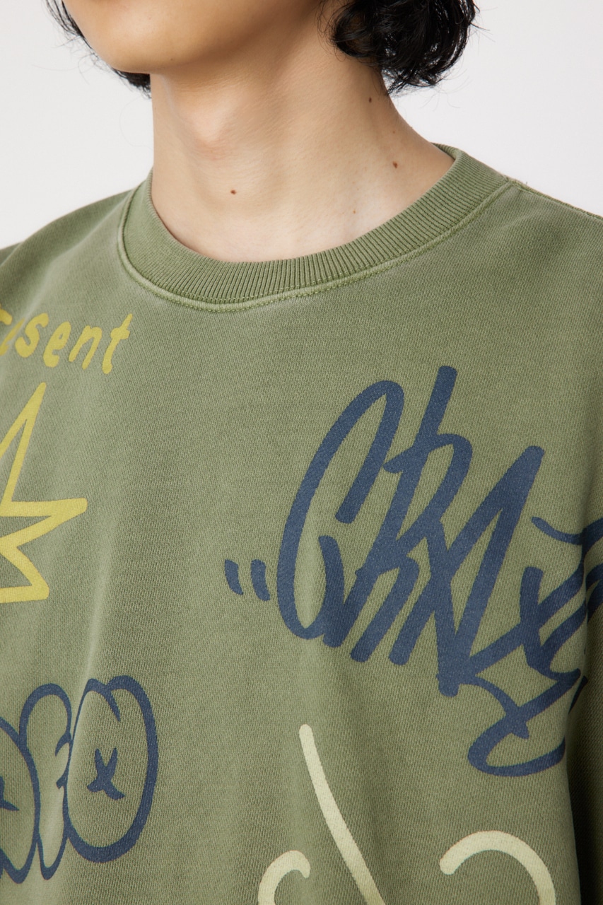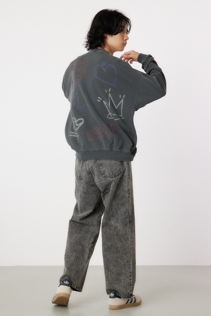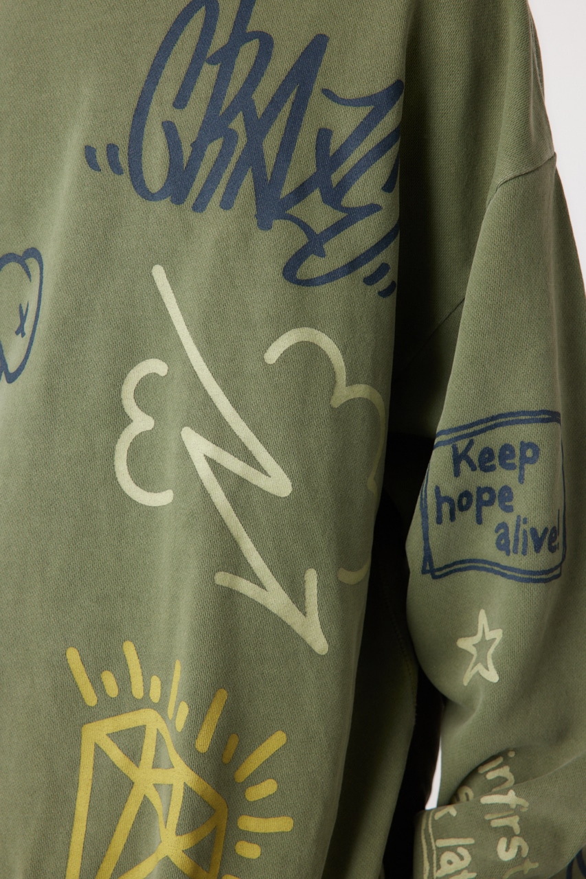 ピグメント加工で古着っぽさを表現したプルオーバースウェット。全面に入った落書き調のグラフィックがポイントで、存在感のあるアイテムです。