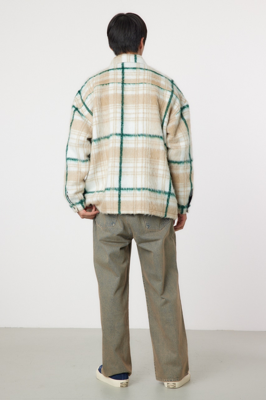 柔らかさと暖かさを感じられるシャギー素材を使用したジャケット。ベーシックカラーに差し色ラインで構成されたトレンド感のあるチェック柄を採用し、スタイリングのアクセントにもなる一枚です。