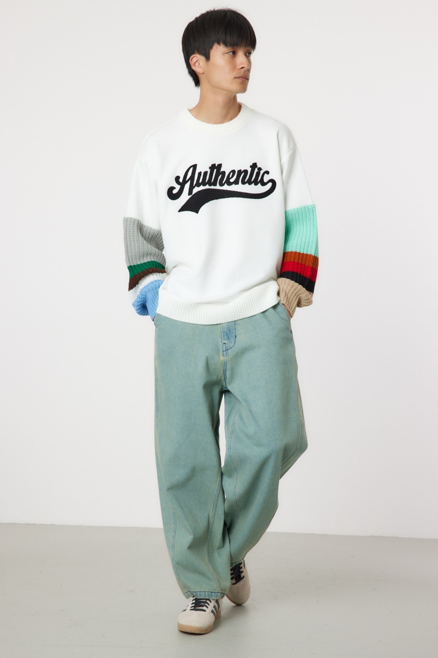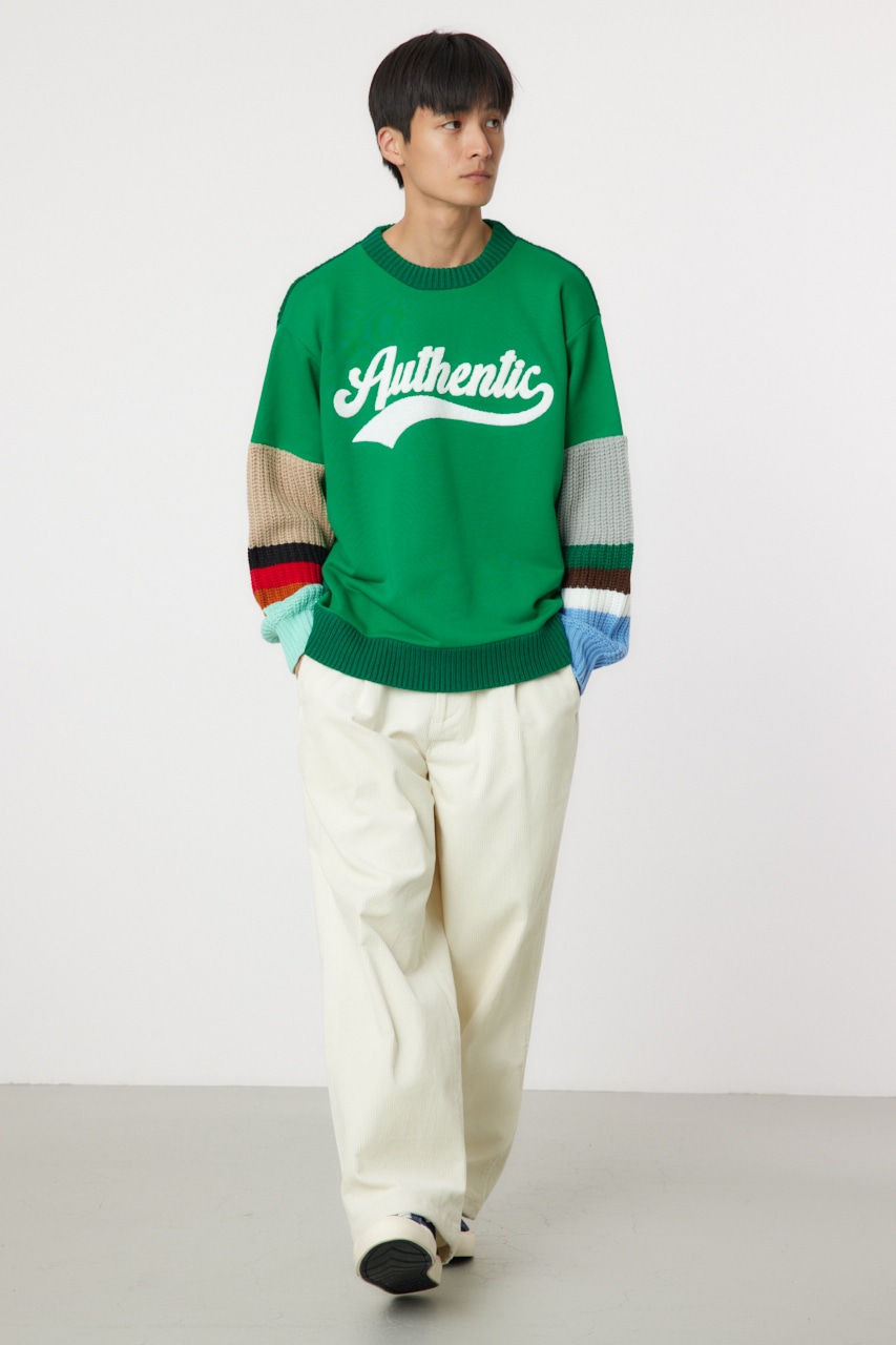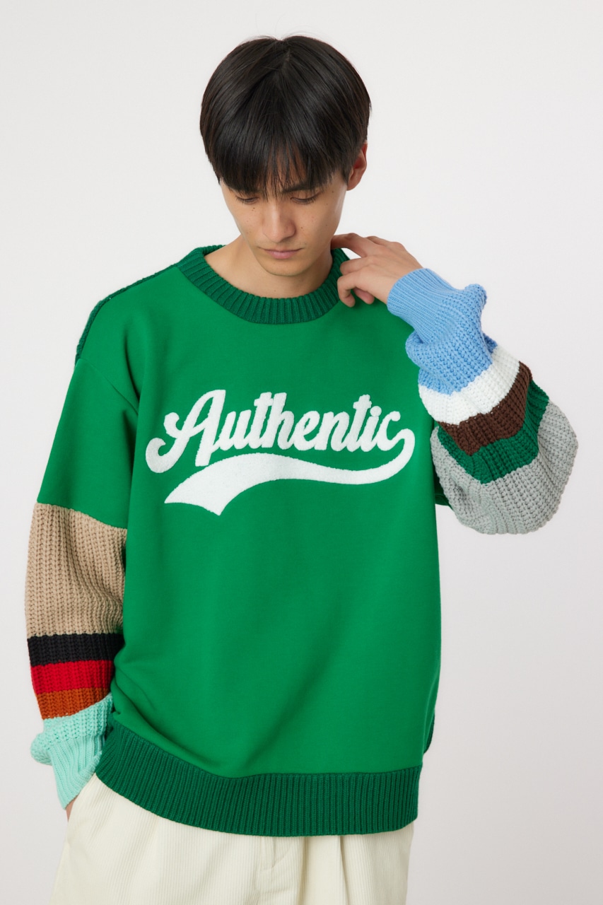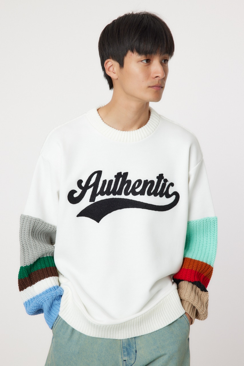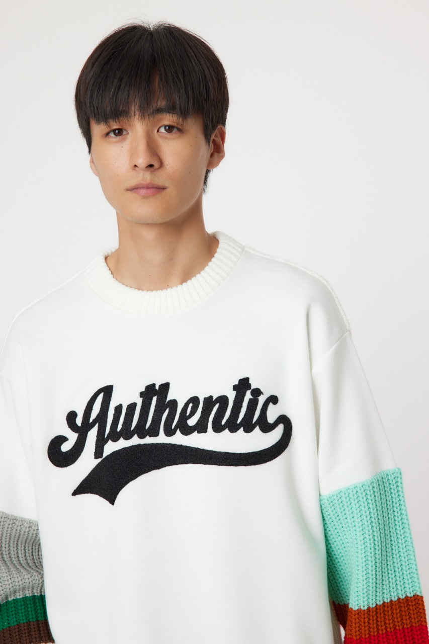 リメイク古着のようなデザインのドッキングトップス。袖部分のカラフルマルチボーダーがポイント。アメカジライクな胸元のプリントで落ち着いた印象に仕上げました。