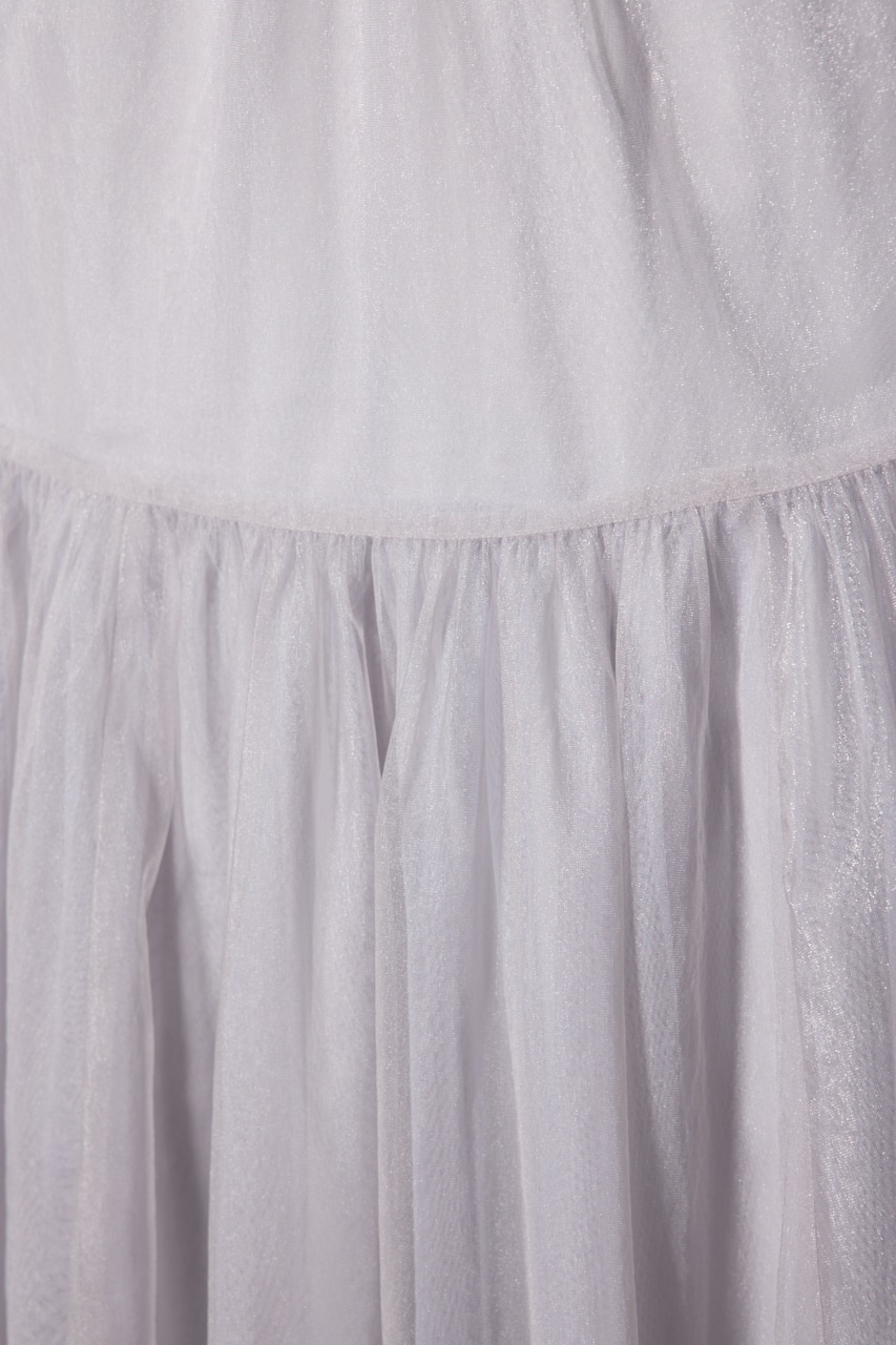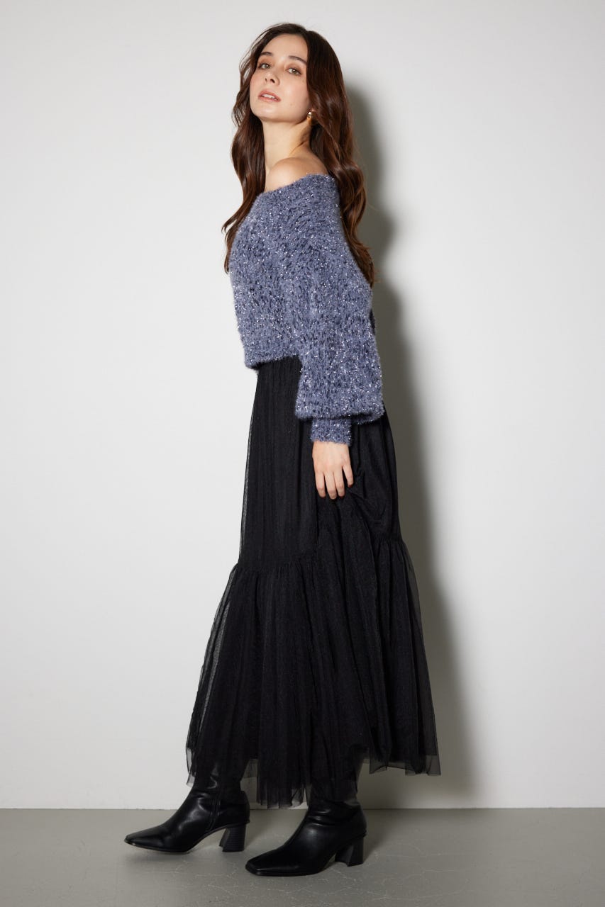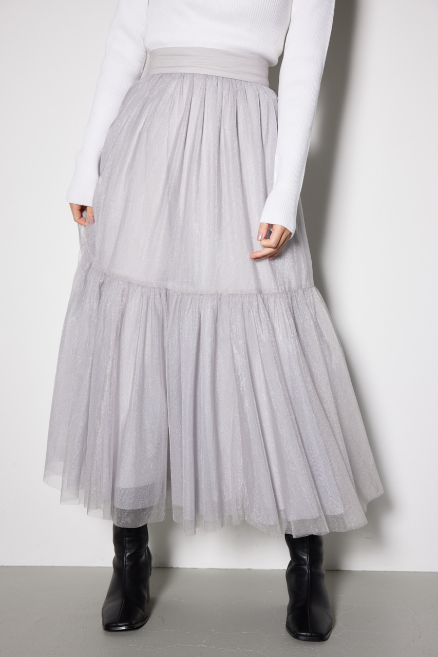 繊細なラメのような光沢のあるチュール生地を使用し、表側と後ろ側で違うチュール素材を使用し微配色になっているので華やかな印象に。
