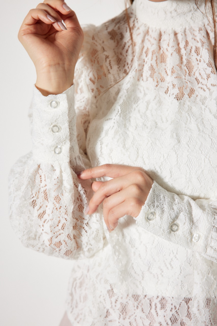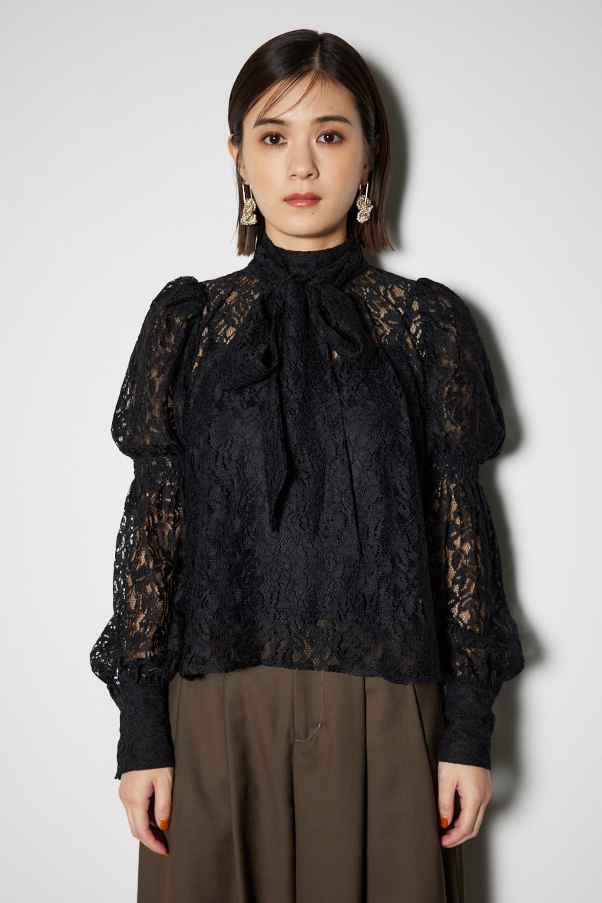 上品なフワラー柄レース素材に、袖にギャザーを入れてフェミニンな印象に仕上げたブラウスです。