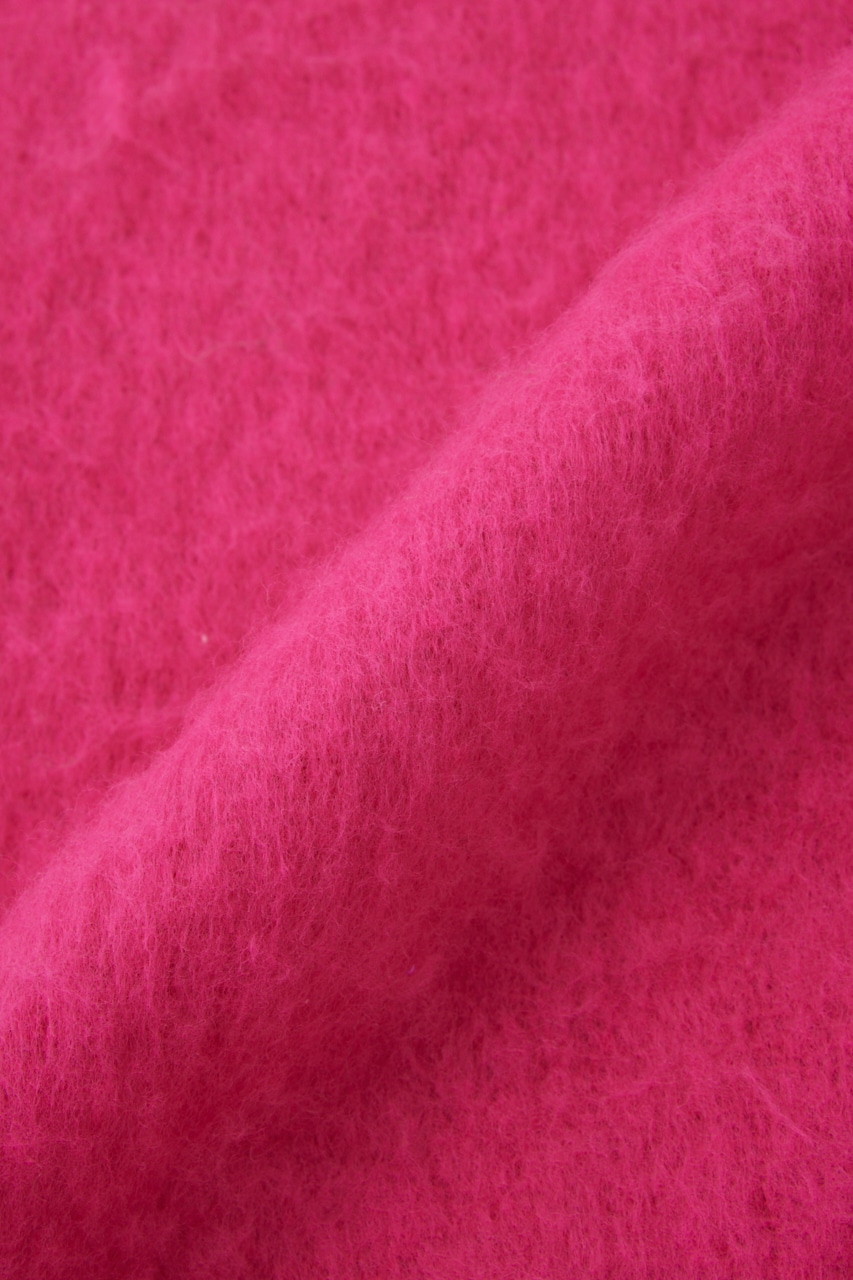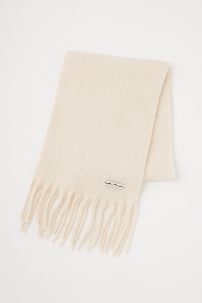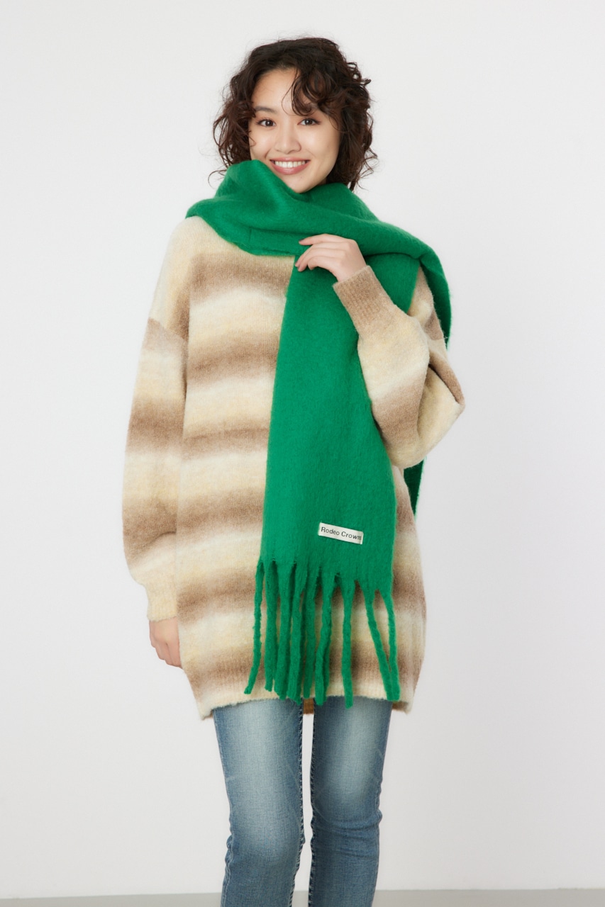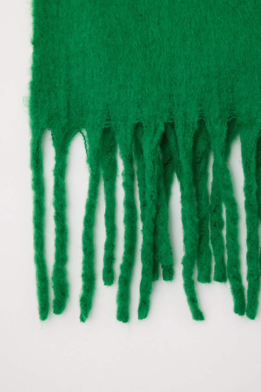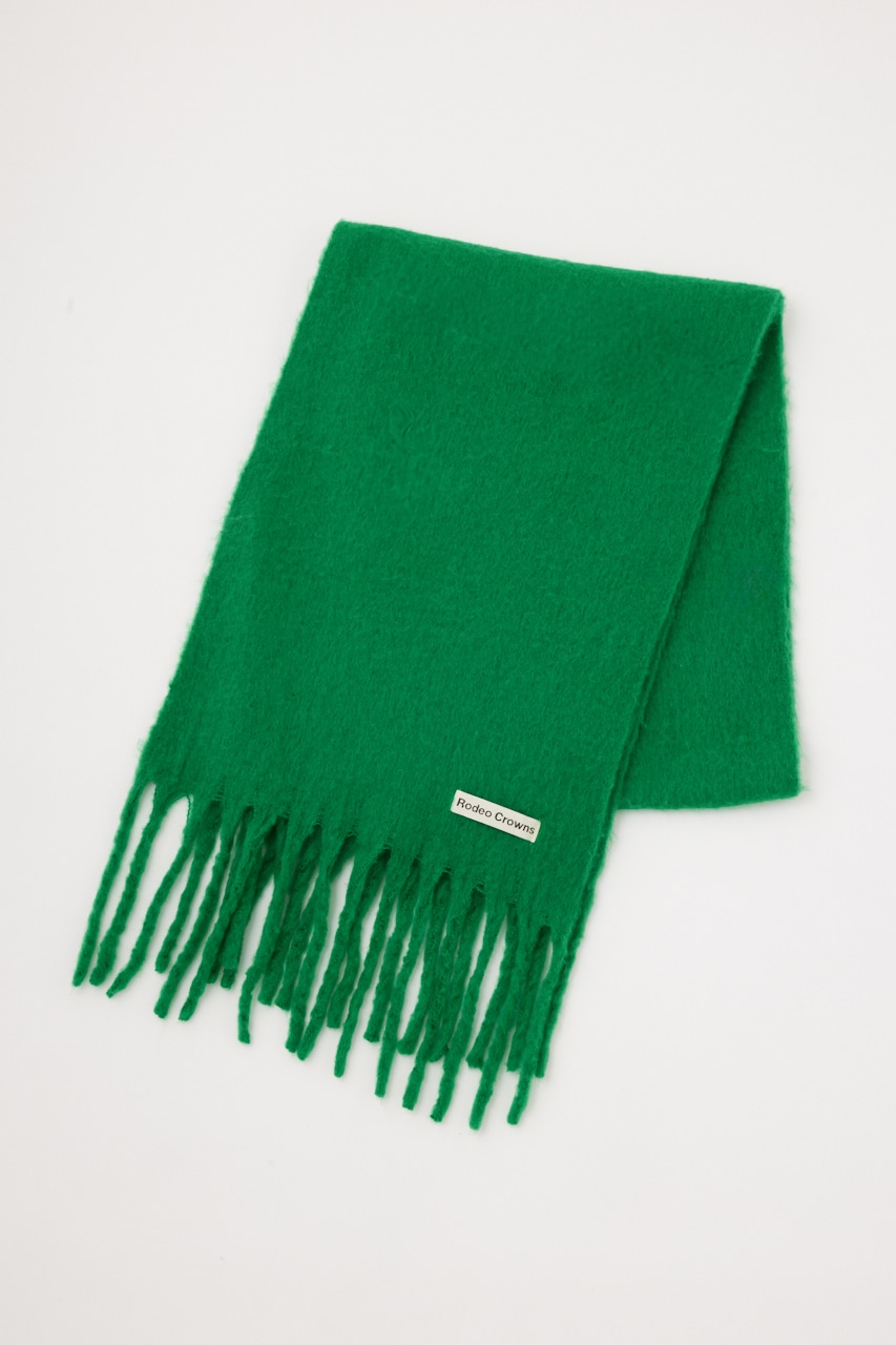 程よいボリューム感のあるカラーマフラー。起毛感のあるふんわりとした肌触りで、太めのフリンジもアクセントに。定番のIVOYとBLK、差し色のGRNとPNKの4色展開。思わず色違いで欲しくなるアイテムです。