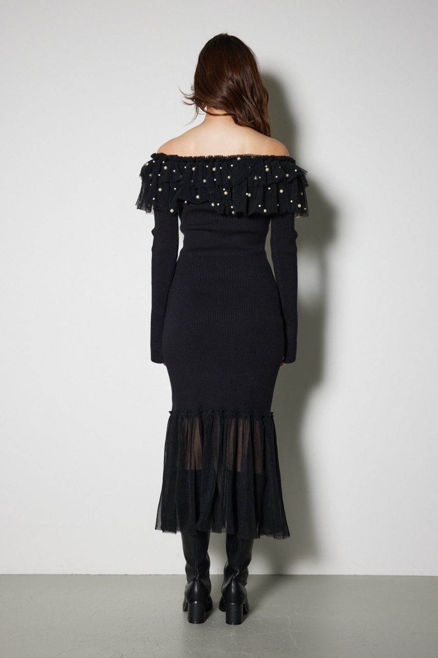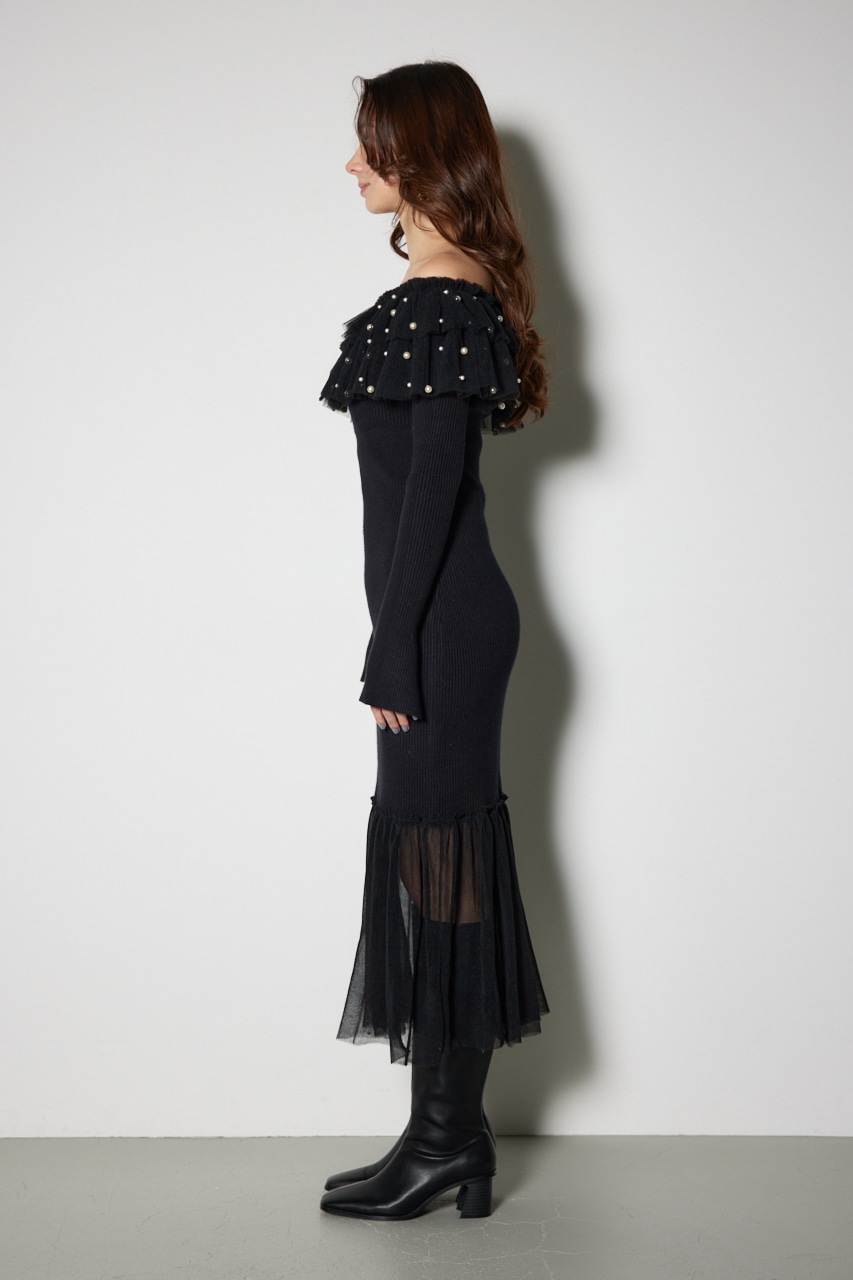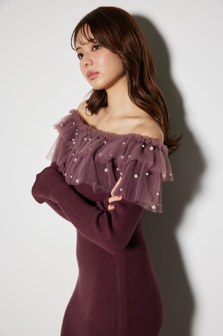 プリーツ加工された布帛とニットをドッキングさせた華やかなワンピ。