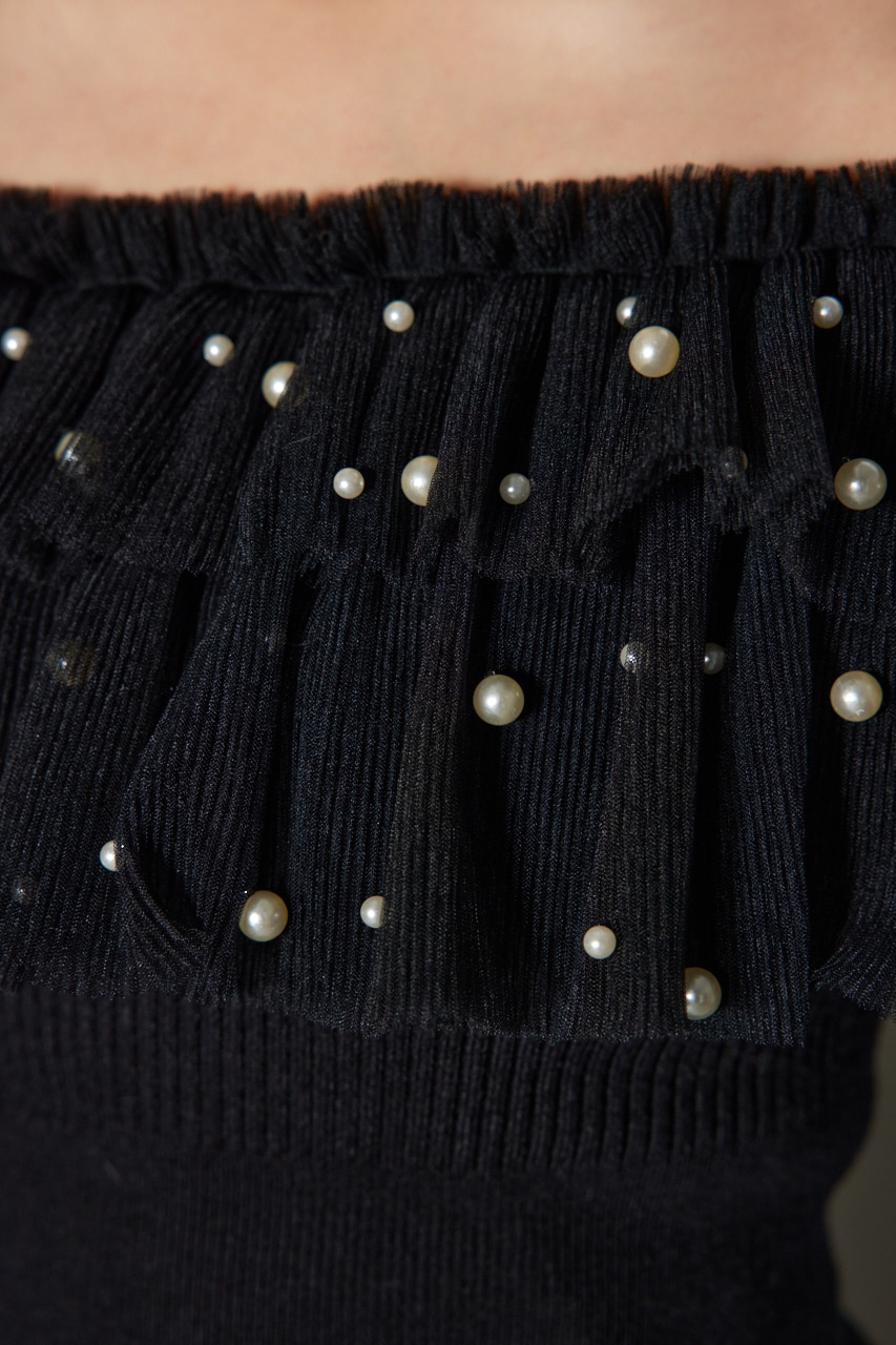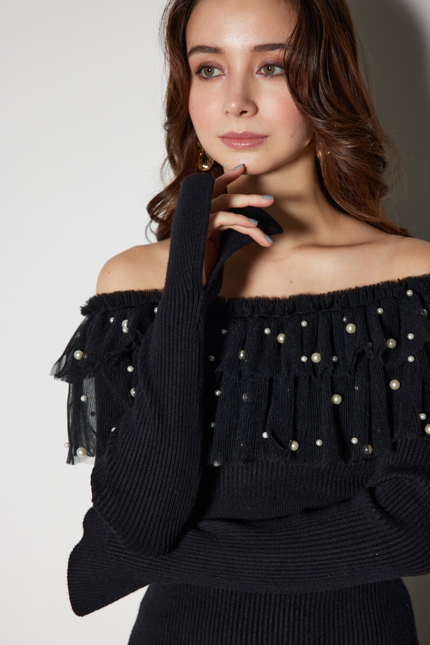 胸元にだけ、パールをあしらいより華やかさをプラス。