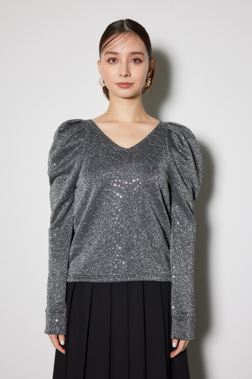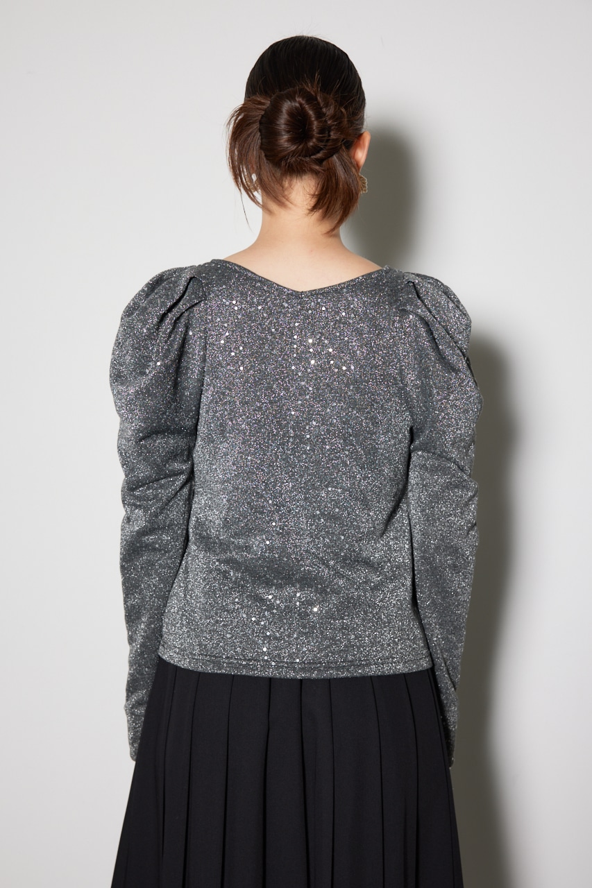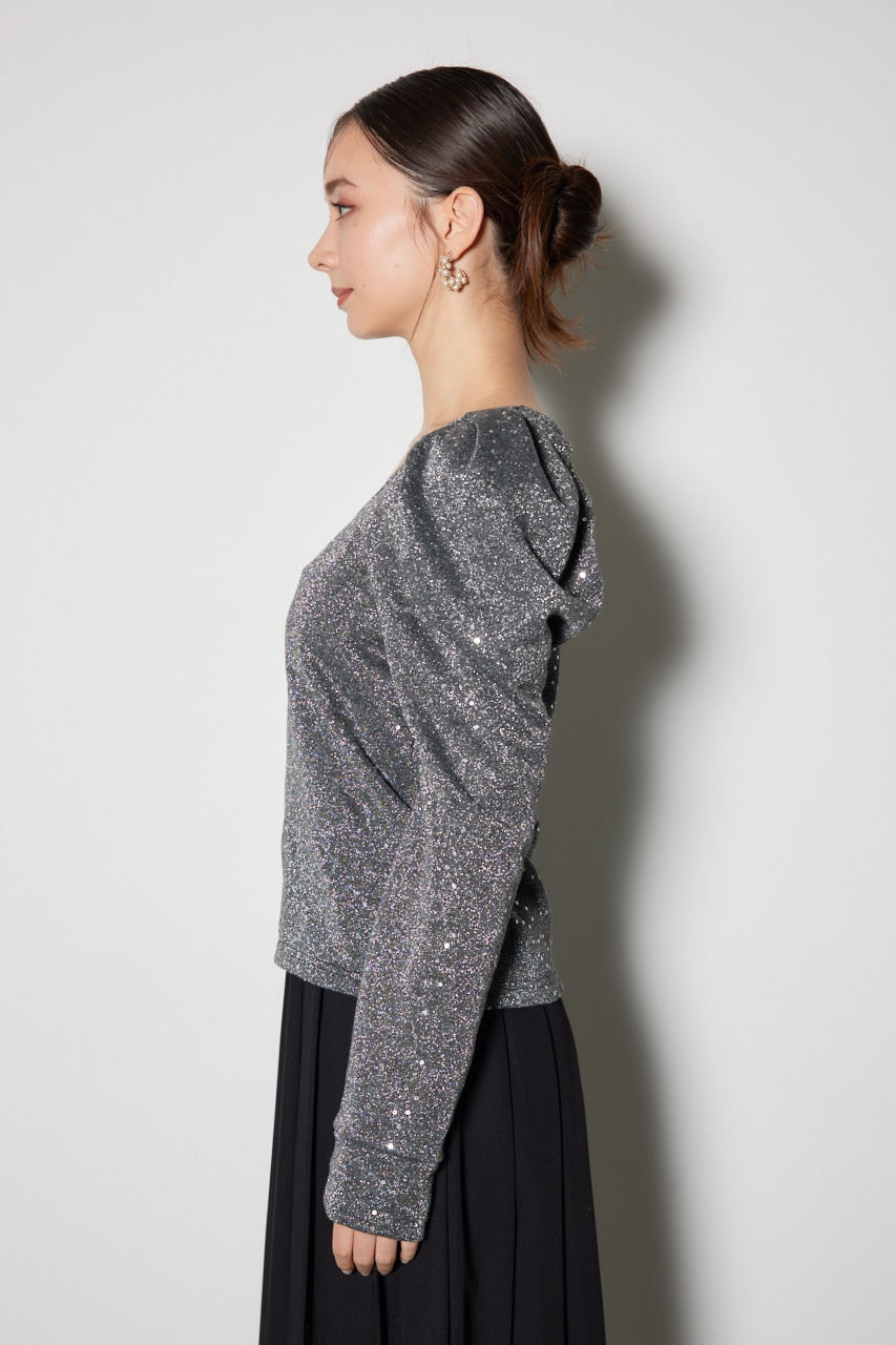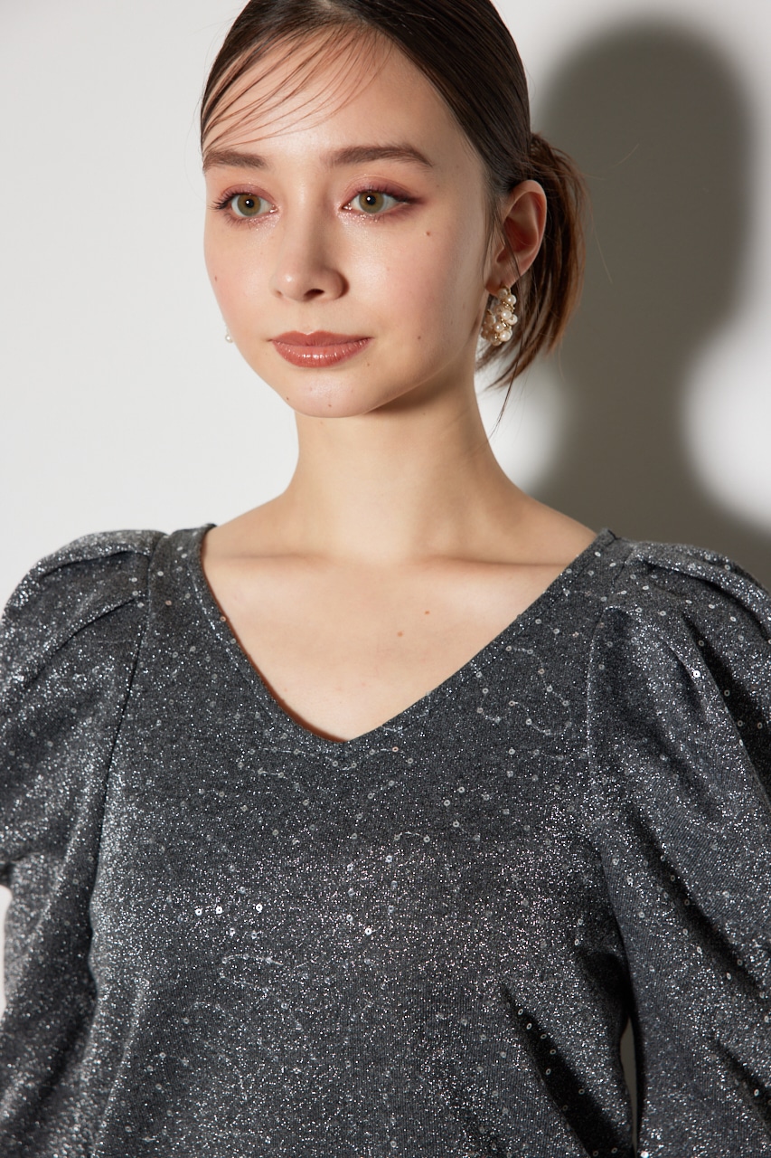 スパンコールが縫われている生地を採用し作成した華やかなカットトップス。