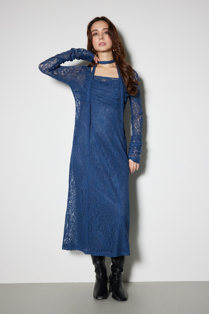 ゴージャスな印象になりやすい総レースワンピースをIラインに落とし込み、モードでスタイリッシュな印象に仕上げました。