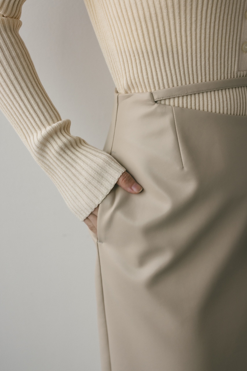 ウエストストリングと斜めラインカッティングがデザインポイントのレザースカート。