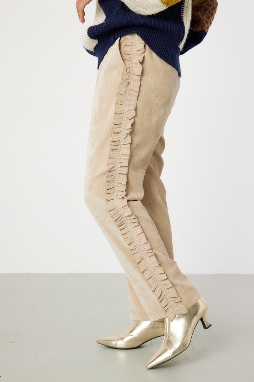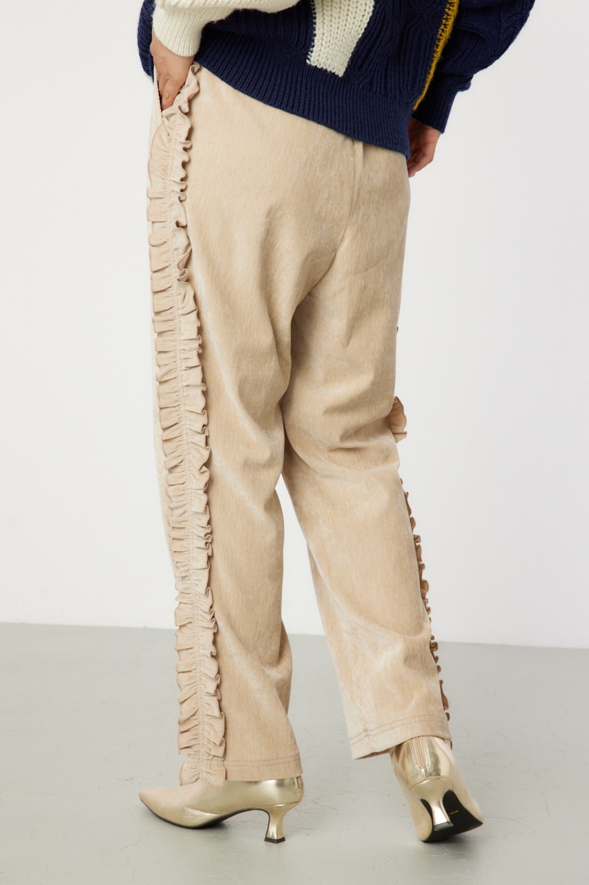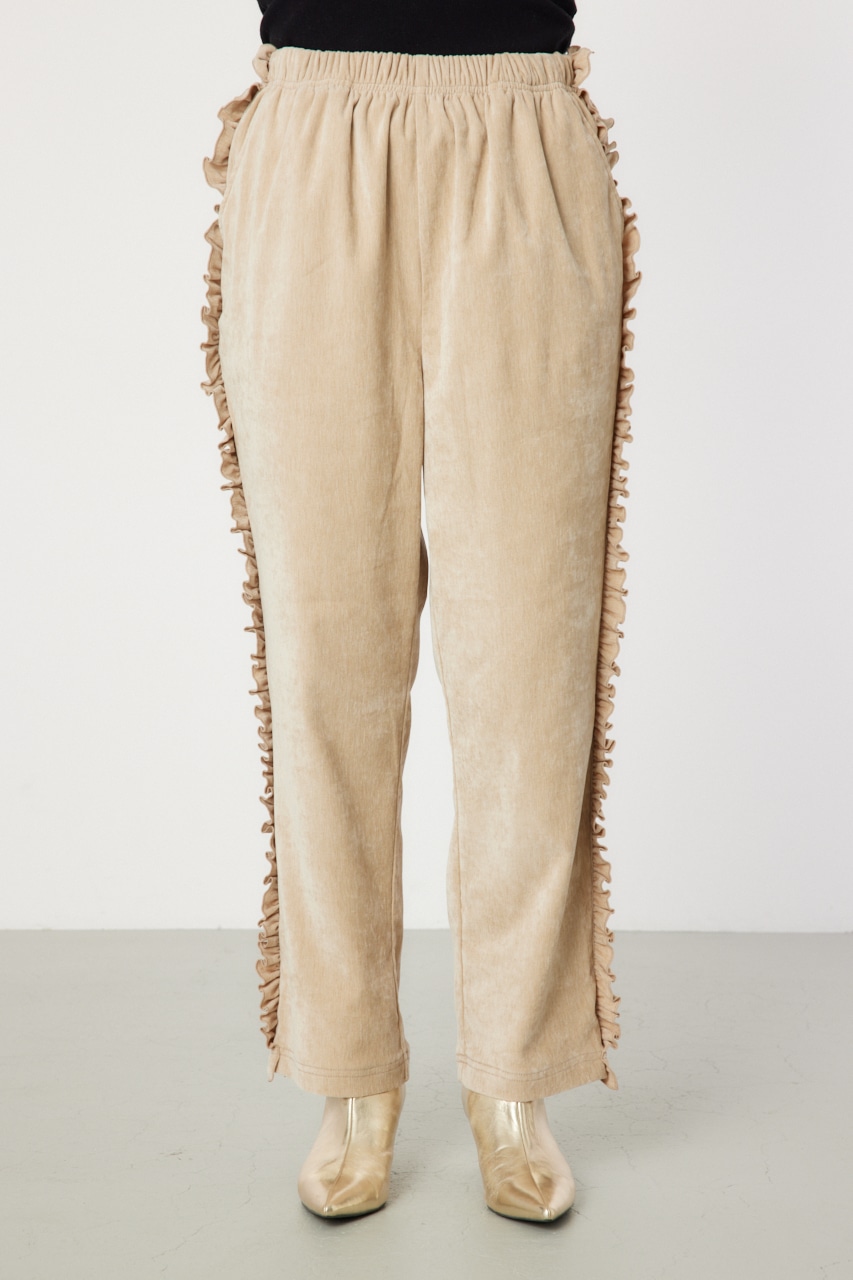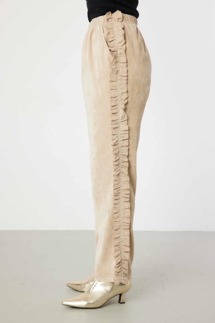 サイドのフリルがポイントのデザインパンツ。ボディラインを程よくカバーしてくれるテーパードシルエットがポイント。今の季節にピッタリのベロア素材なので、履くだけでトレンド感のある着こなしが完成。ニットやスウェットなど素材違いのトップスと合わせることで、こなれ感を演出してくれるアイテムです。
