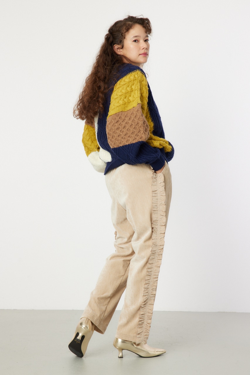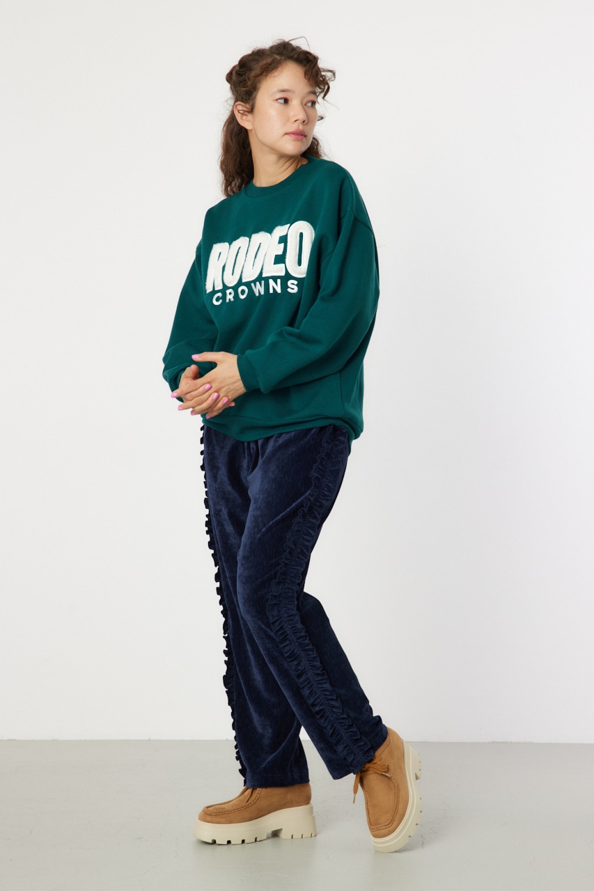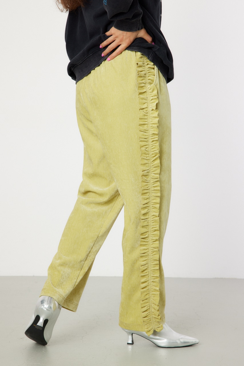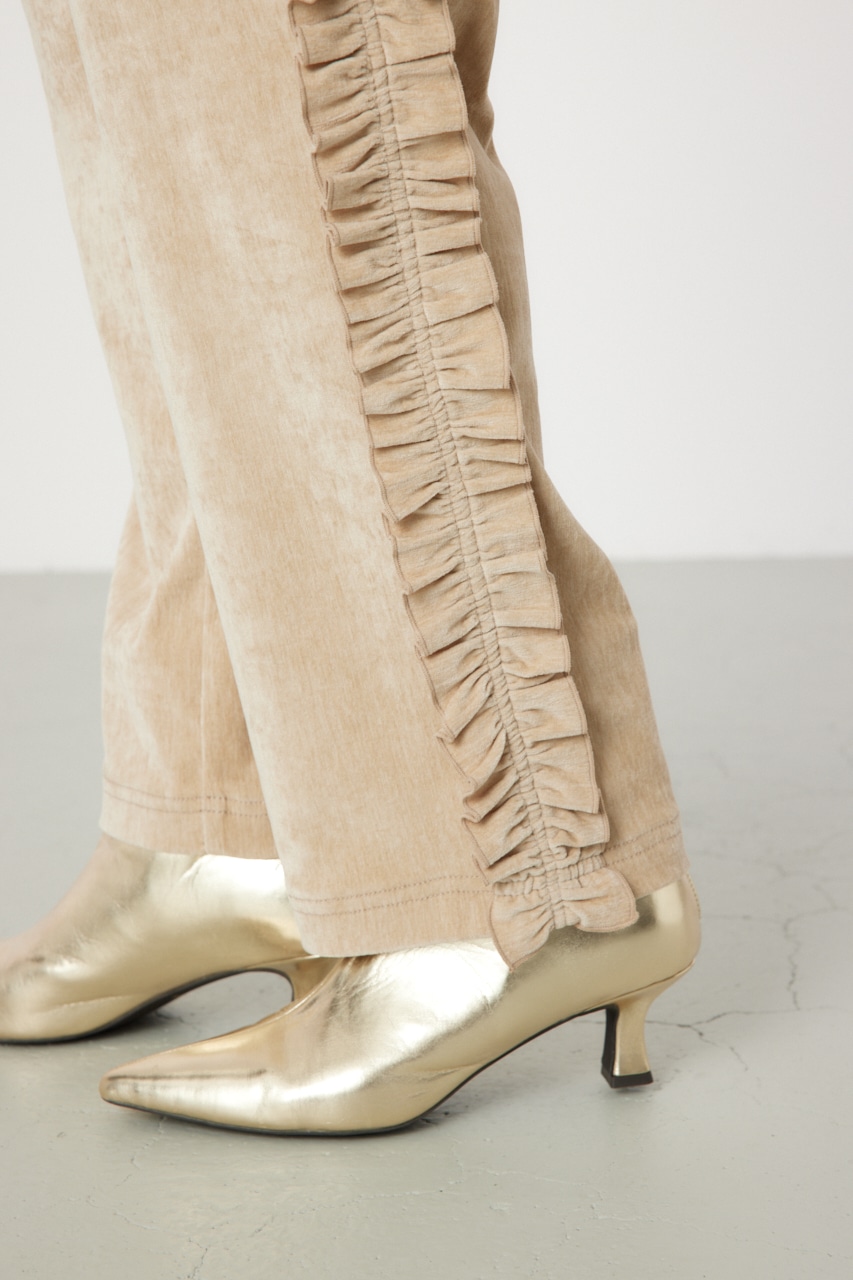 サイドのフリルがポイントのデザインパンツ。ボディラインを程よくカバーしてくれるテーパードシルエットがポイント。今の季節にピッタリのベロア素材なので、履くだけでトレンド感のある着こなしが完成。ニットやスウェットなど素材違いのトップスと合わせることで、こなれ感を演出してくれるアイテムです。