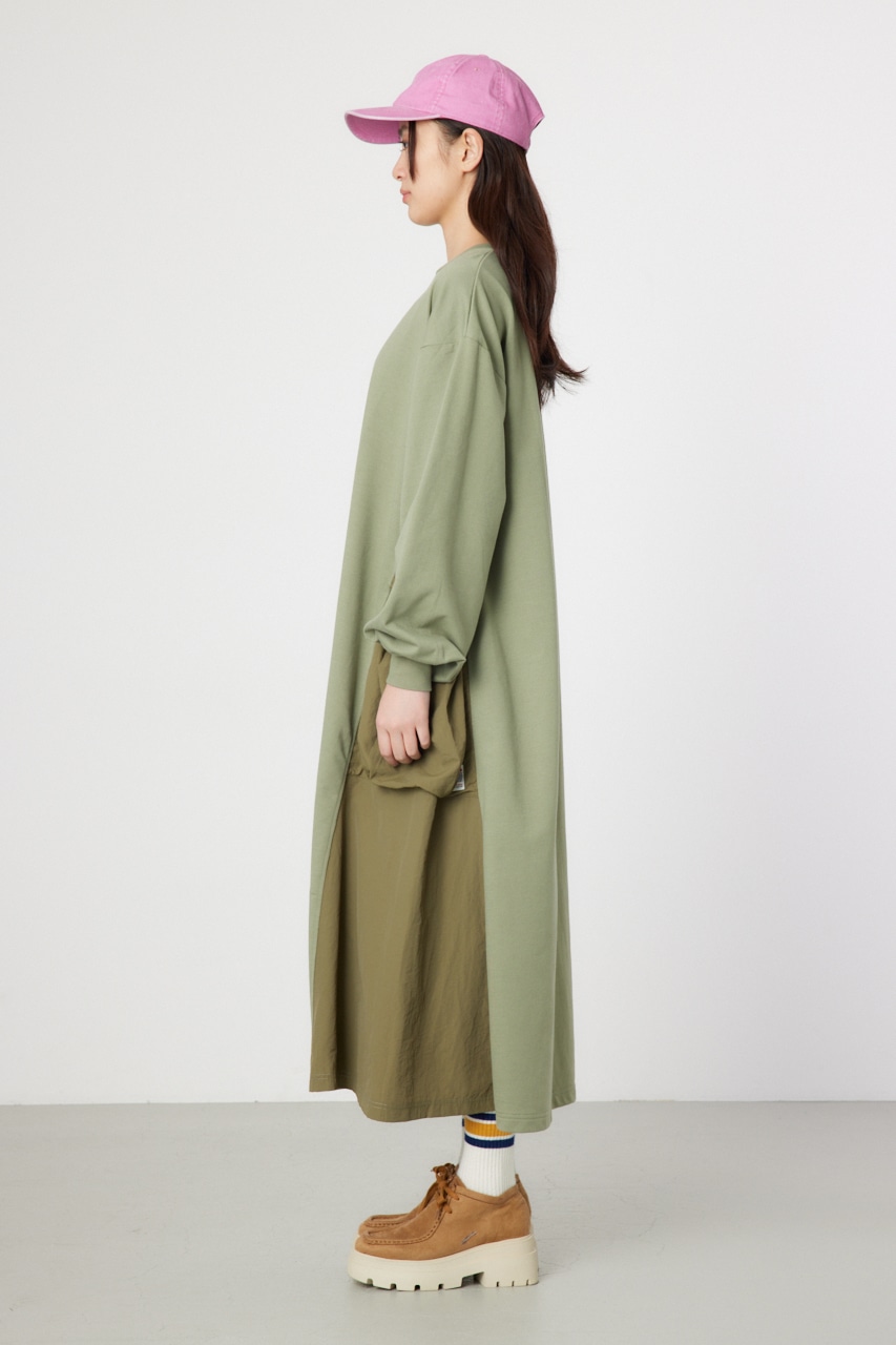 ミリタリーテイストを部分的に取り込んだ異素材ドッキングのワンピース。ゆったりとしたシルエットですが、身頃と両サイドで切替になっているので、スッキリとした印象に。配色のポケット部分の付属とネームがポイント。軽く滑らかな素材を使用しているので、ストレスフリーな着心地のアイテム。透け感がなく、シーズンレスで着用できる優れものです。