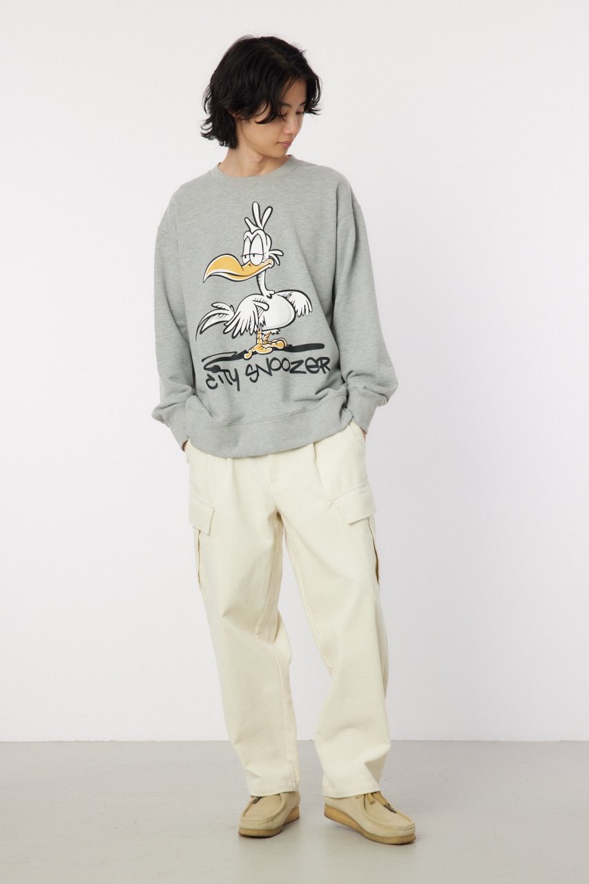 眠たそうな表情が可愛らしいキャラクターグラフィックの裏毛スウェット。古着感のあるデザインがポイントです。