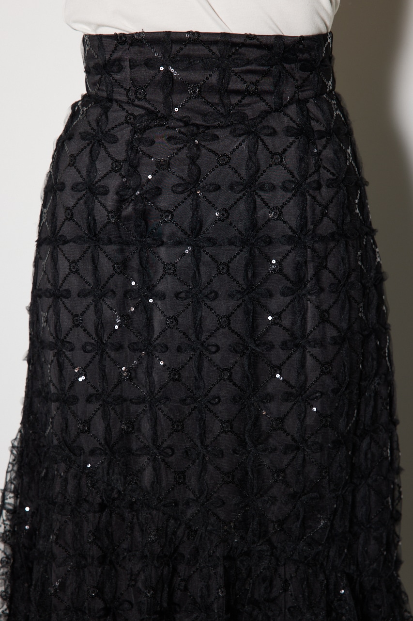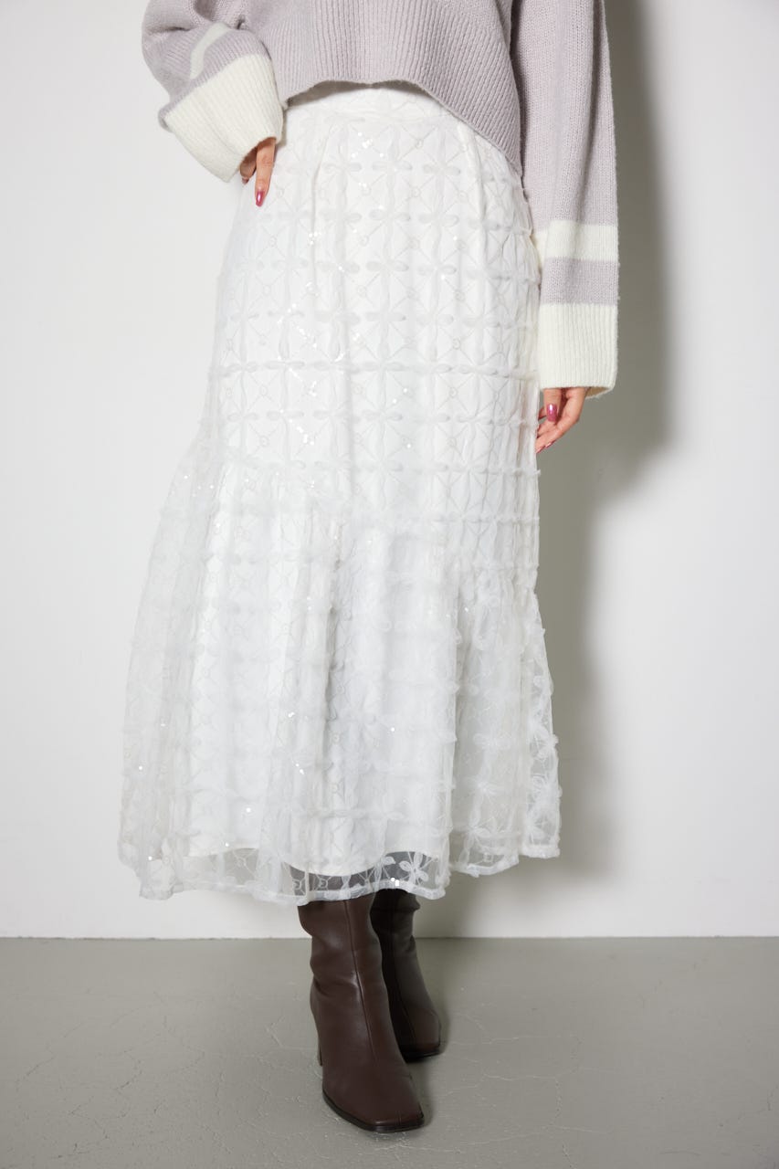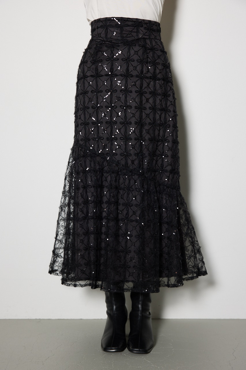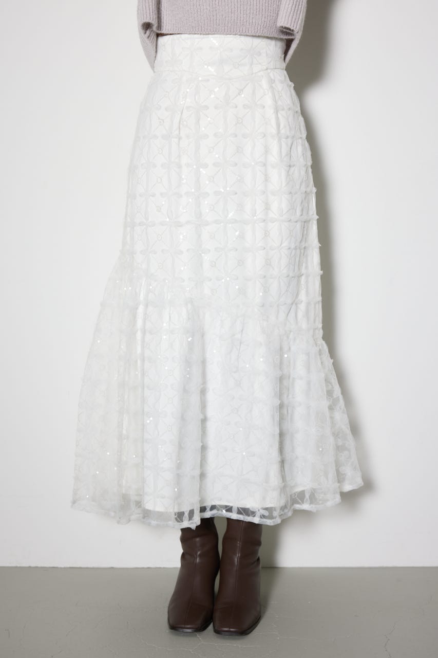 タック使いで柄を表現した生地にスパンコールを施して、リッチな印象のスカートが仕上がりました。