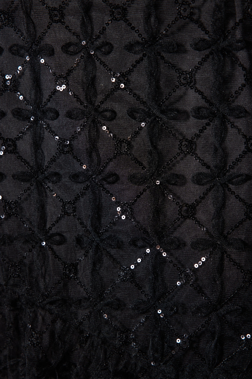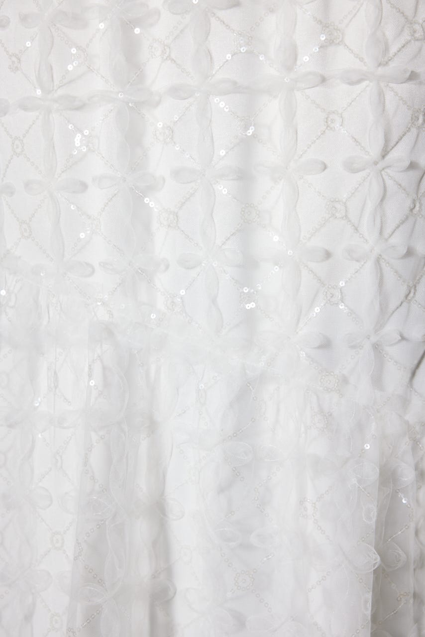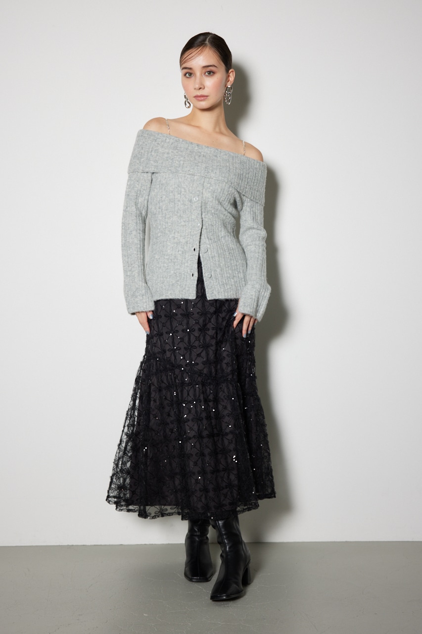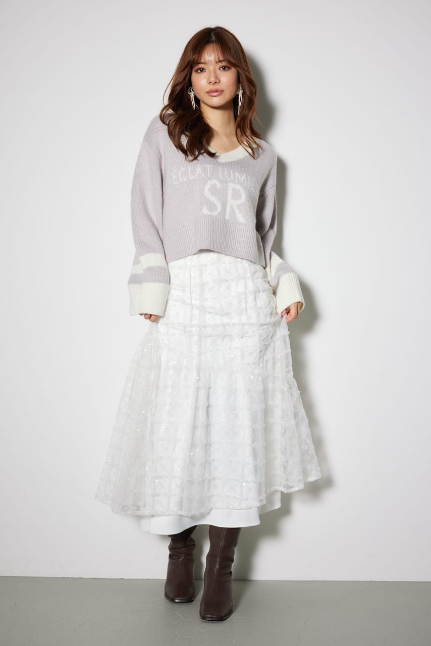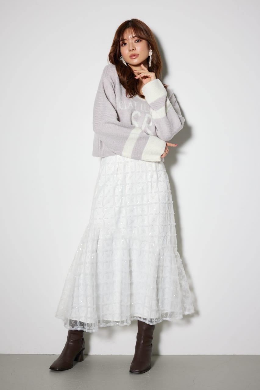 タック使いで柄を表現した生地にスパンコールを施して、リッチな印象のスカートが仕上がりました。