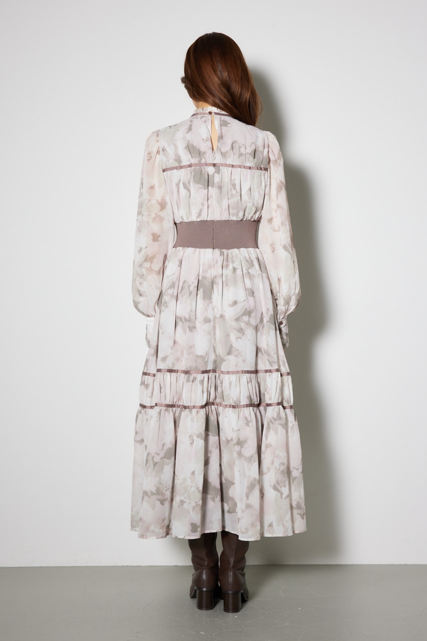 軽やかな生地のワンピースにウエストにニットリブを施しスタイルアップ効果〇
