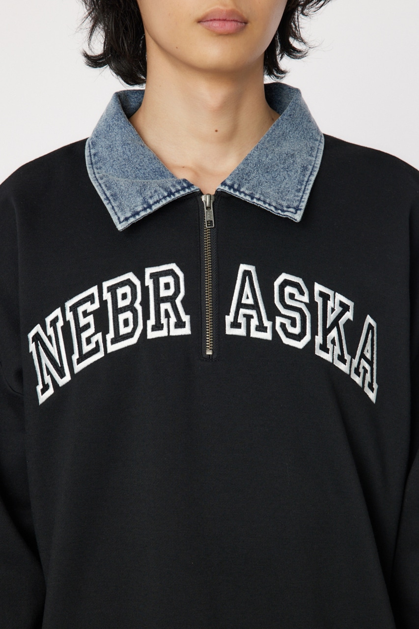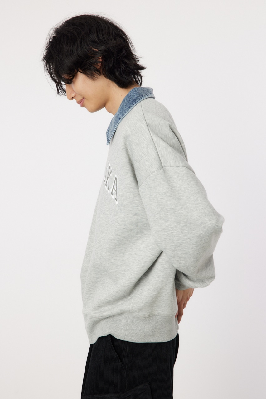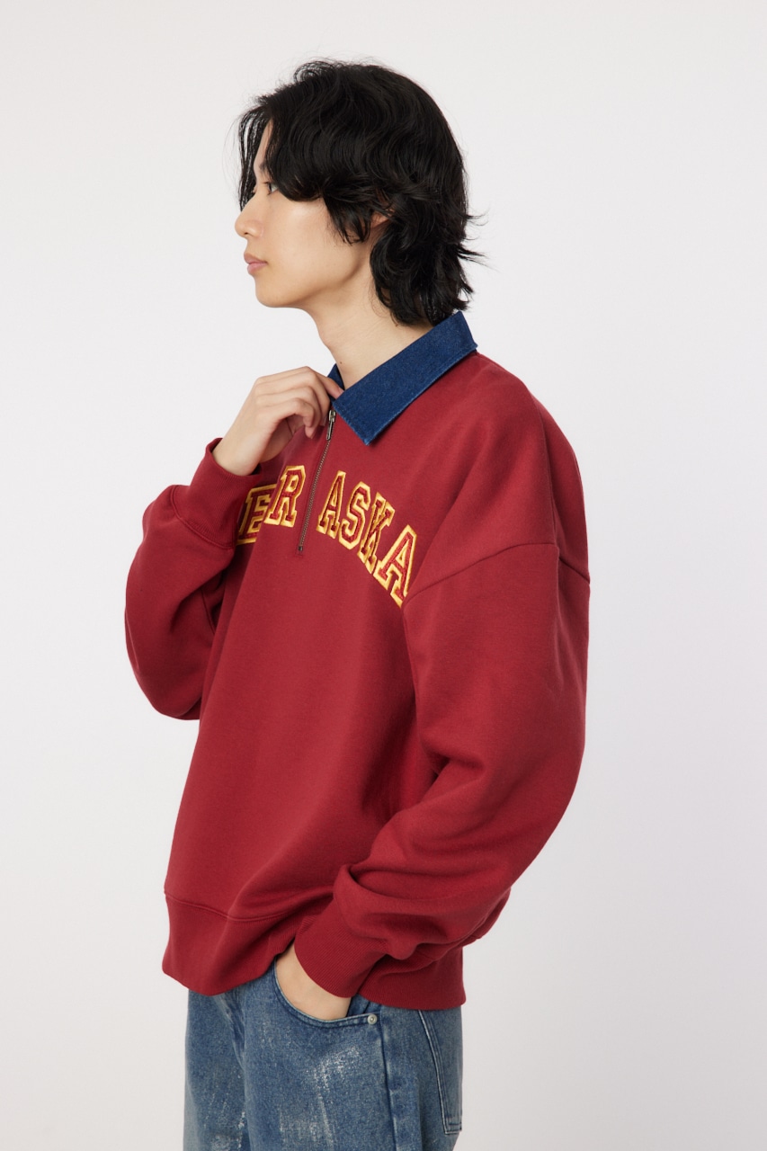襟部分をデニム仕様にする事でスポーティになりすぎず、カジュアル感を出したプルオーバータイプのトップス。裏毛素材を使用したハーフジップデザインなので、個性的なスタイリングを楽しめるアイテムです。