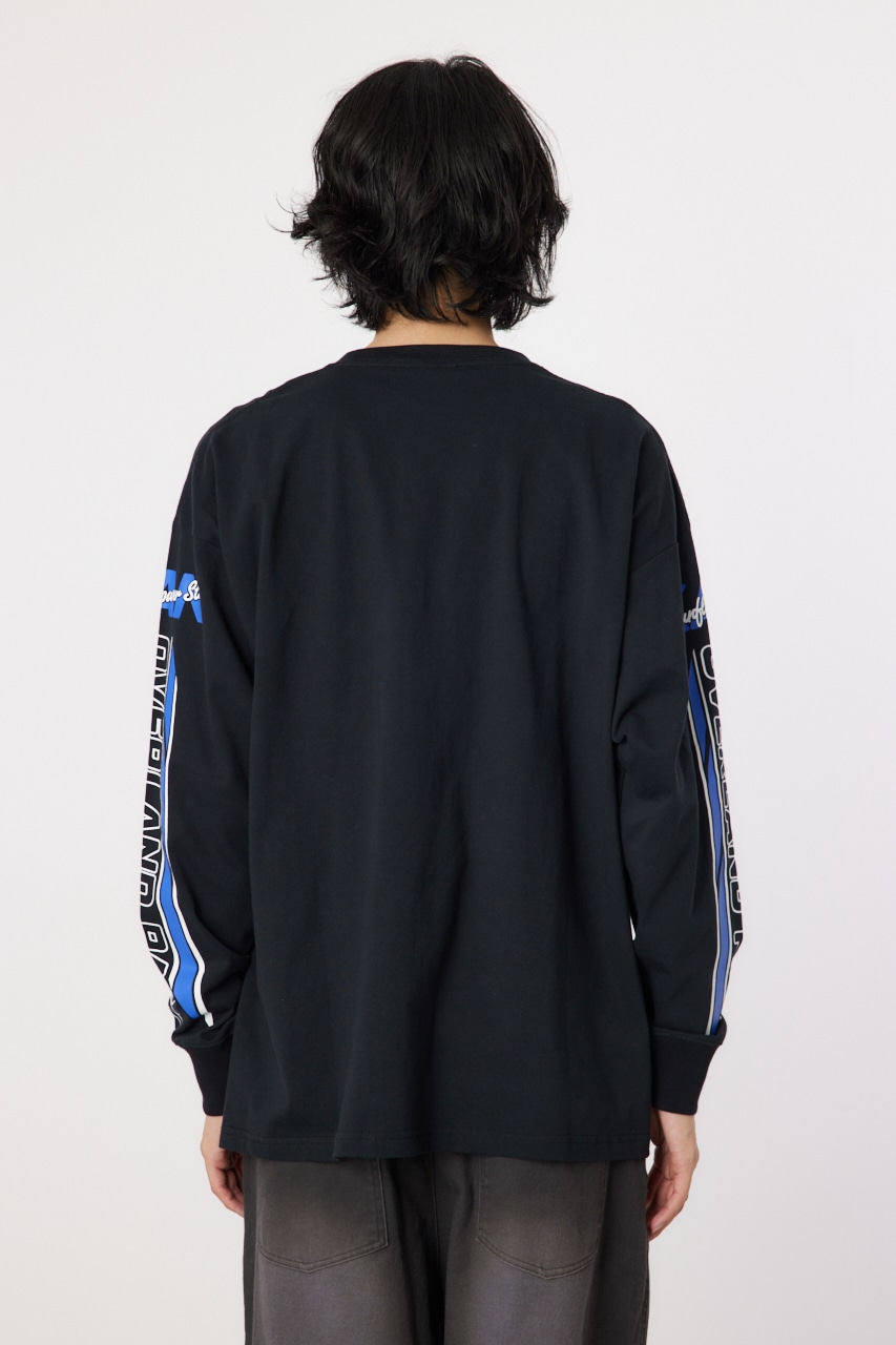 90年代のヴィンテージスタイルを再現したレーシングロングスリーブTシャツ。レトロなロゴや架空の企業ロゴが入っていることで、どこか懐かしいモータースポーツの雰囲気を感じられるアイテム。大胆で大柄なグラフィックと少し色褪せたようなプリントも特徴的で、個性的なスタイルを楽しめる一着です。