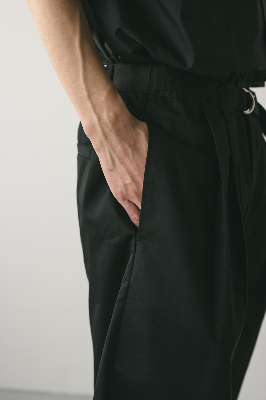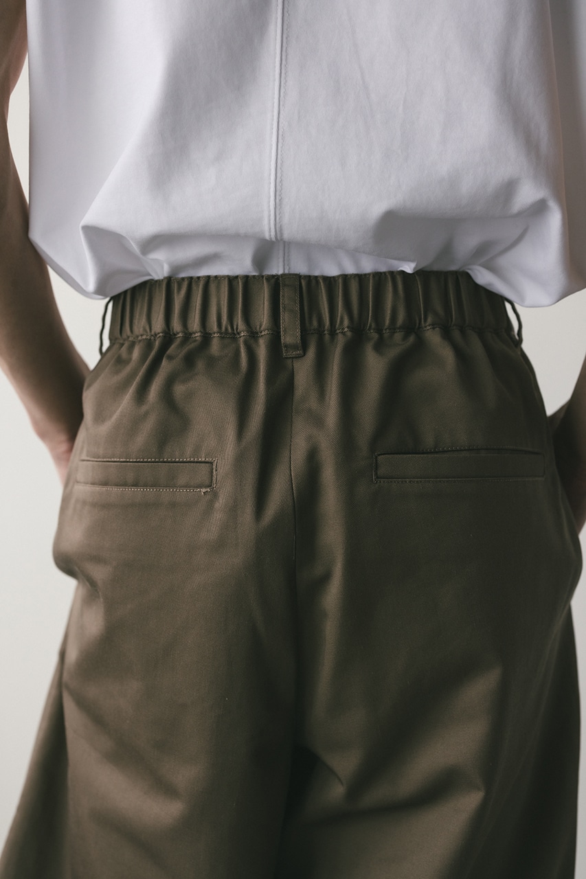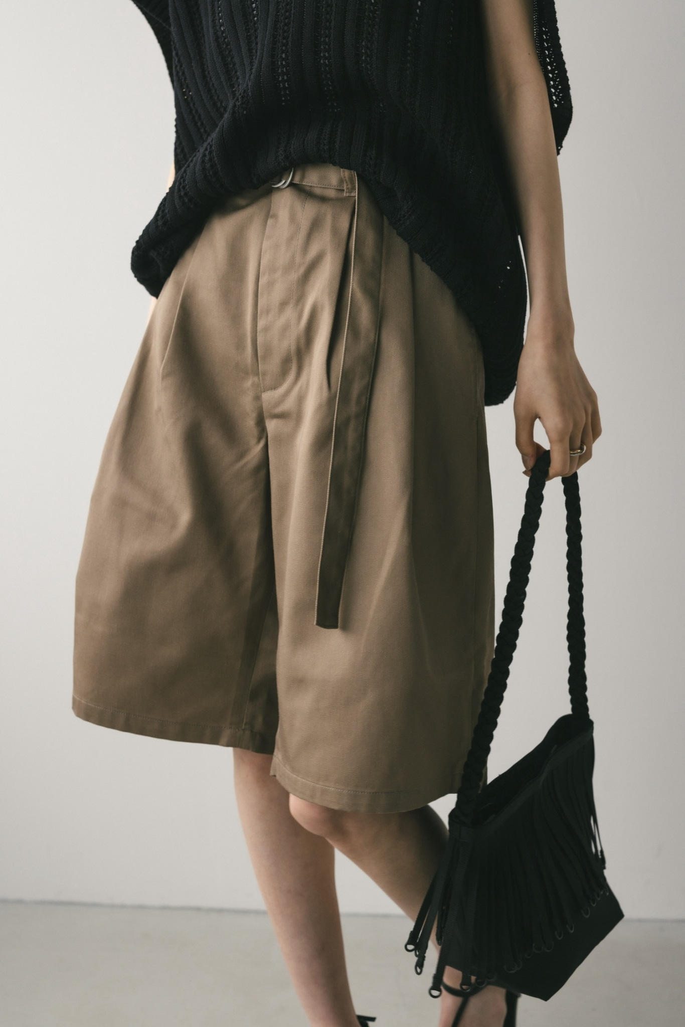 ウエスト前側には長めに設定したダブルリングベルトが付いており、背面はシャーリング仕様で着脱しやすい一枚。