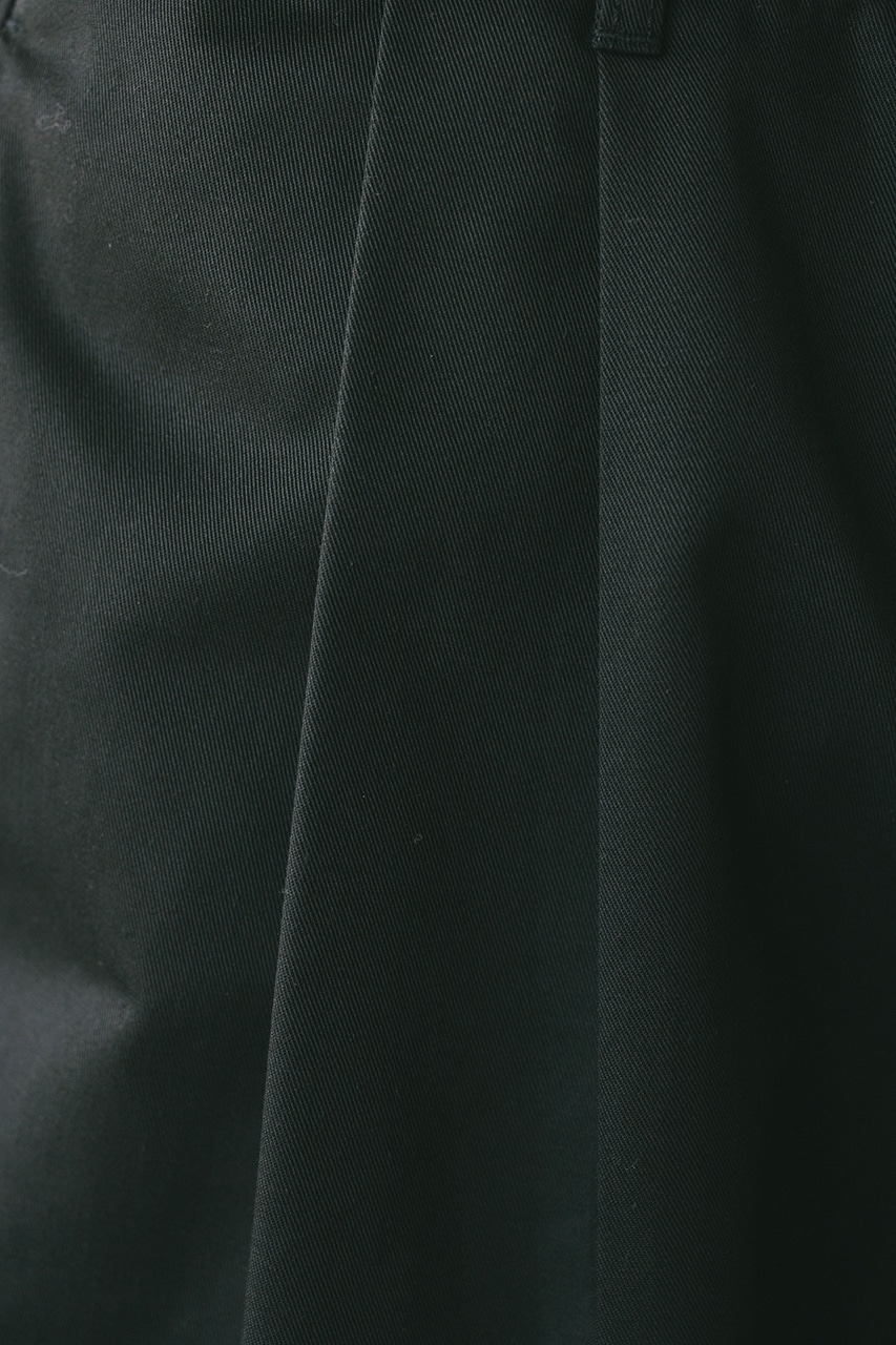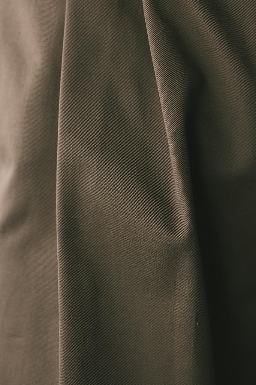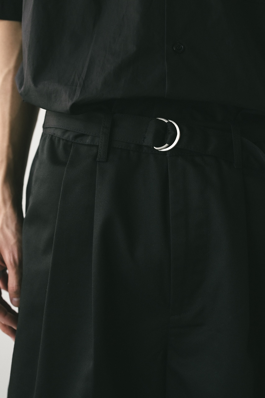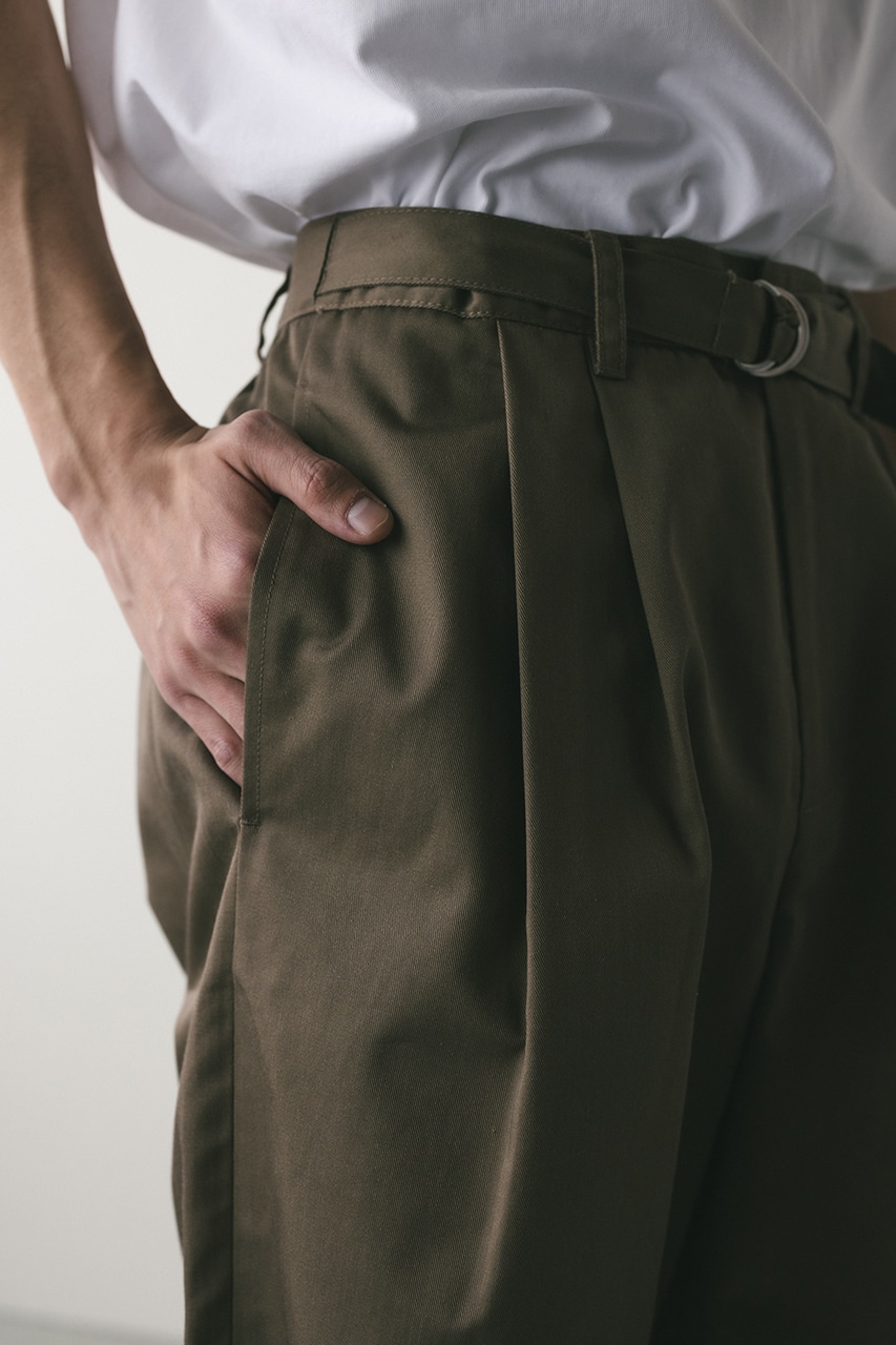 ウエスト前側には長めに設定したダブルリングベルトが付いており、背面はシャーリング仕様で着脱しやすい一枚。