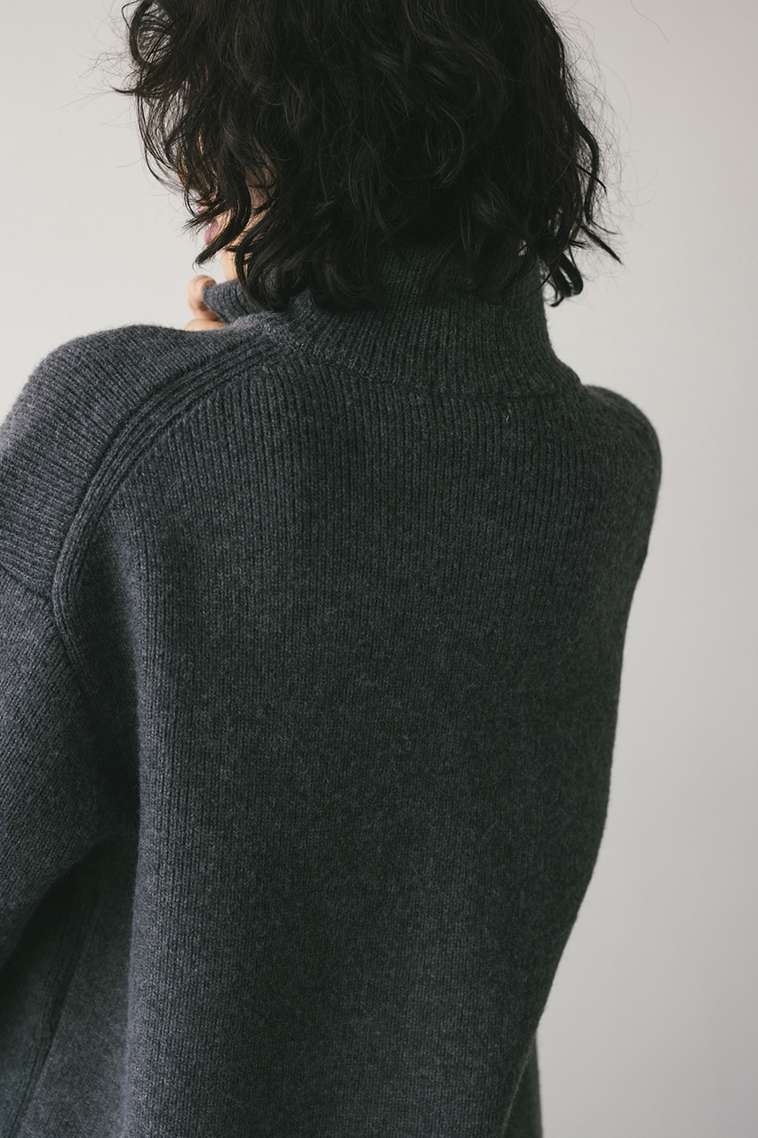 逆開ファスナーがポイントの厚みのあるリブ地で編み立てたニットカーデ。