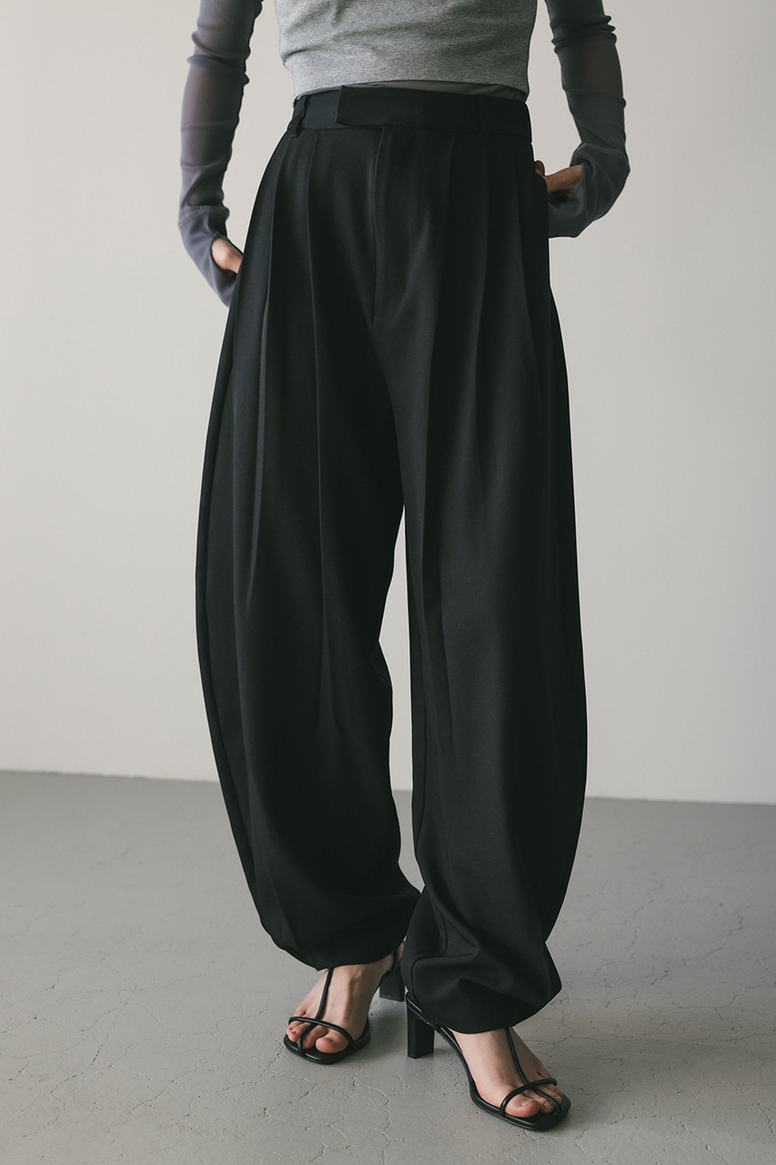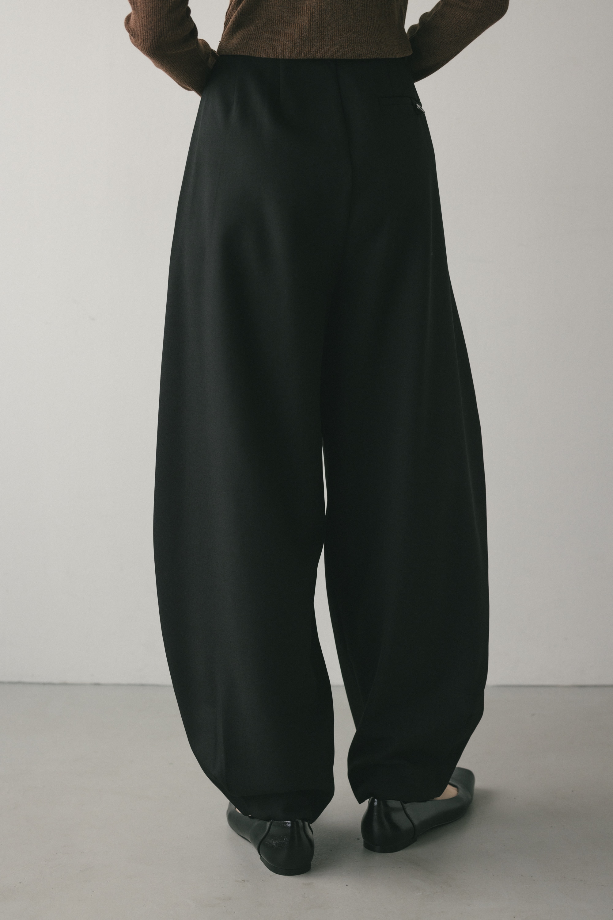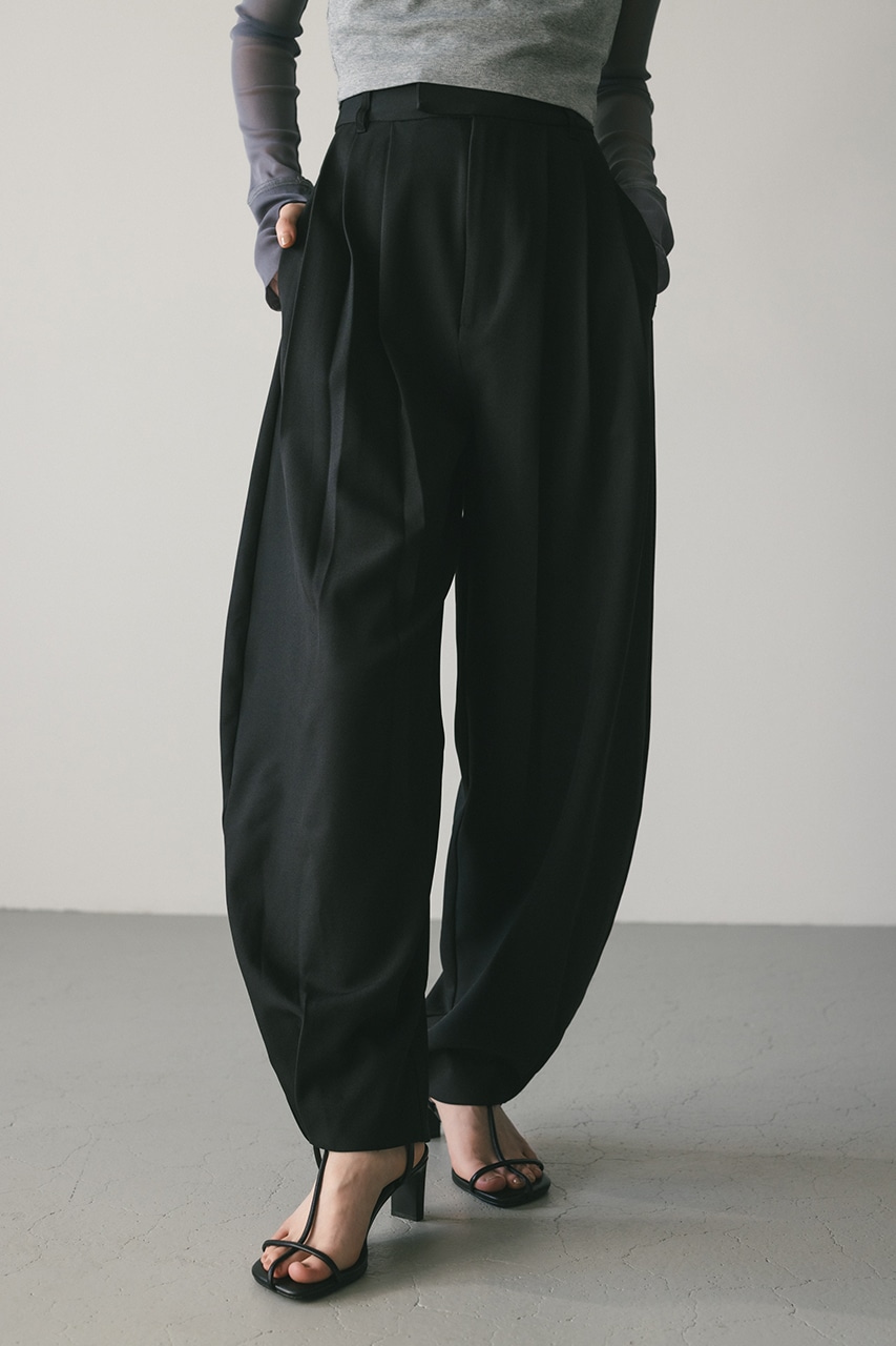 やや下目の位置で膨らみをもたせたフォルムと足元に動きが出るように施された前後の裾タックデザインにこだわったパンツ。