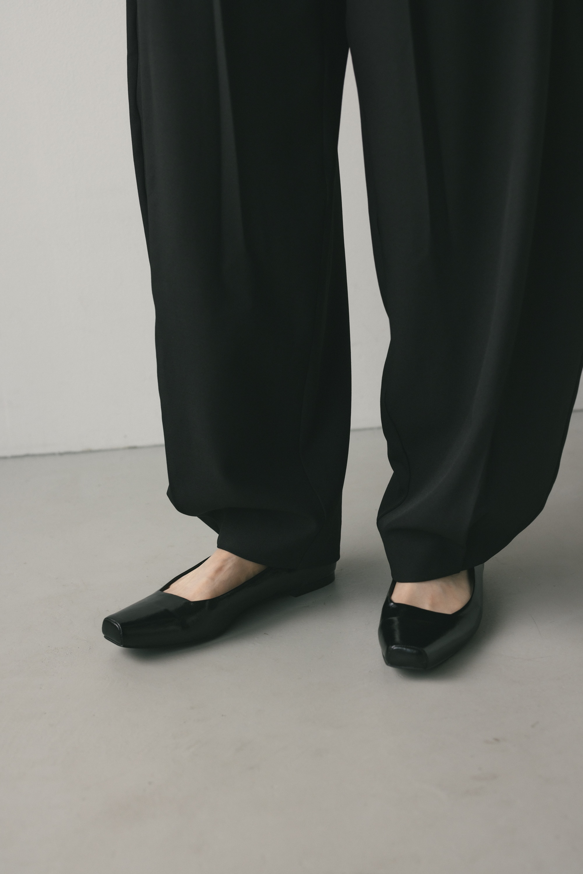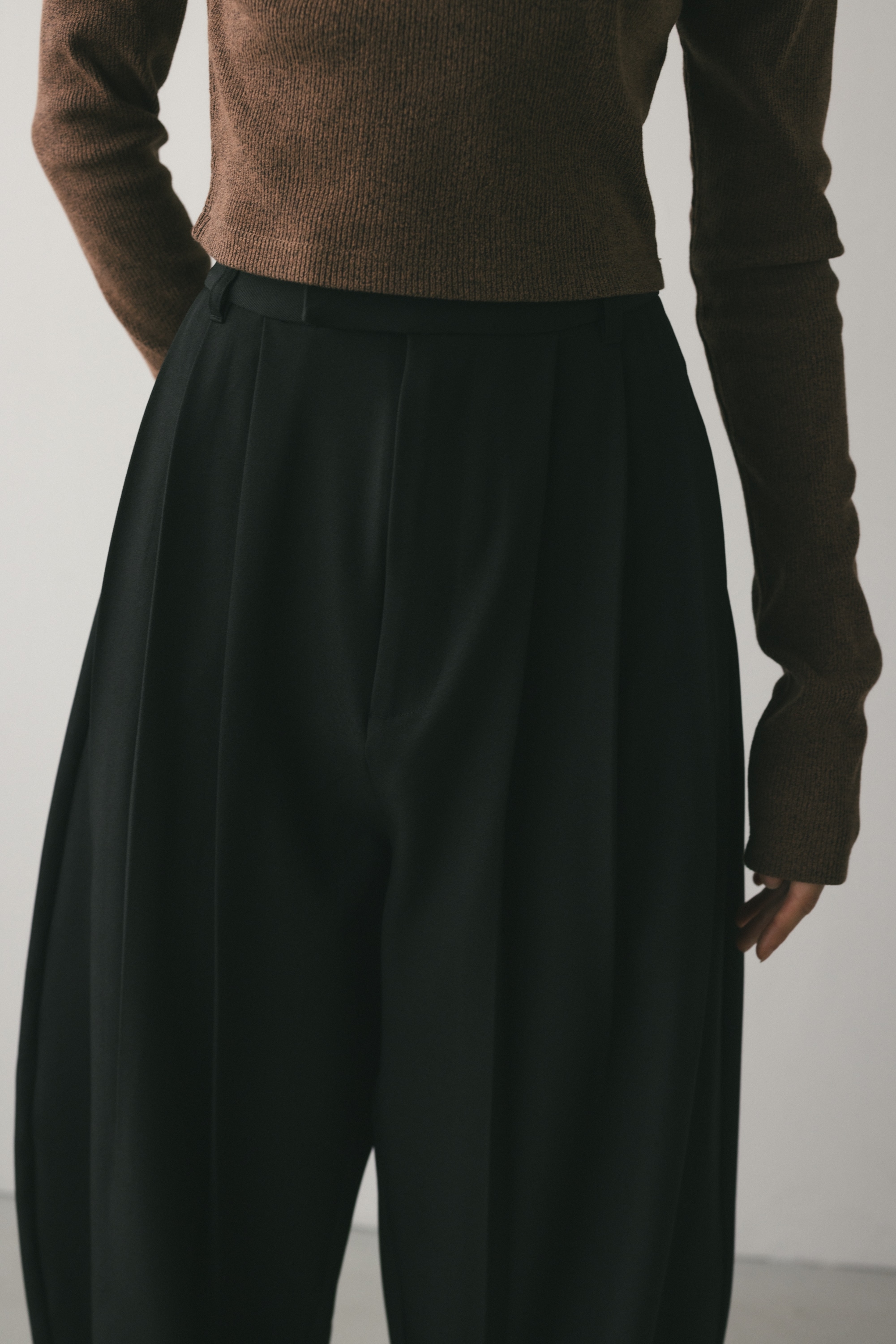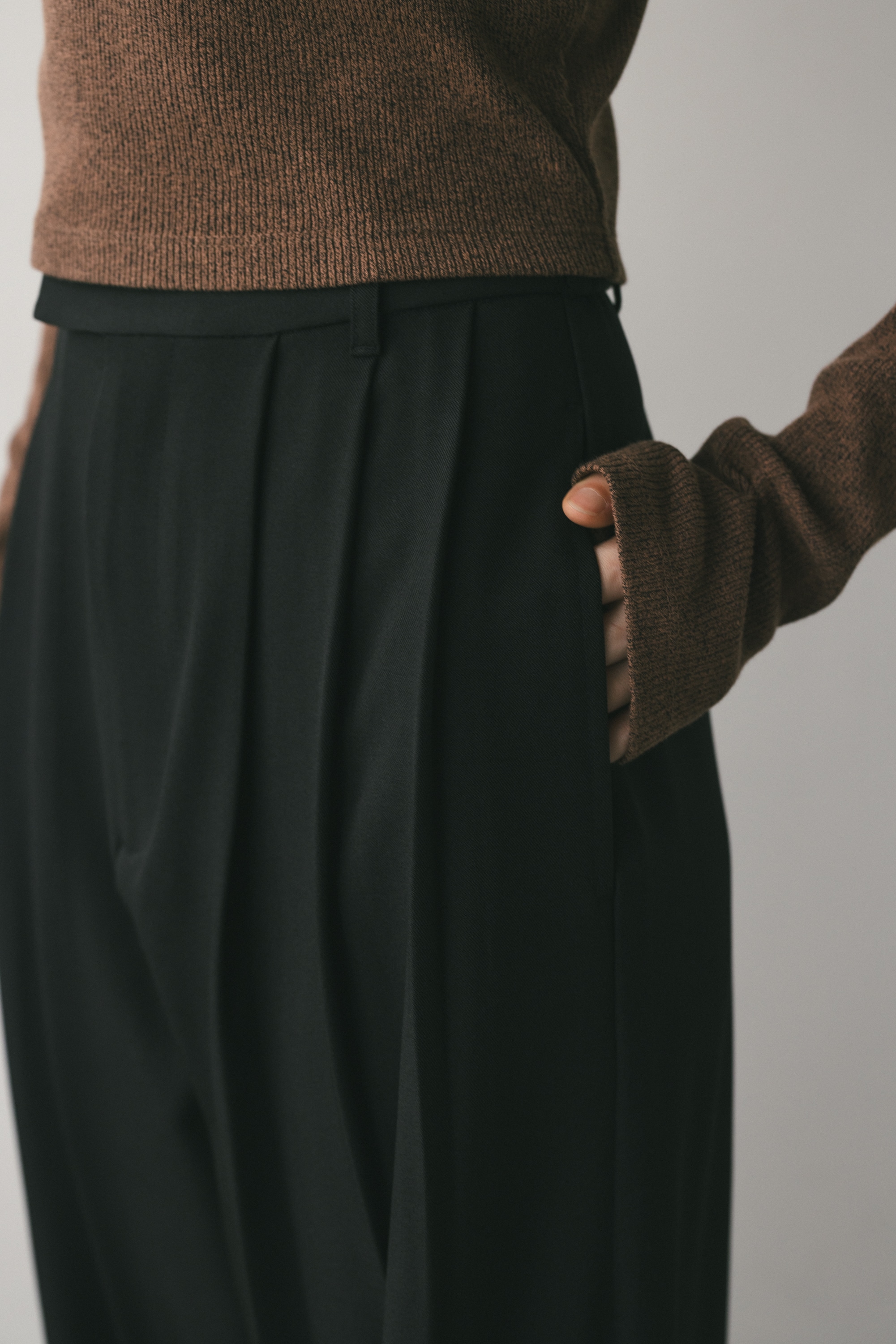 やや下目の位置で膨らみをもたせたフォルムと足元に動きが出るように施された前後の裾タックデザインにこだわったパンツ。