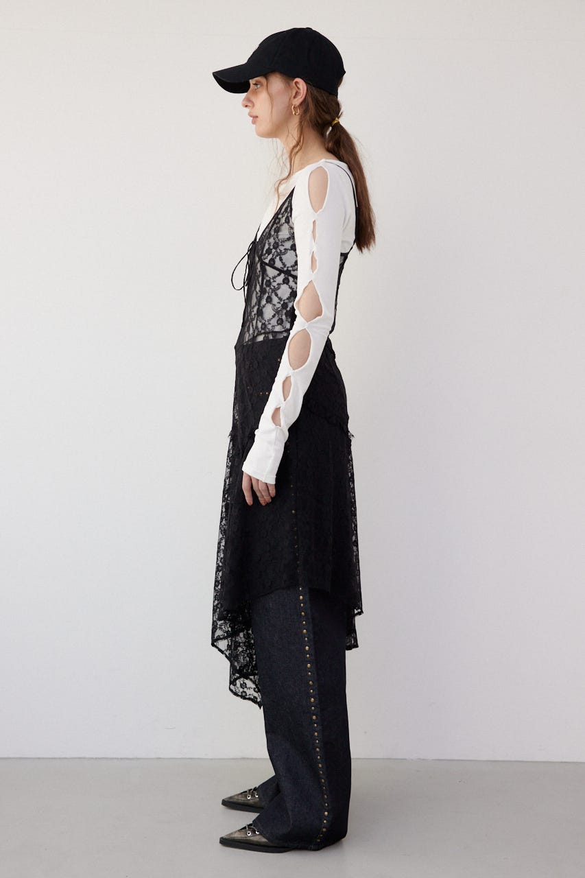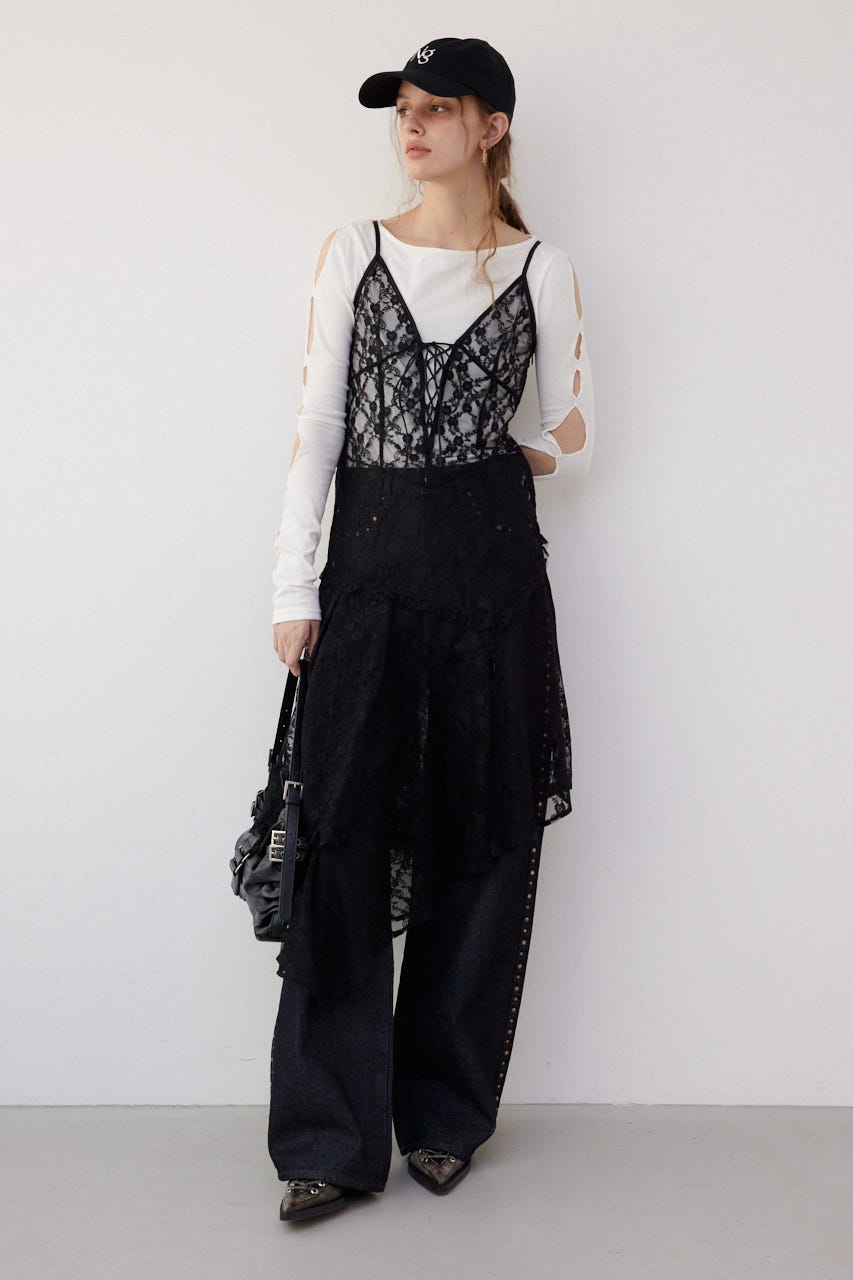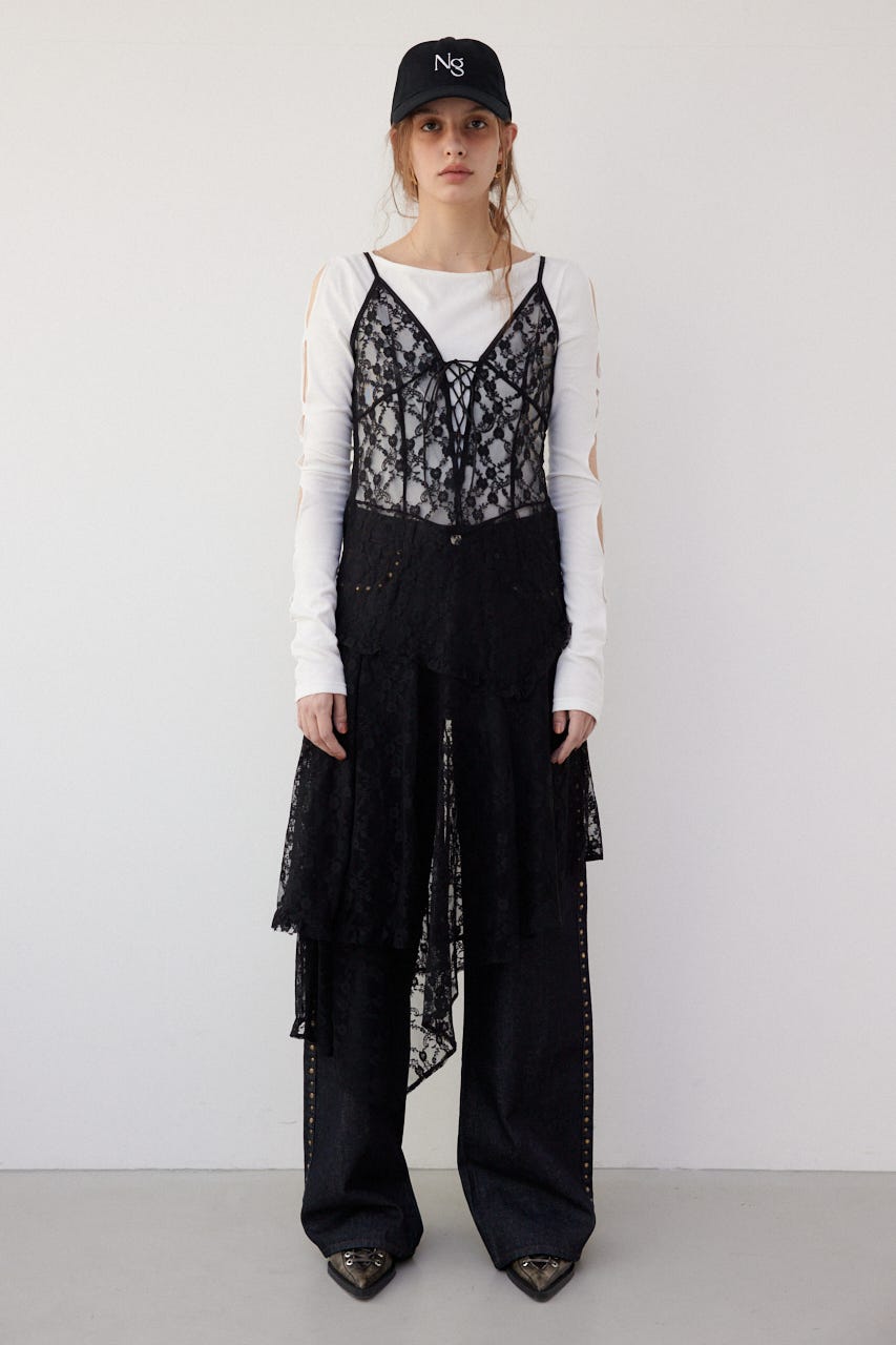 ■DETAIL:コンシールファスナーを開けるとスリットが入るデザインで、フロントのレースアップとアシンメトリーなヘムがポイントです。