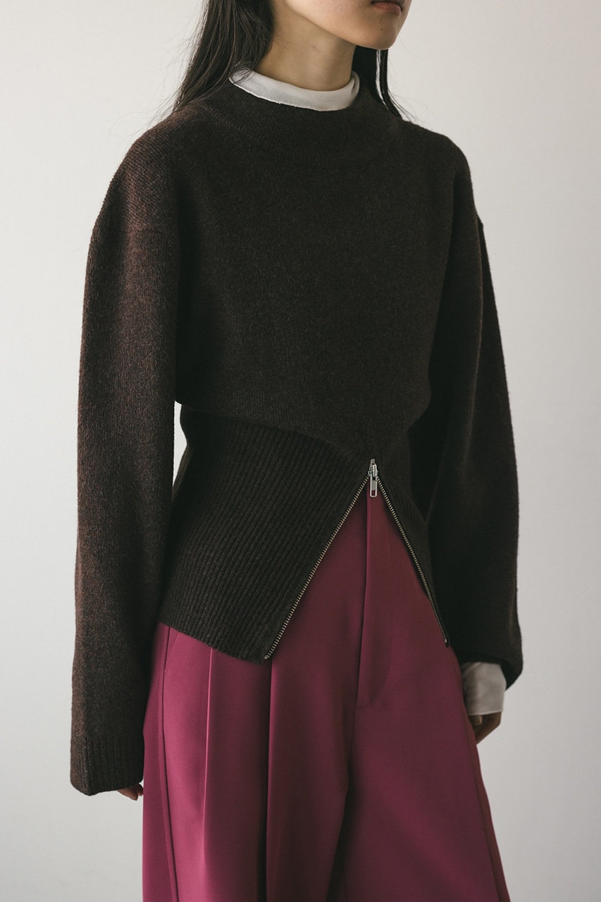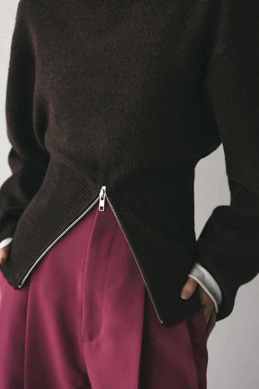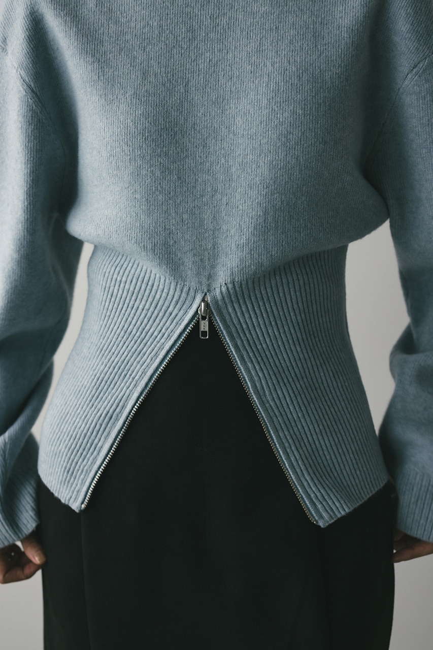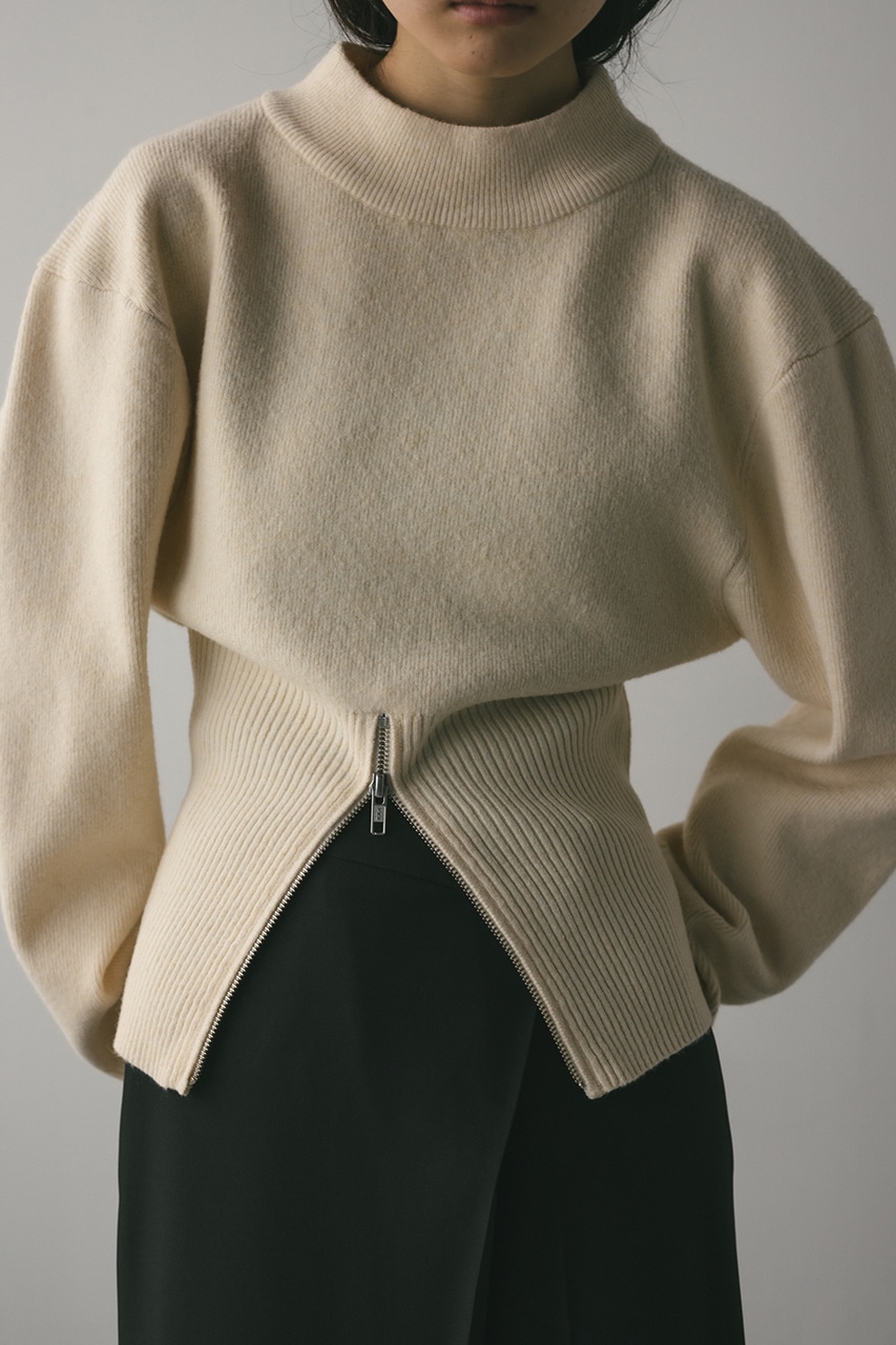 ウエストリブと裾ジップが特徴的なハイネックニット。