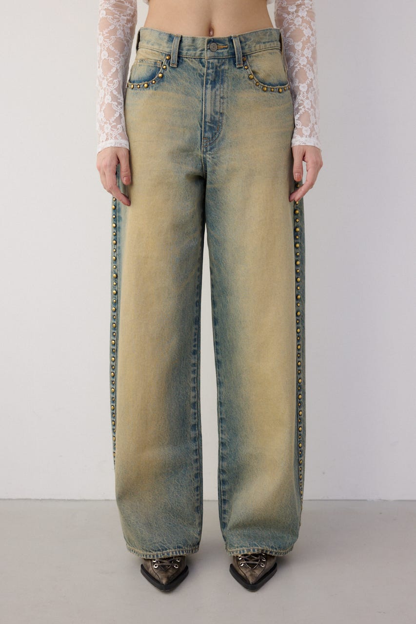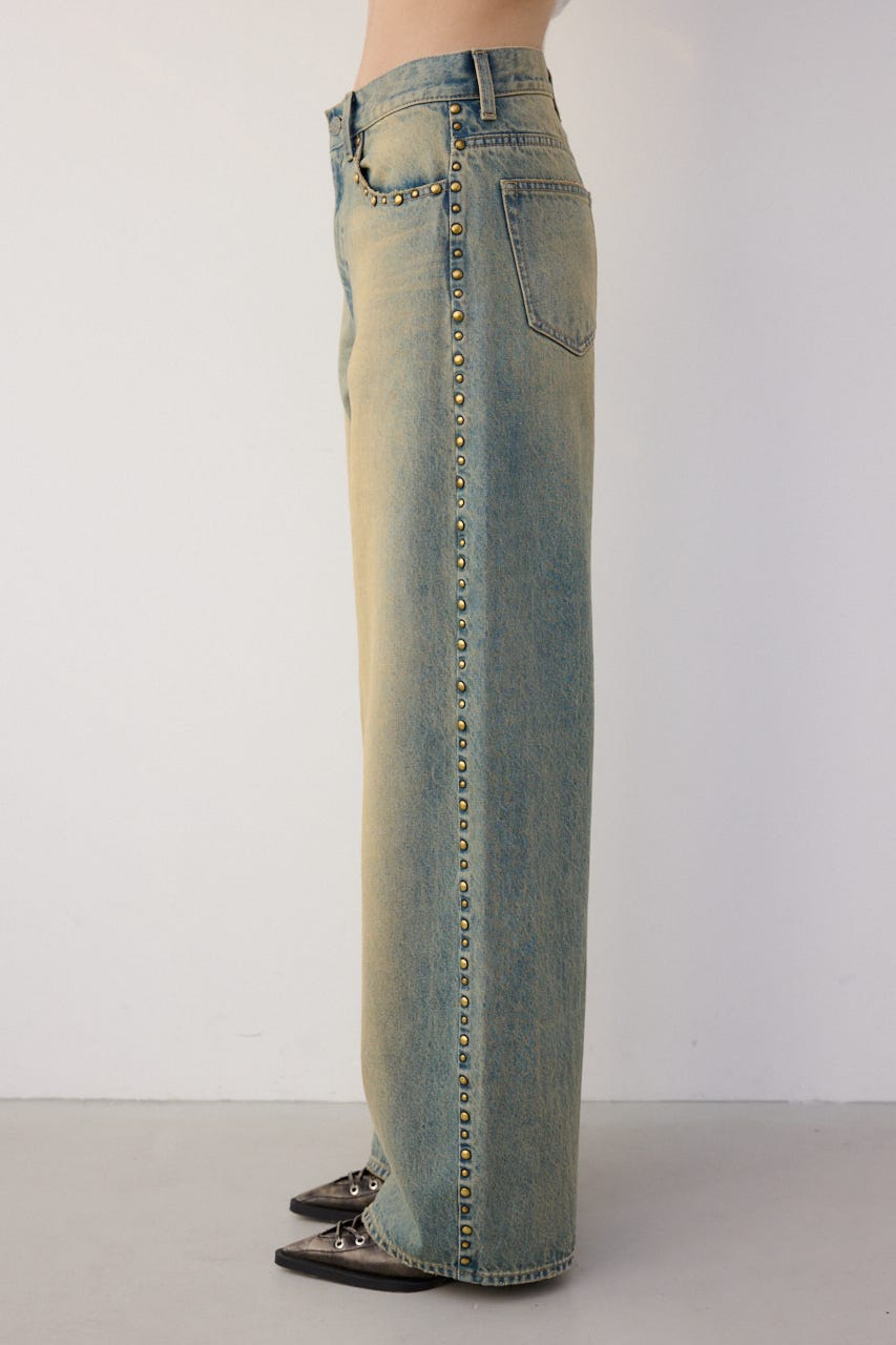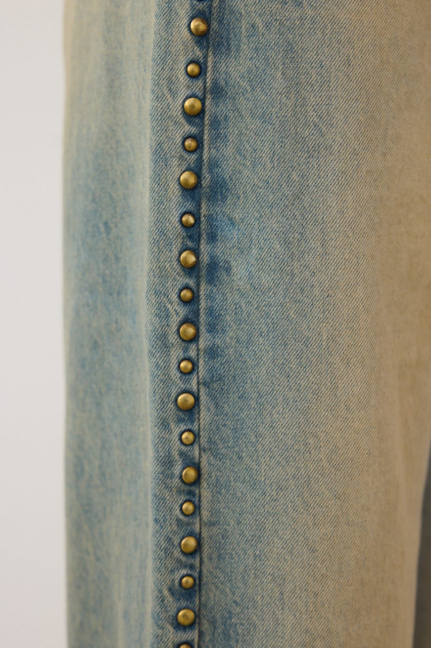 ■DETAIL:オーバーダイ加工を施しているので、ヴィンテージ感漂う色味に仕上げています。程良いルーズなストレートシルエットですが、ジャストウエストなので、すっきりとメリハリのある印象で着用できます。サイドにスタッズデザインを施しているので、一枚でコーディネートのポイントに。
