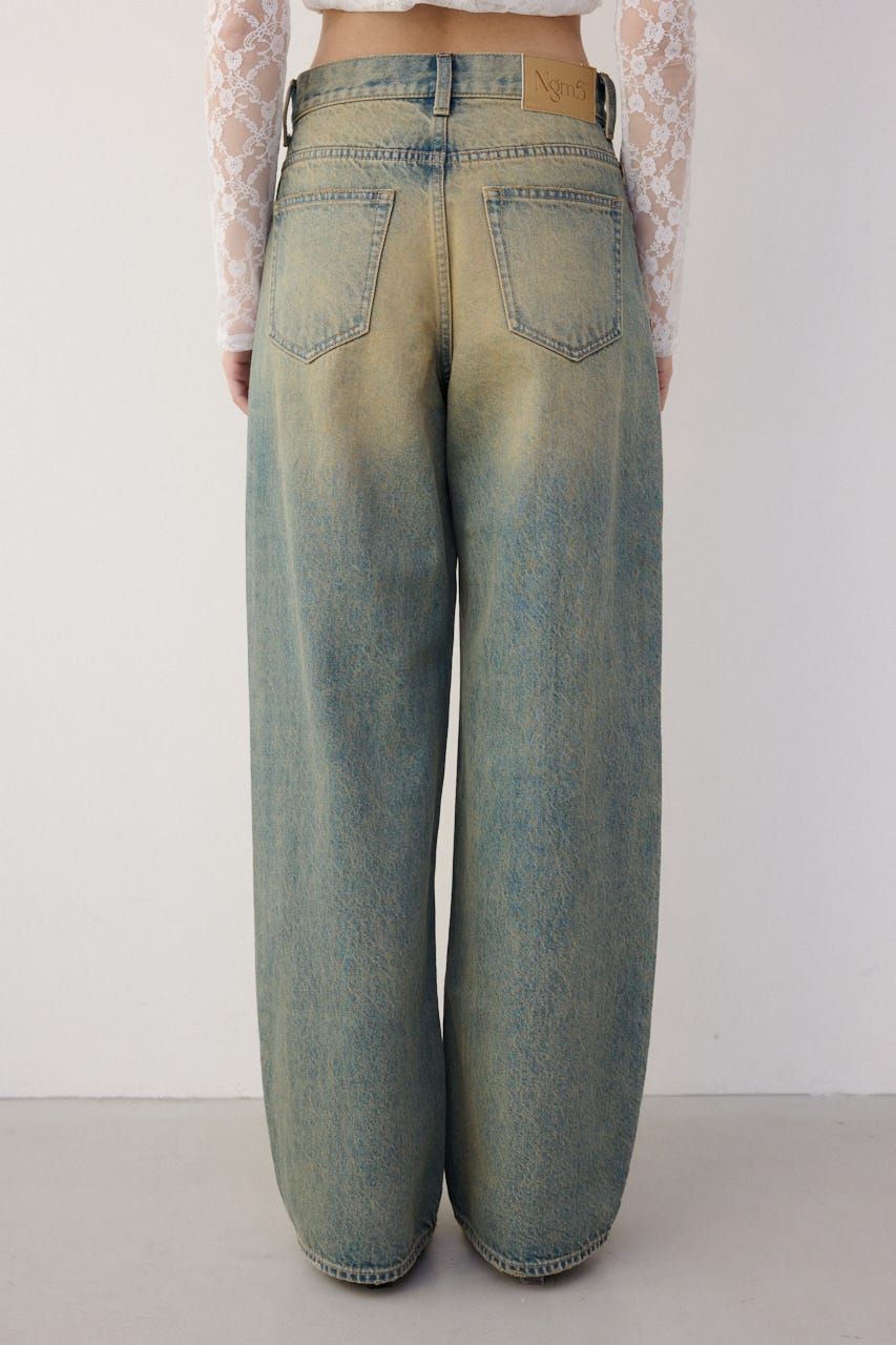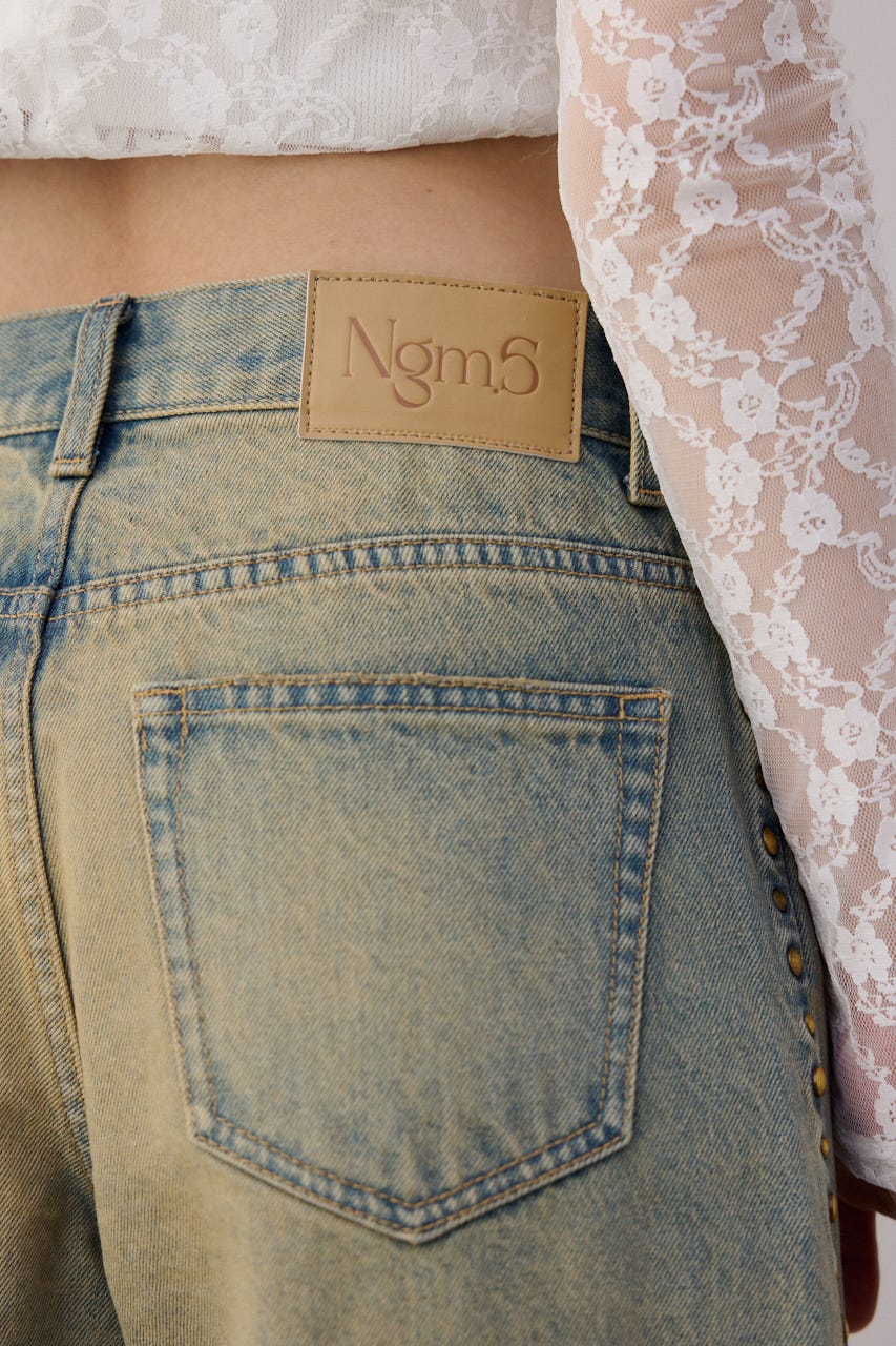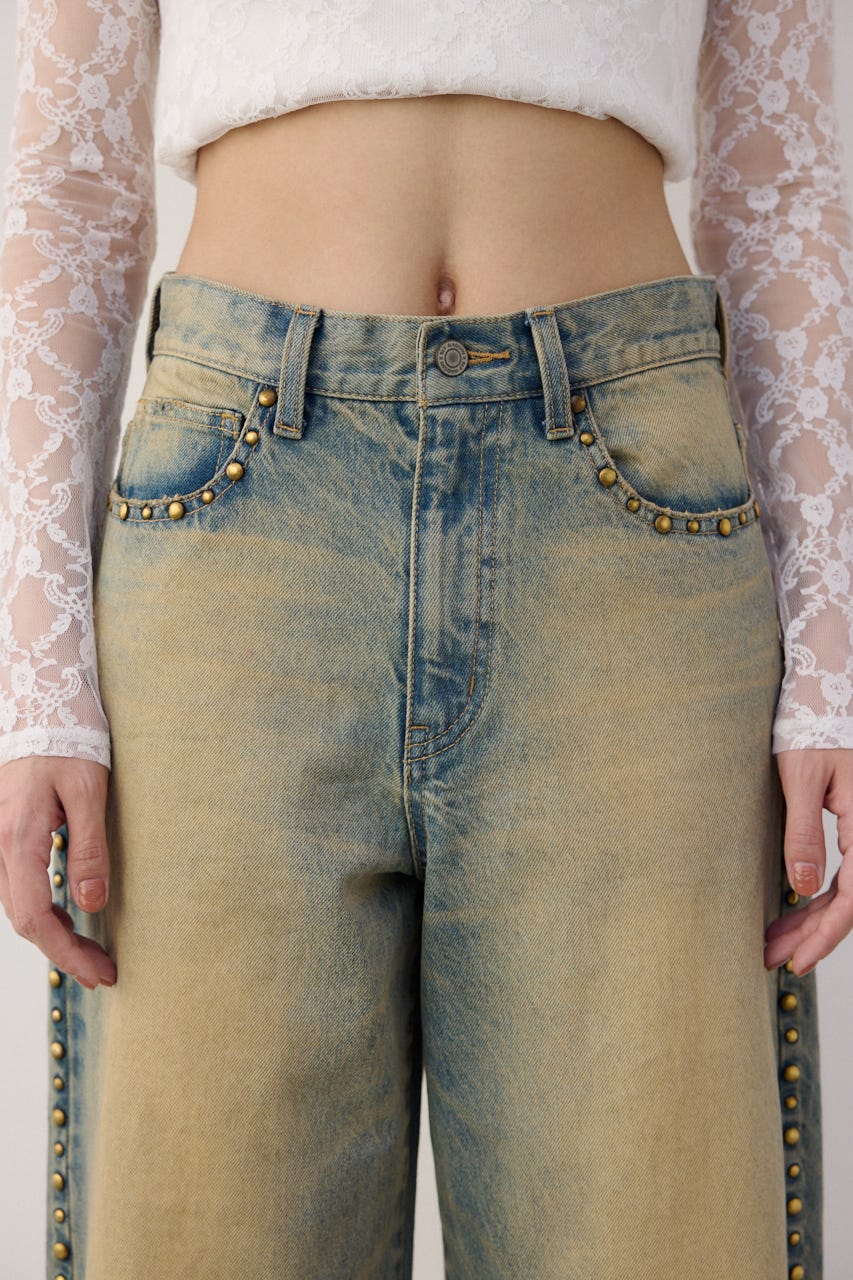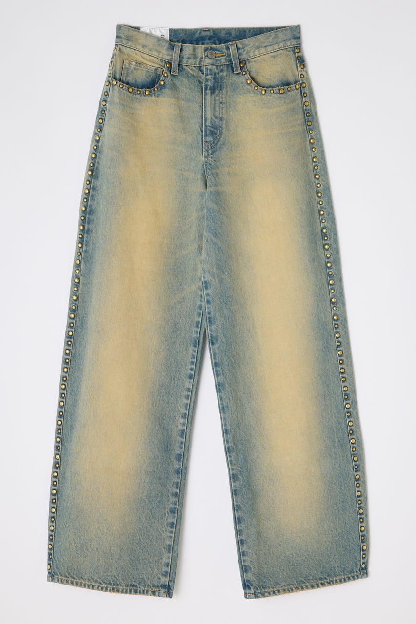■DETAIL:オーバーダイ加工を施しているので、ヴィンテージ感漂う色味に仕上げています。程良いルーズなストレートシルエットですが、ジャストウエストなので、すっきりとメリハリのある印象で着用できます。サイドにスタッズデザインを施しているので、一枚でコーディネートのポイントに。